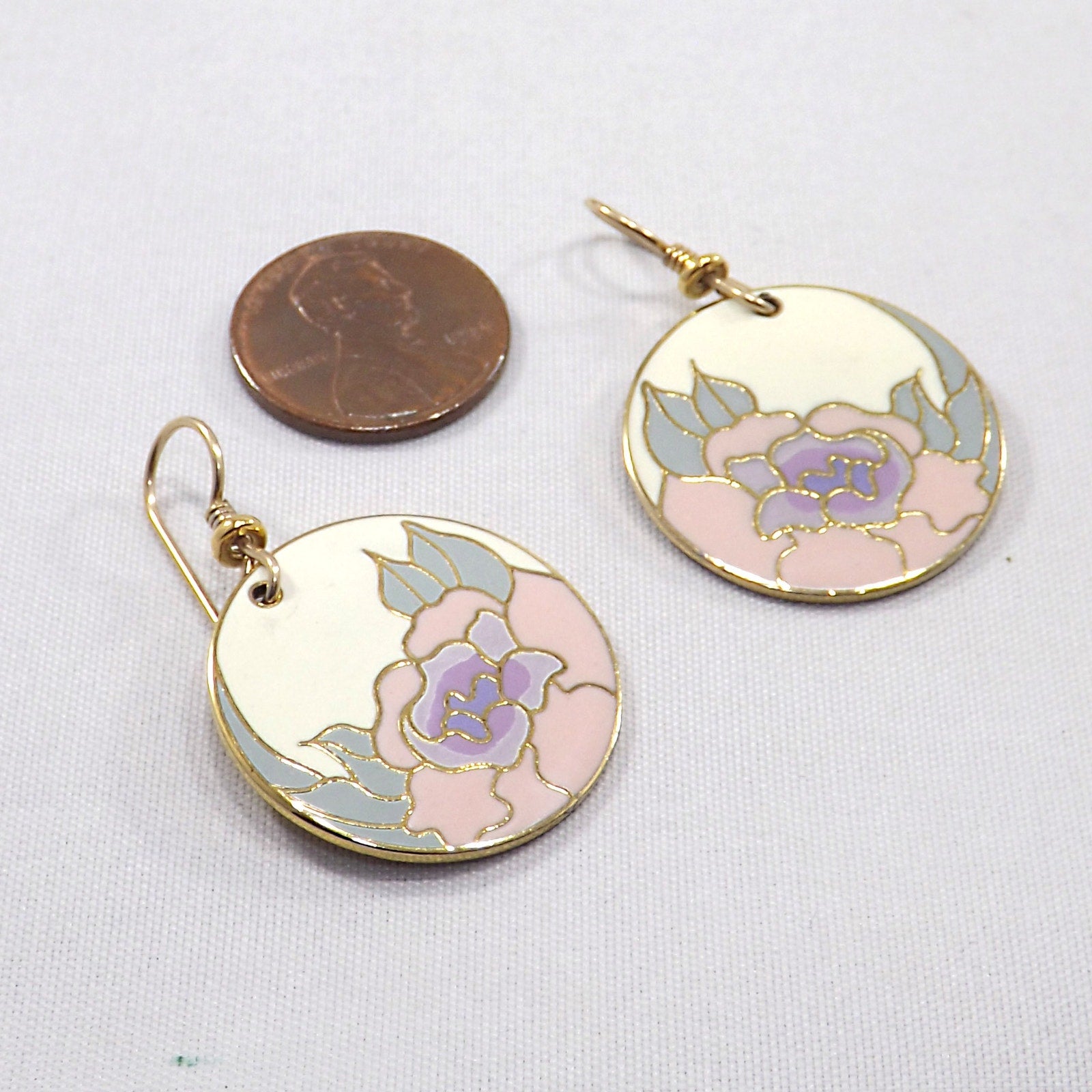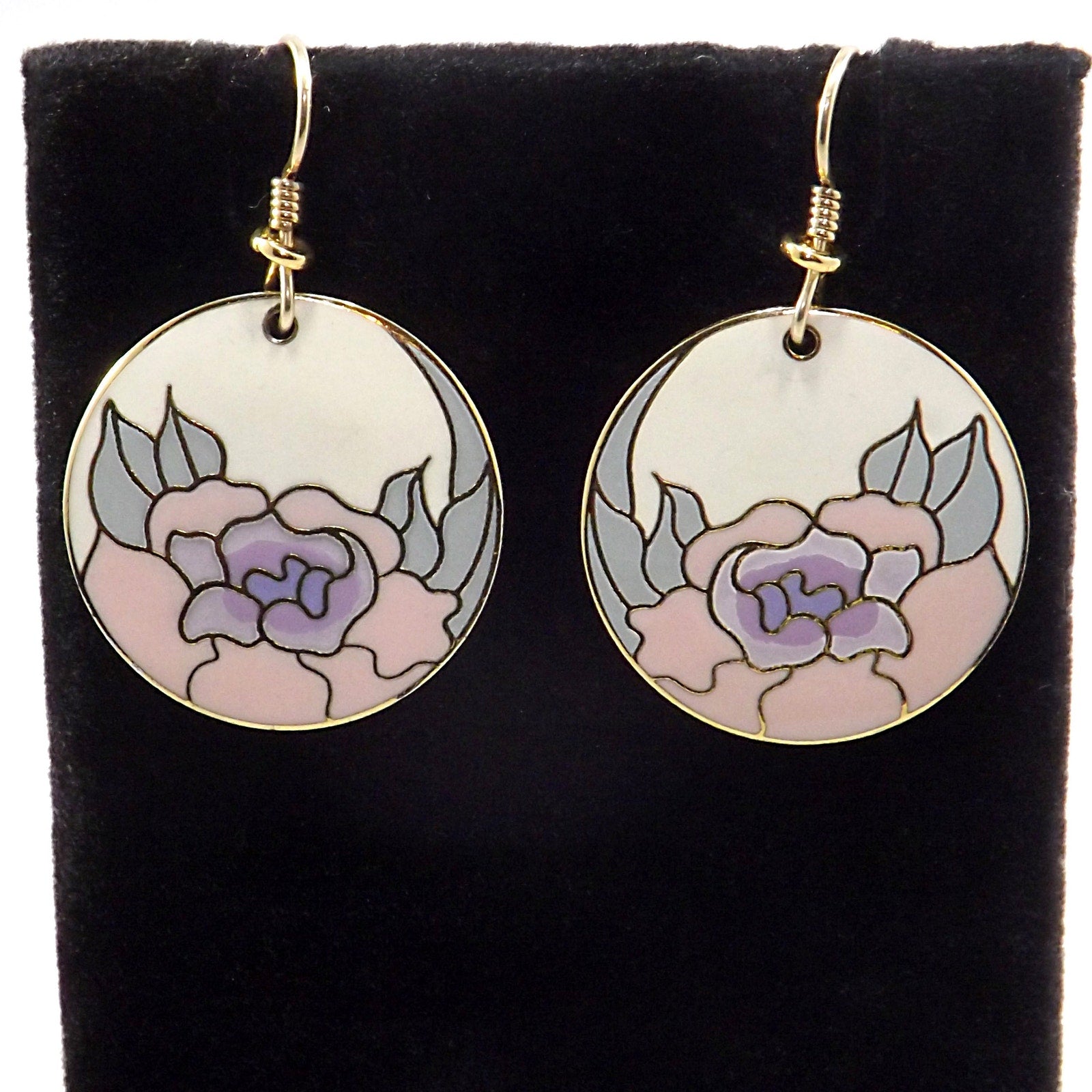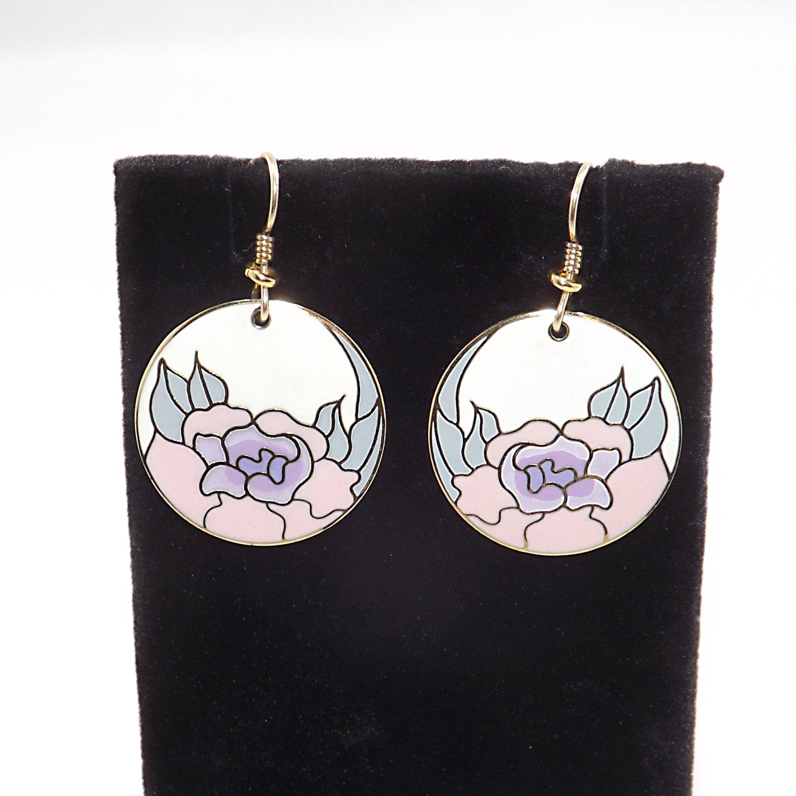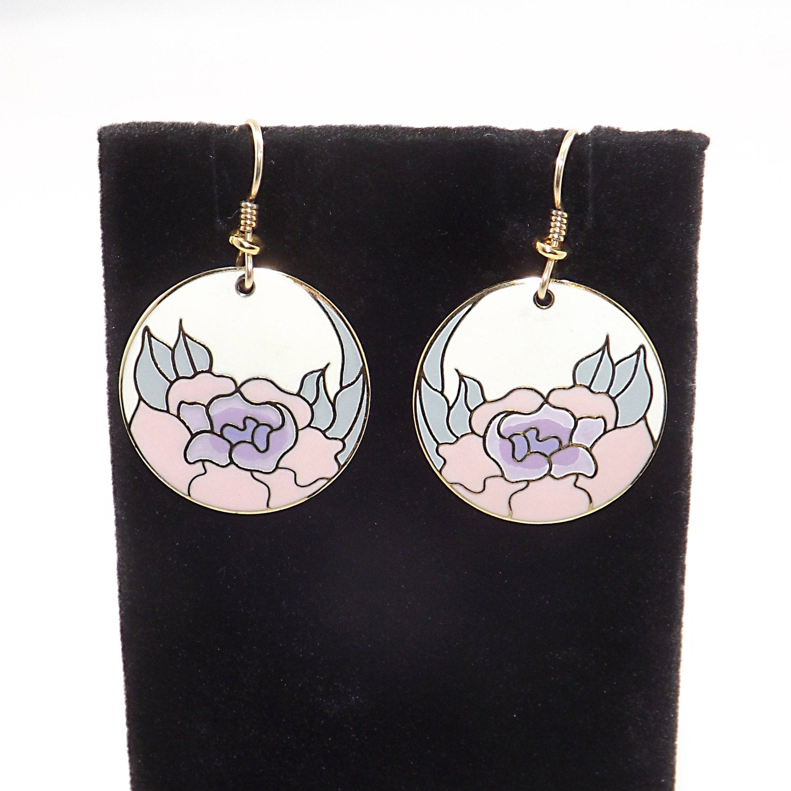 *Description: Vintage Laurel Burch GARDEN ROSE Cloisonné Earrings, circular design, gold plated back and rim with gold filled ear wires. This Vintage Jewelry is from the 1980's and is signed by Laurel Burch on the back, along with the design name Garden Rose. The design inside the gold rim is an off white enamel background, pink flower petals, lavender inside petals with mint green leaves. One of my favorite floral pair of Laurel Burch earrings. Beautiful!