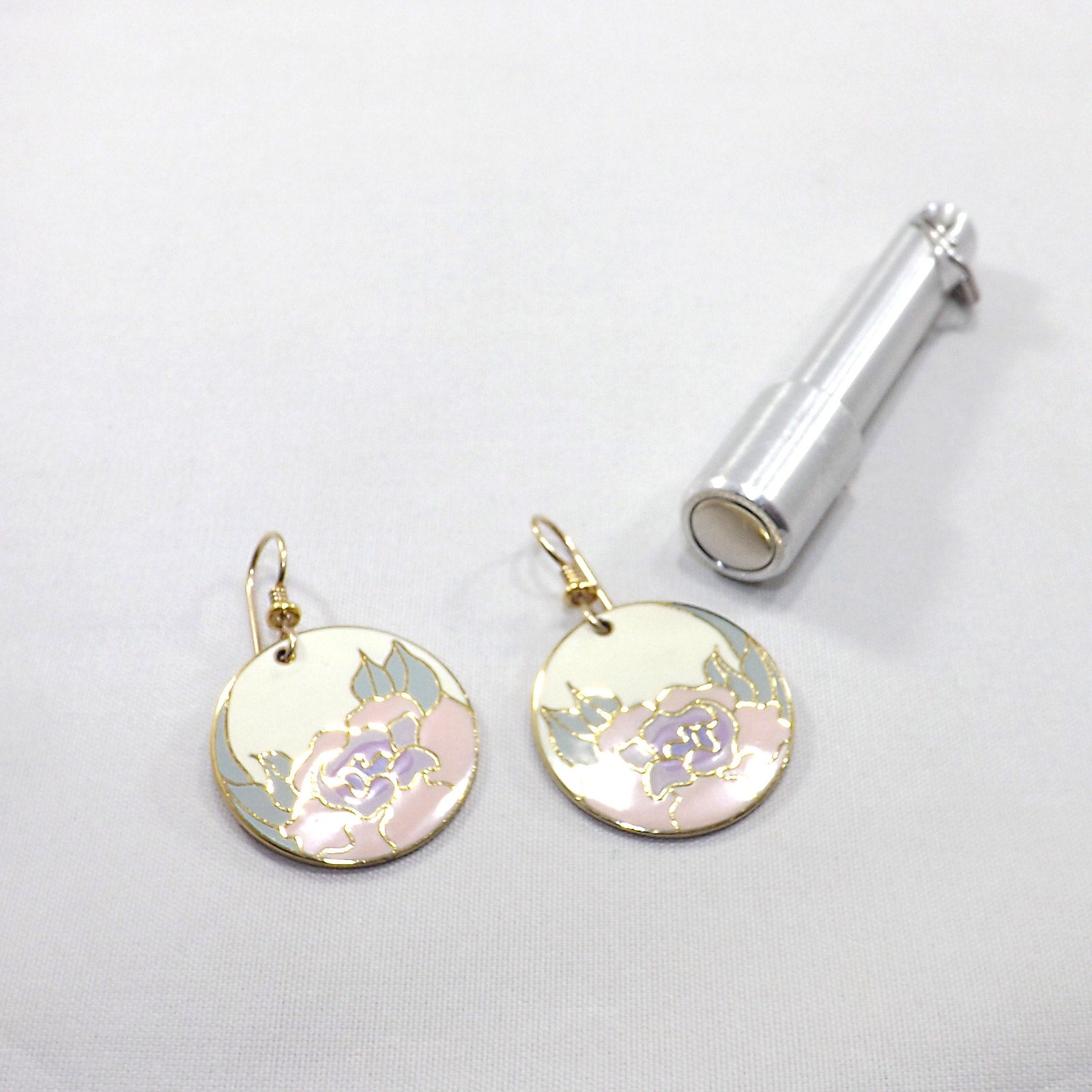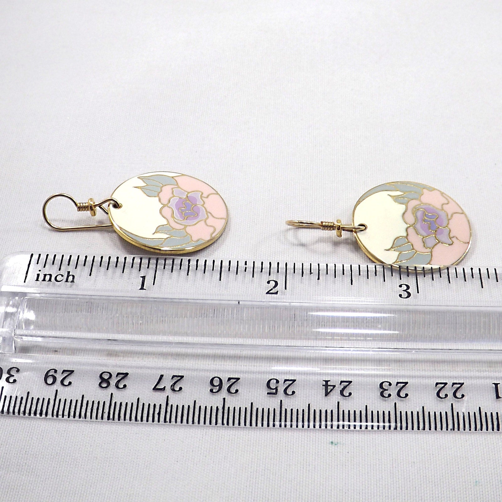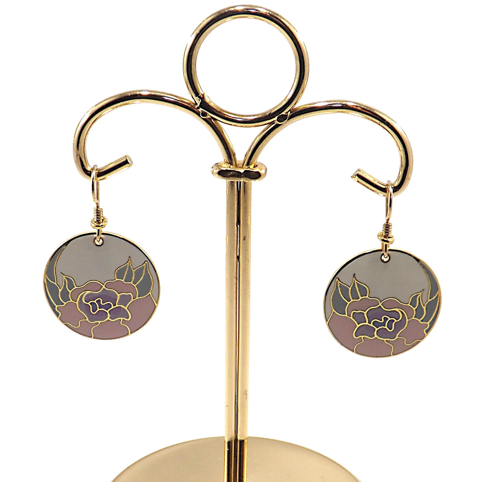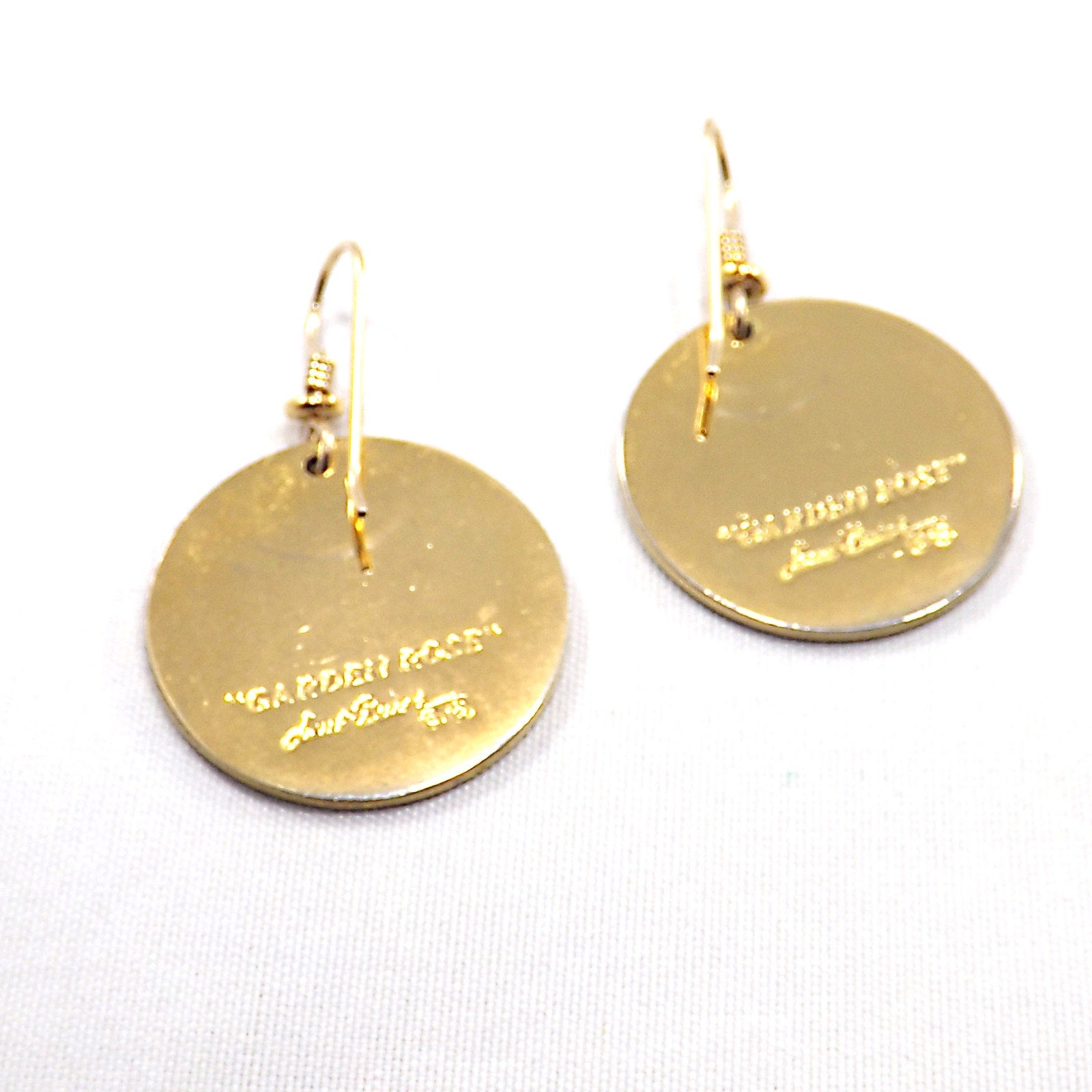*Description: Vintage Laurel Burch GARDEN ROSE Cloisonné Earrings, circular design, gold plated back and rim with gold filled ear wires. This Vintage Jewelry is from the 1980's and is signed by Laurel Burch on the back, along with the design name Garden Rose. The design inside the gold rim is an off white enamel background, pink flower petals, lavender inside petals with mint green leaves. One of my favorite floral pair of Laurel Burch earrings. Beautiful!
