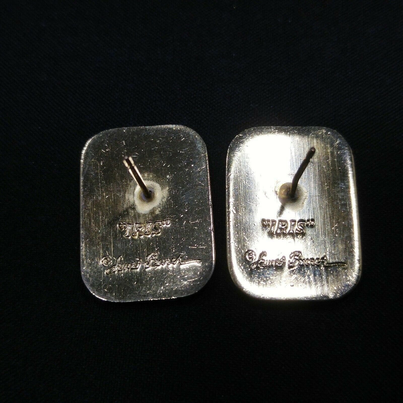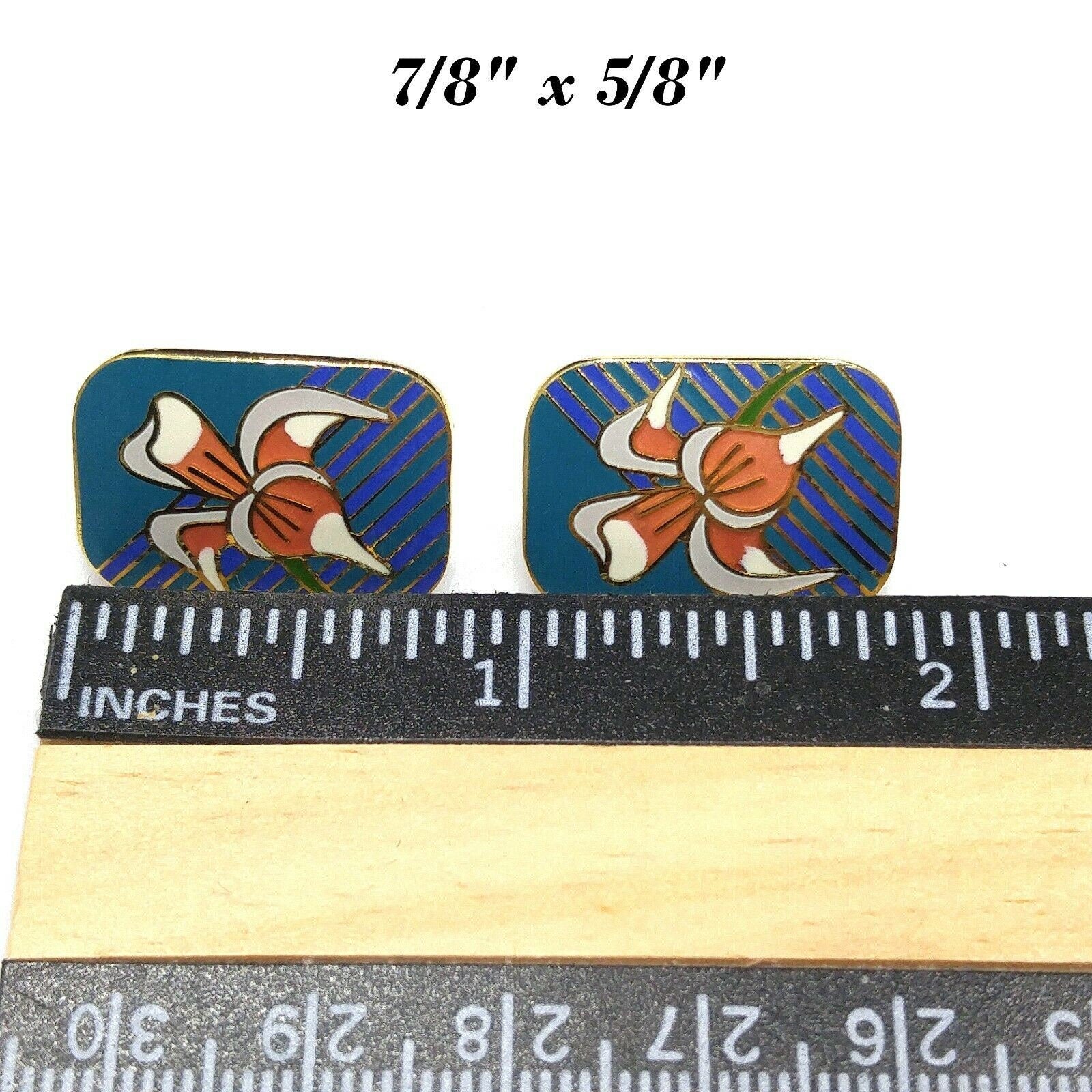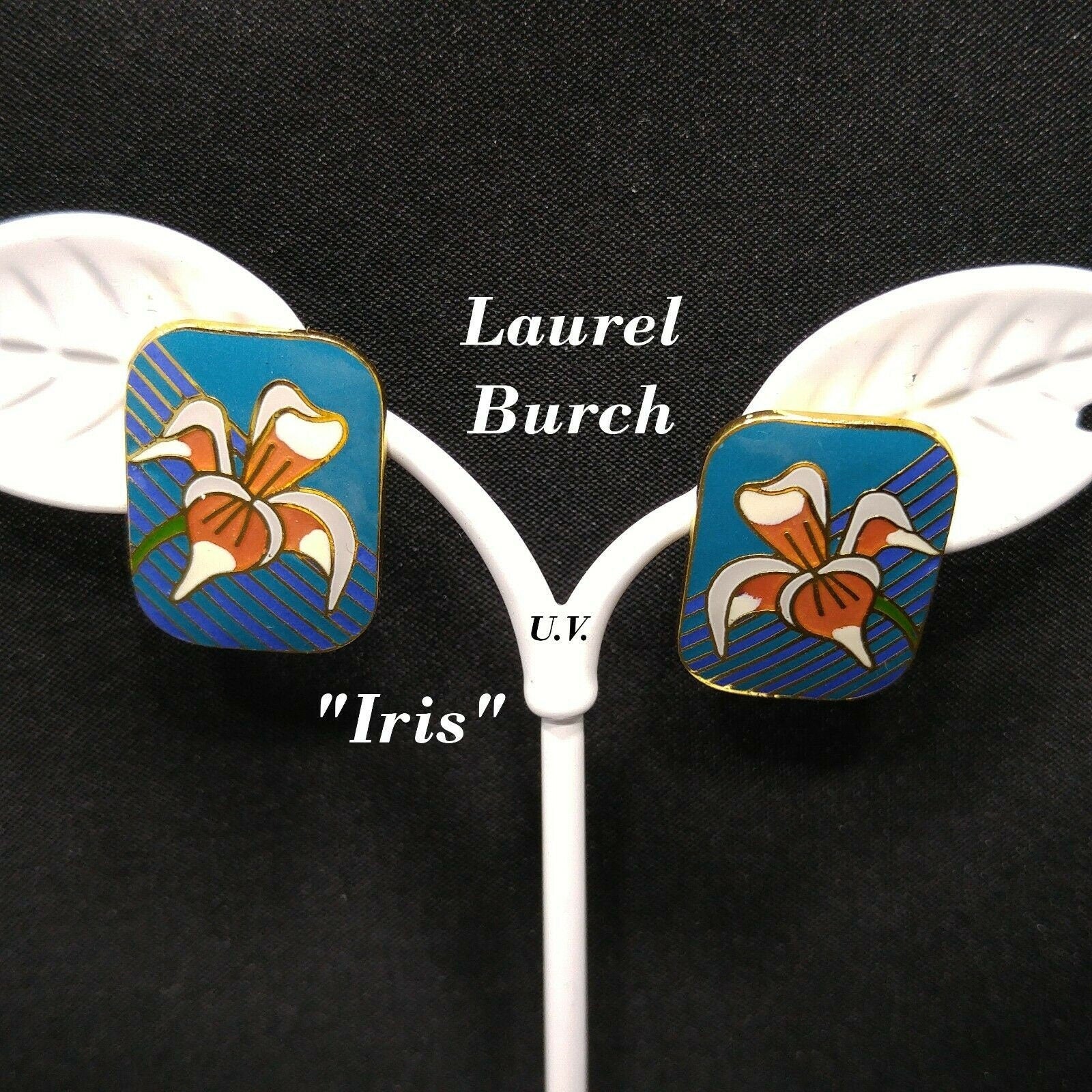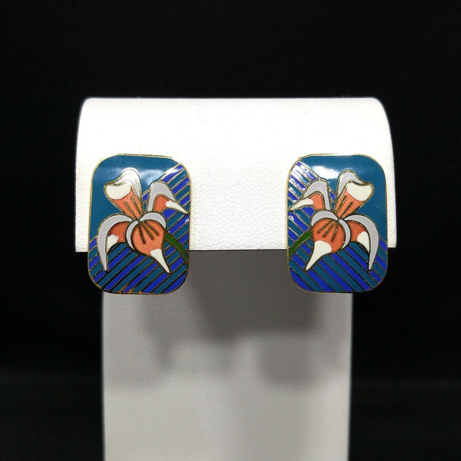 *Description: This is a beautiful pair of Laurel Burch gold plated "Iris" teal green and blue stripe and orange enamel post earrings from the 1980s. The gold plated cloisonne outlines are filled with enamel in teal, gray, white, and orange. This would be a great addition to your vintage jewelry collection or make a great vintage gift!