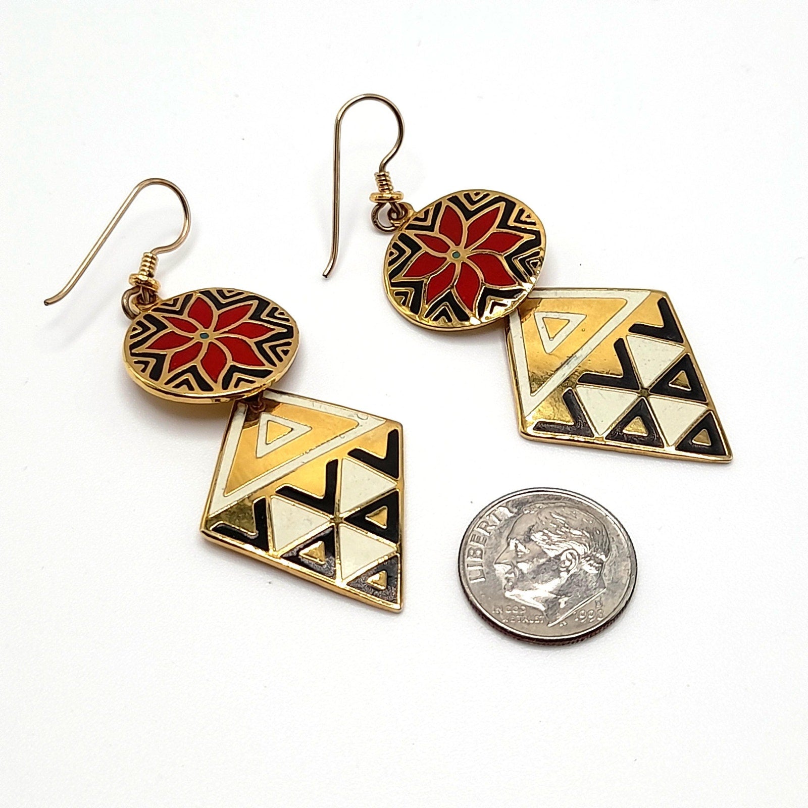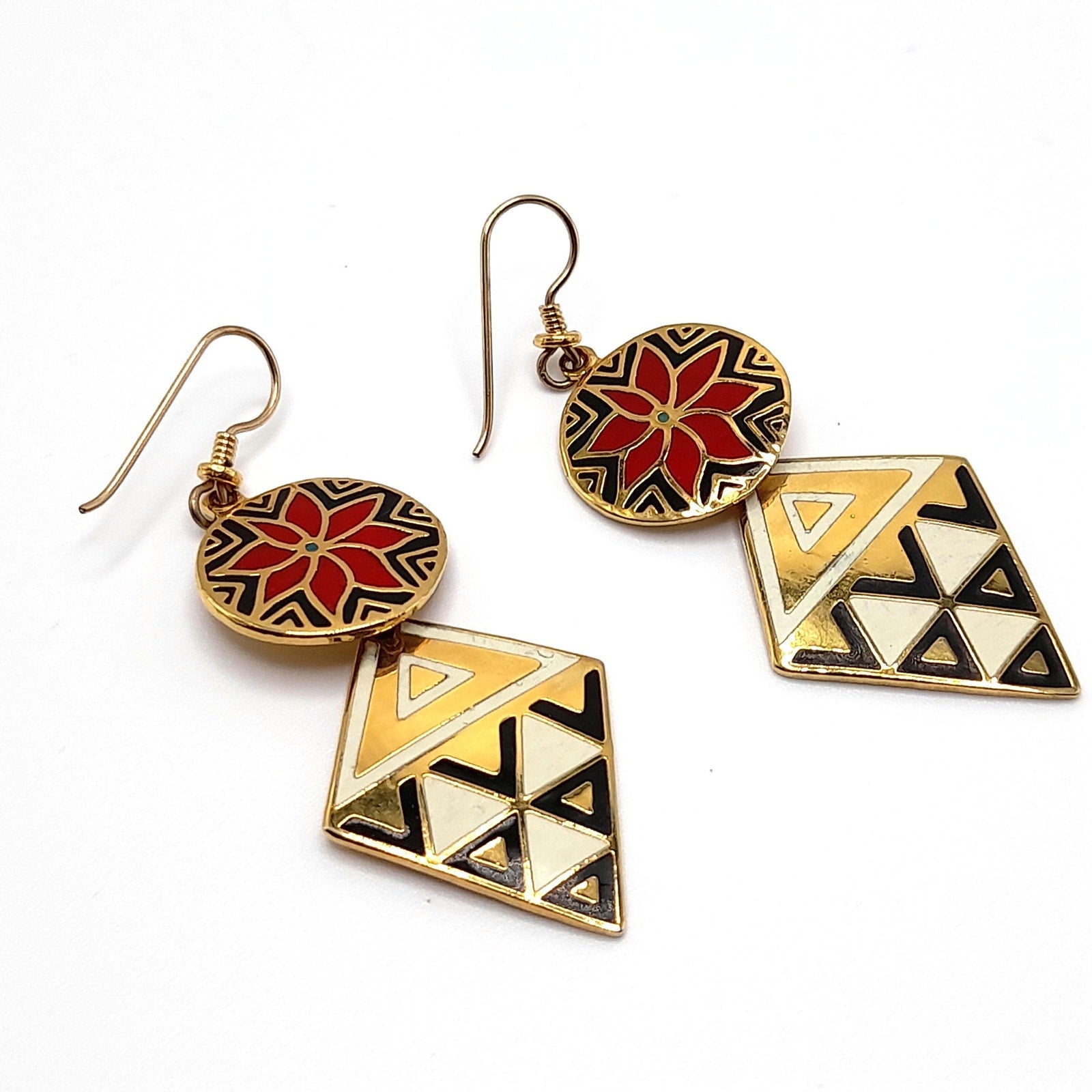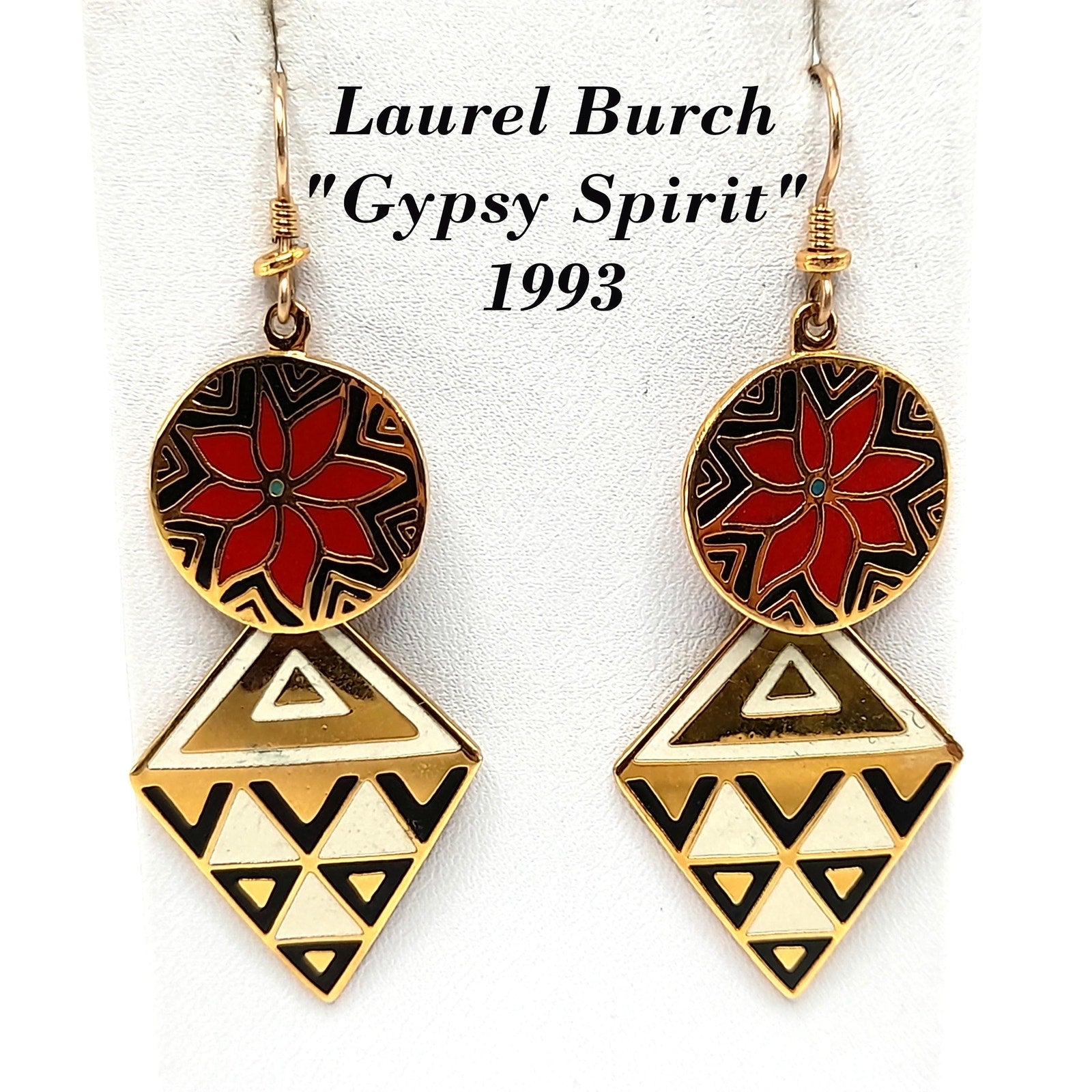 *Description: This is a great pair of Laurel Burch "Gypsy Spirit, 1993" cloisonne earrings in gold plate with ear wires of sterling which are gold filled. The enamel is red, black, and white, with a floral round top which looks like a poinsettia and a geometric second layer dangle. These earrings were still on the paper tag which had a heading of "The Spirit of Womankind". This would be a great addition to your vintage jewelry collection or make a great vintage gift!