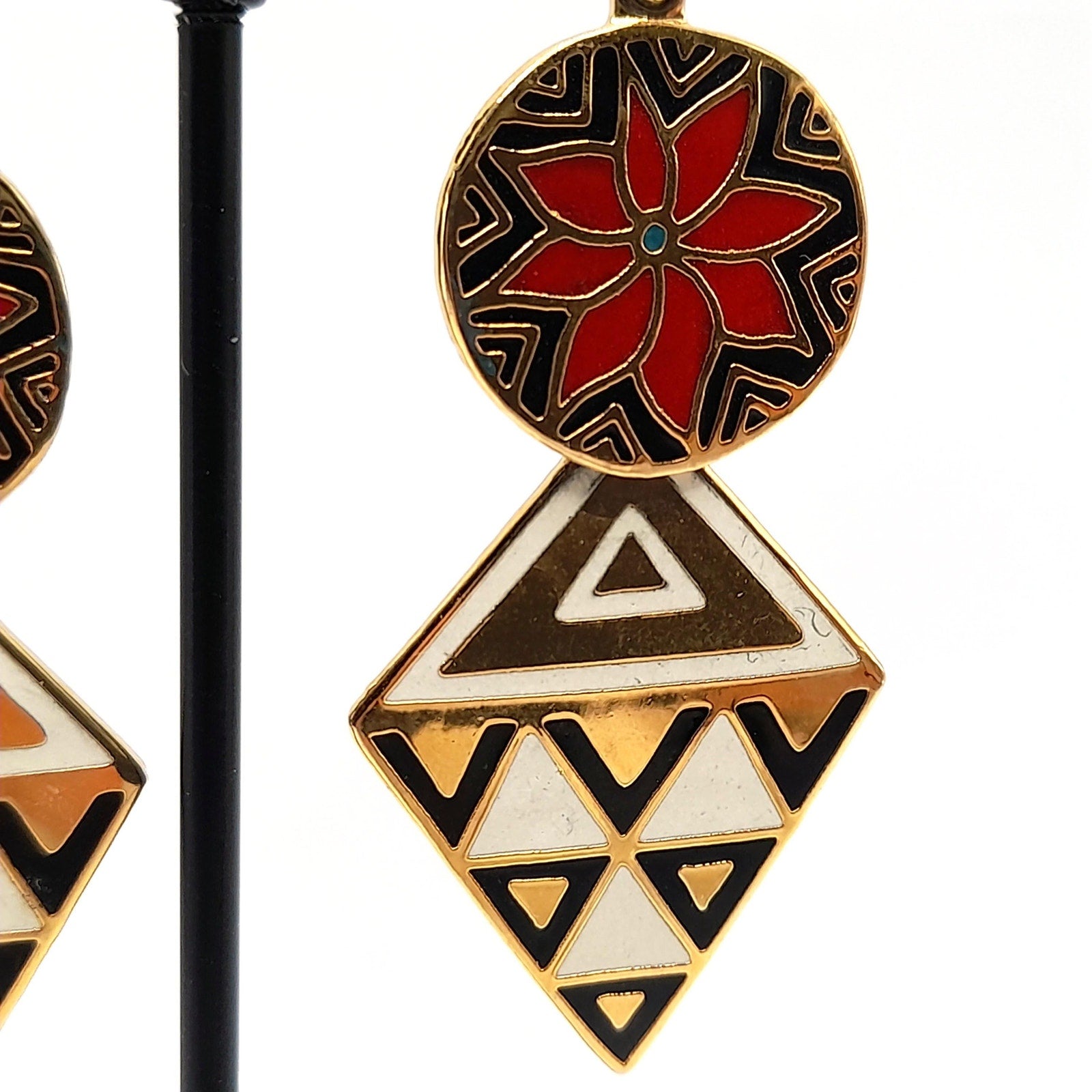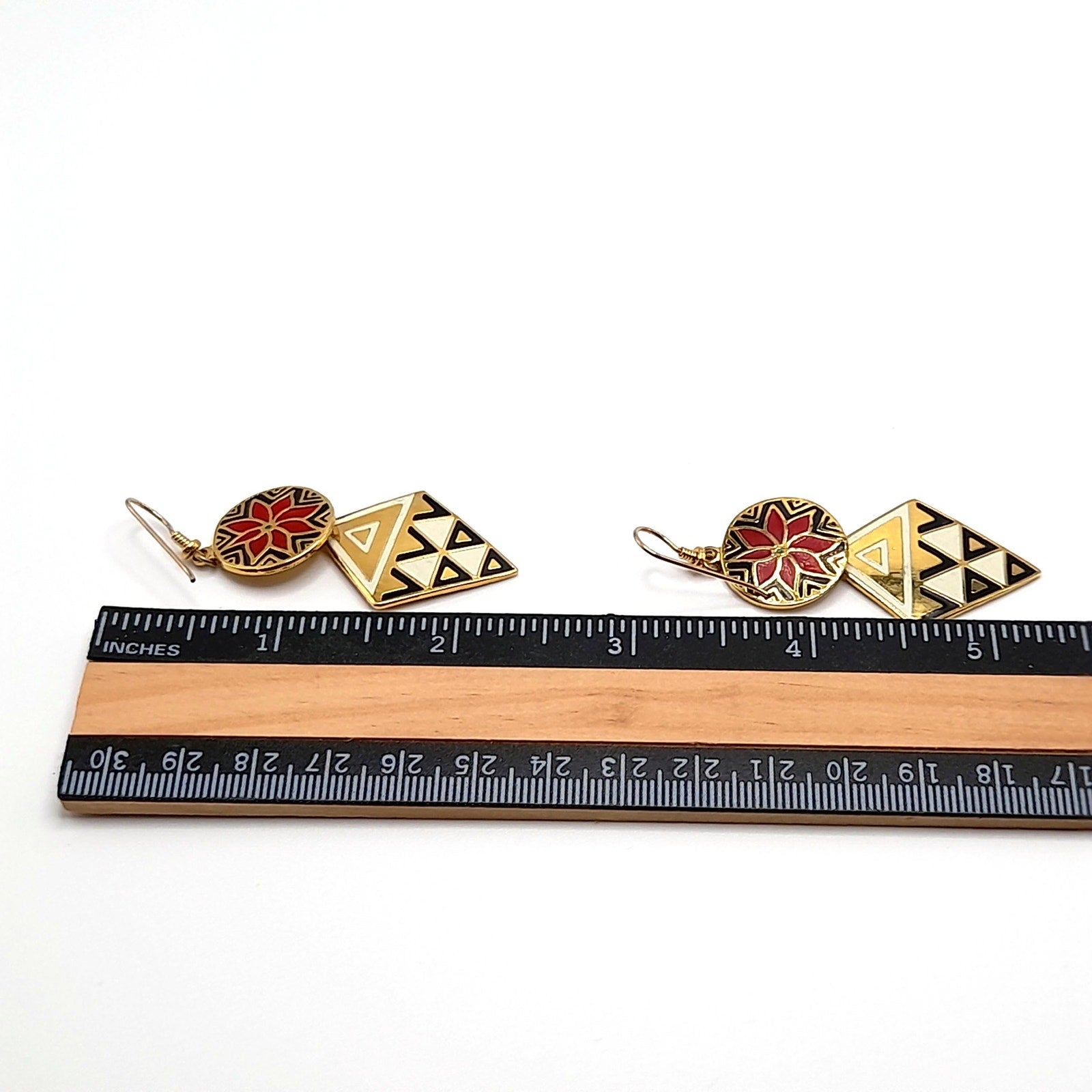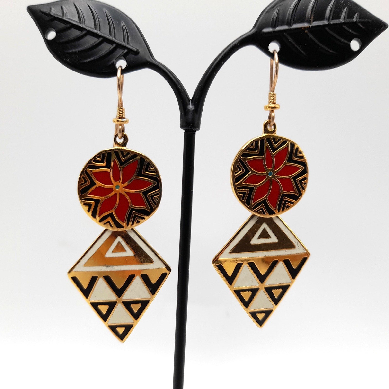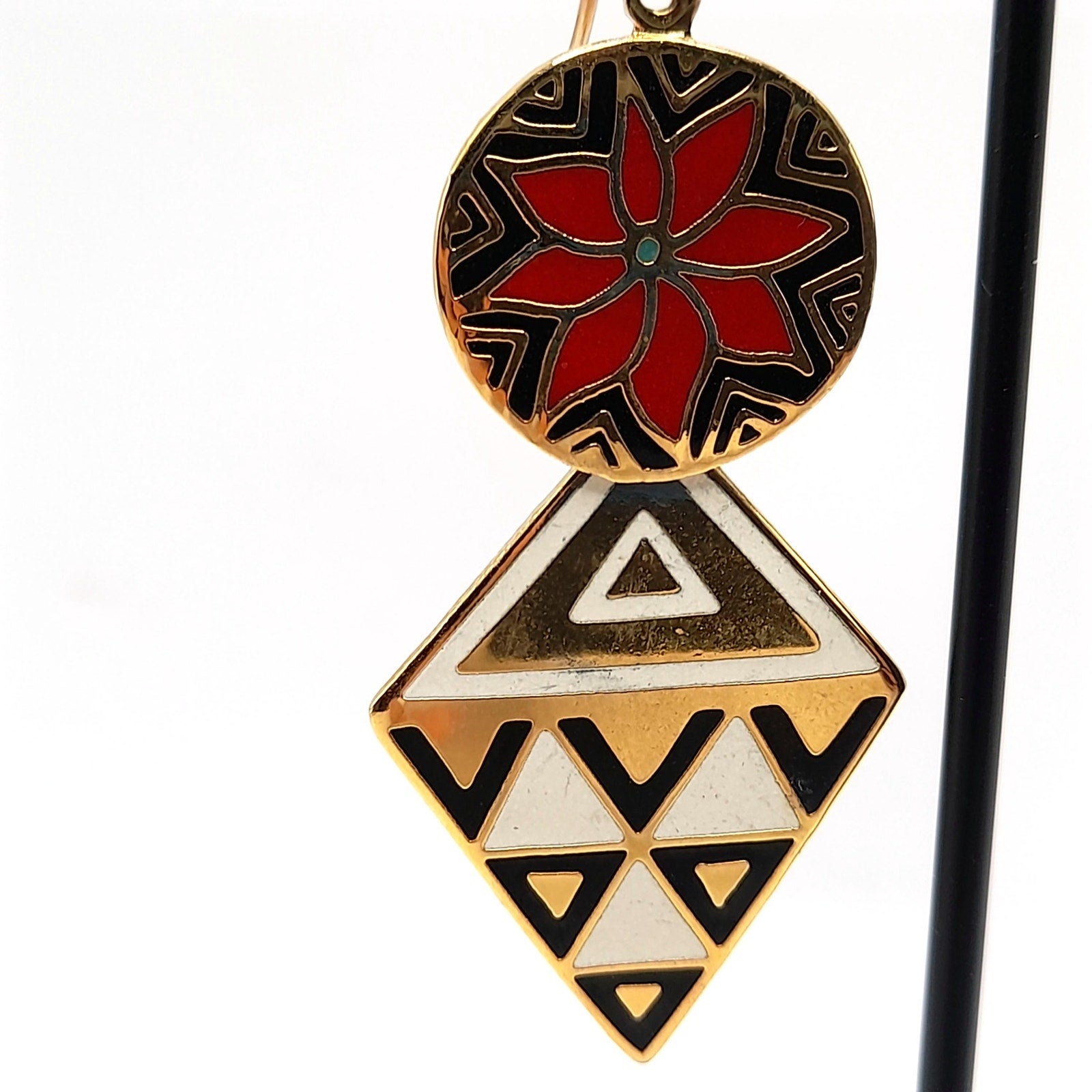 *Description: This is a great pair of Laurel Burch "Gypsy Spirit, 1993" cloisonne earrings in gold plate with ear wires of sterling which are gold filled. The enamel is red, black, and white, with a floral round top which looks like a poinsettia and a geometric second layer dangle. These earrings were still on the paper tag which had a heading of "The Spirit of Womankind". This would be a great addition to your vintage jewelry collection or make a great vintage gift!