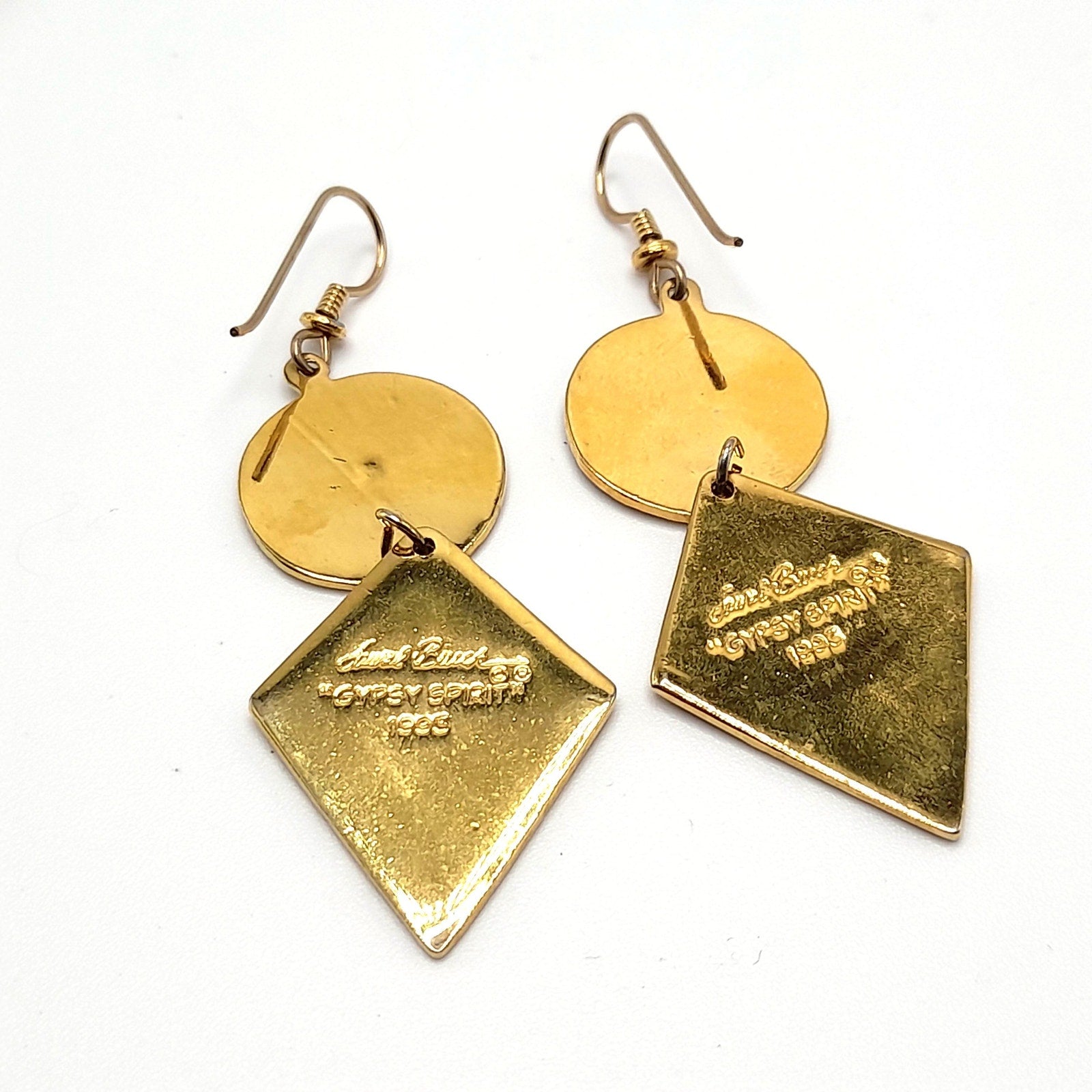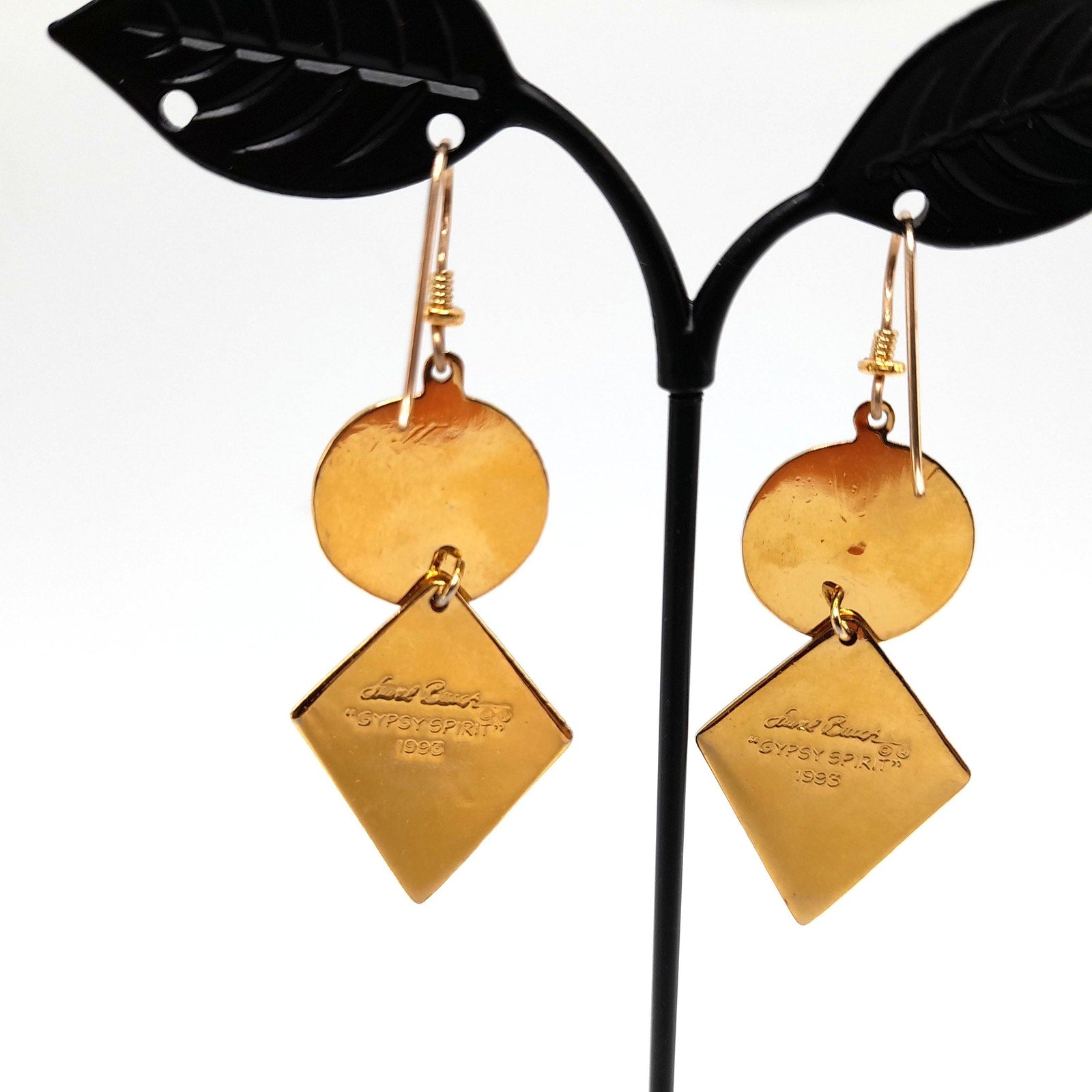 Laurel Burch "Gypsy Spirit 1993" Long Earrings, Gold Plated, GF Ear Wires, 1990s Vintage Jewelry