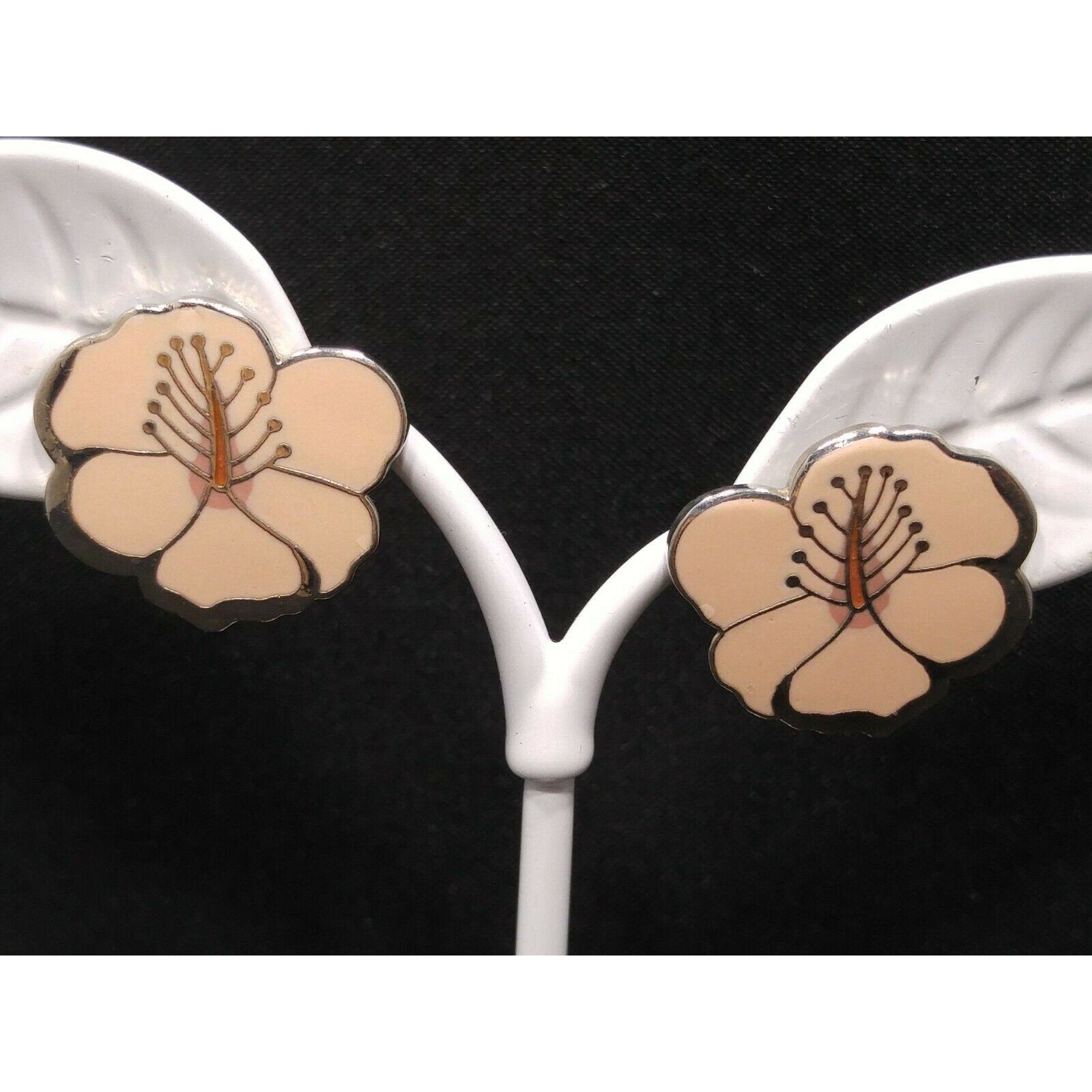 *Description: This is a beautiful vintage pair of Laurel Burch hibiscus light pink enamel cloisonne post earrings from the 1980s. The earrings are rhodium plated and silver in tone. The designer signature, LAUREL BURCH, and design's name, HIBISCUS, is on the back of each earring. The cloisonne technique uses the rhodium plated outline with most of the enamel in light pink. The center has light peach and orange enamel around the silver stamen. This would be a great addition to your vintage jewelry collection or make a great vintage gift!