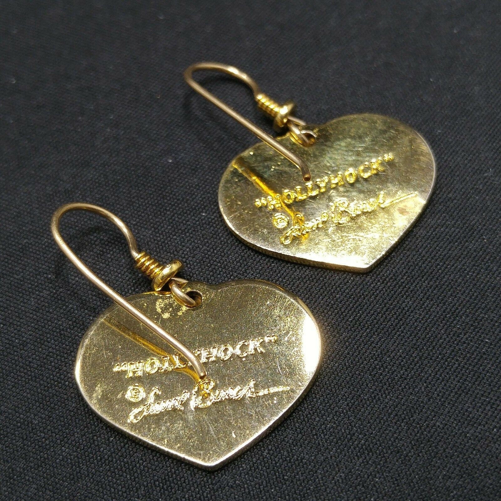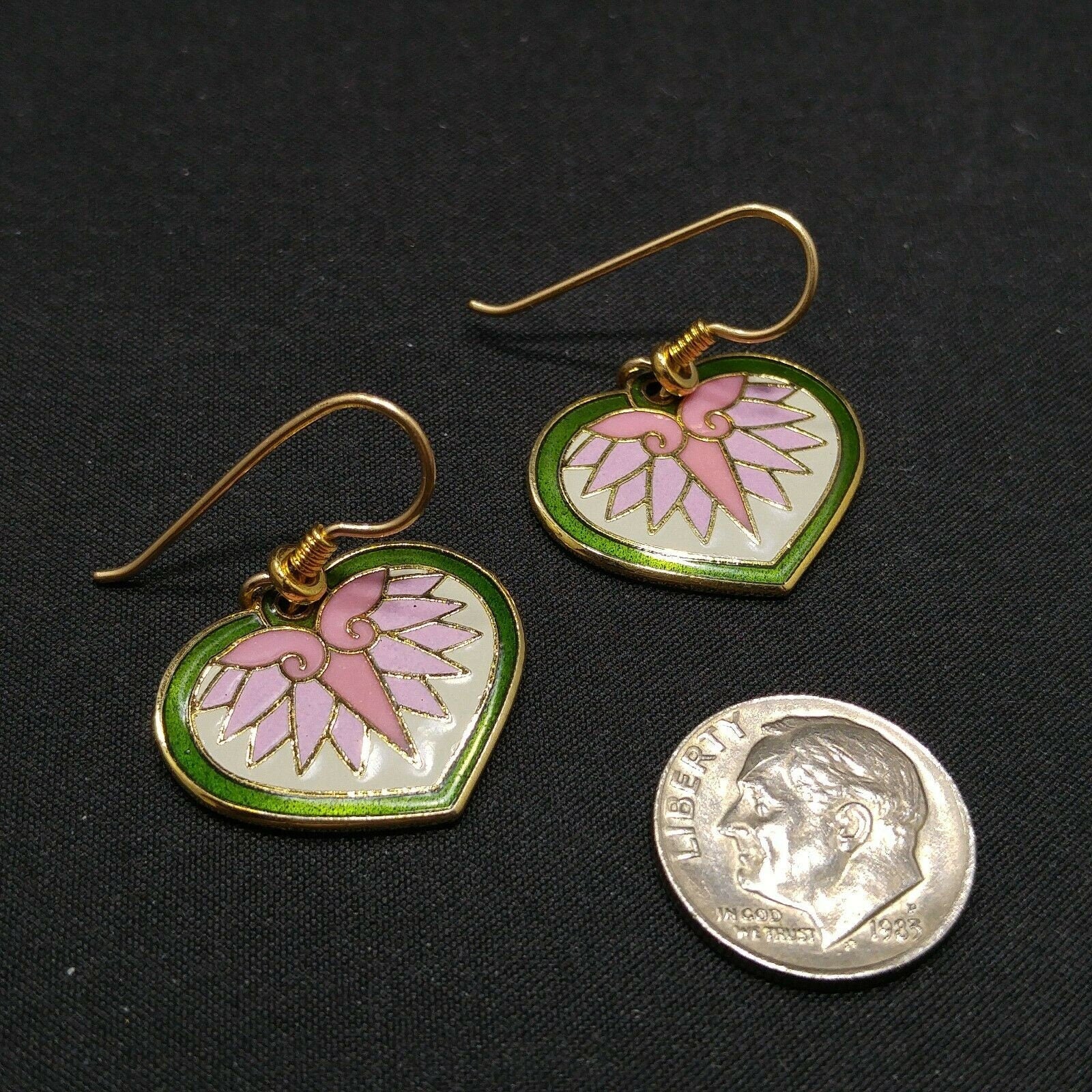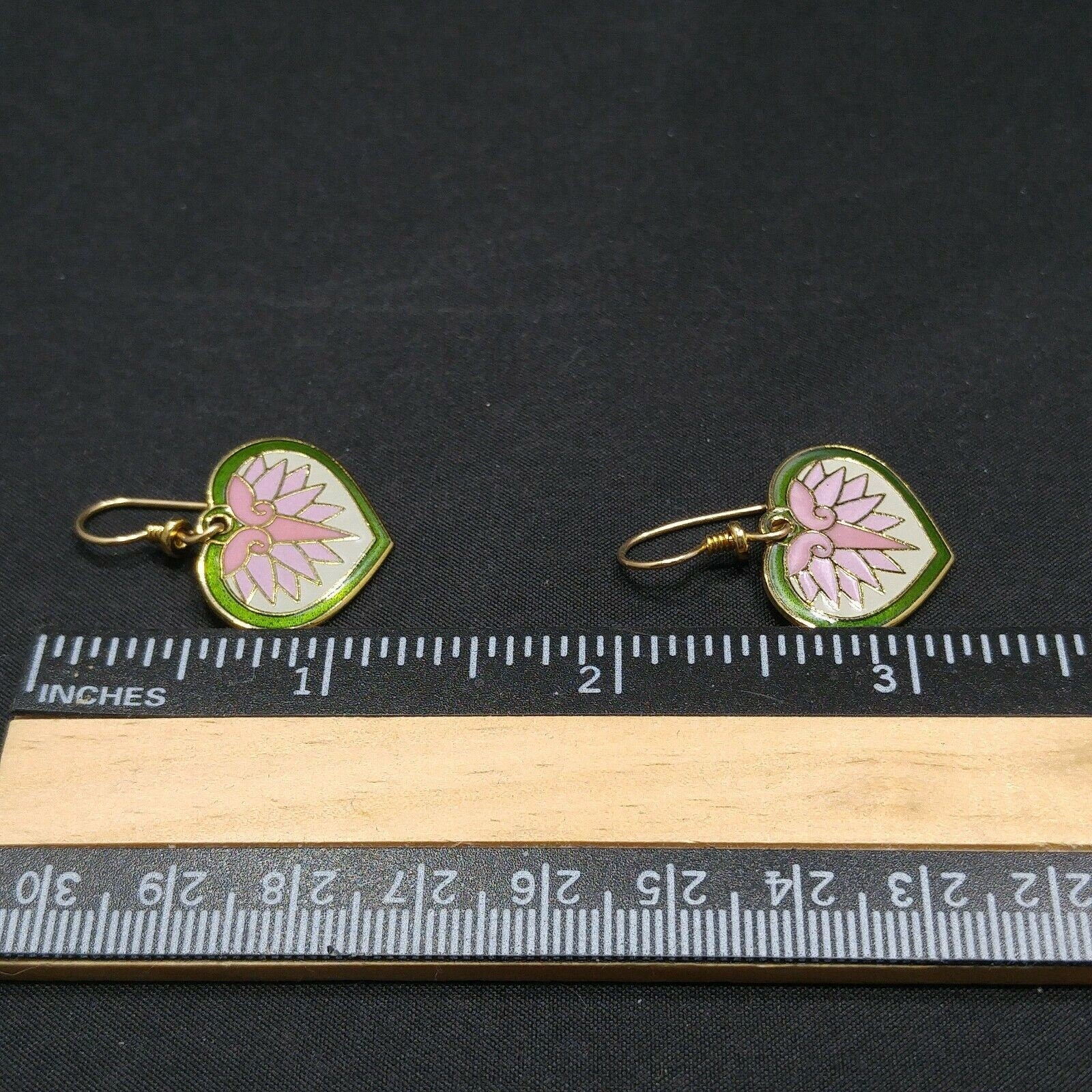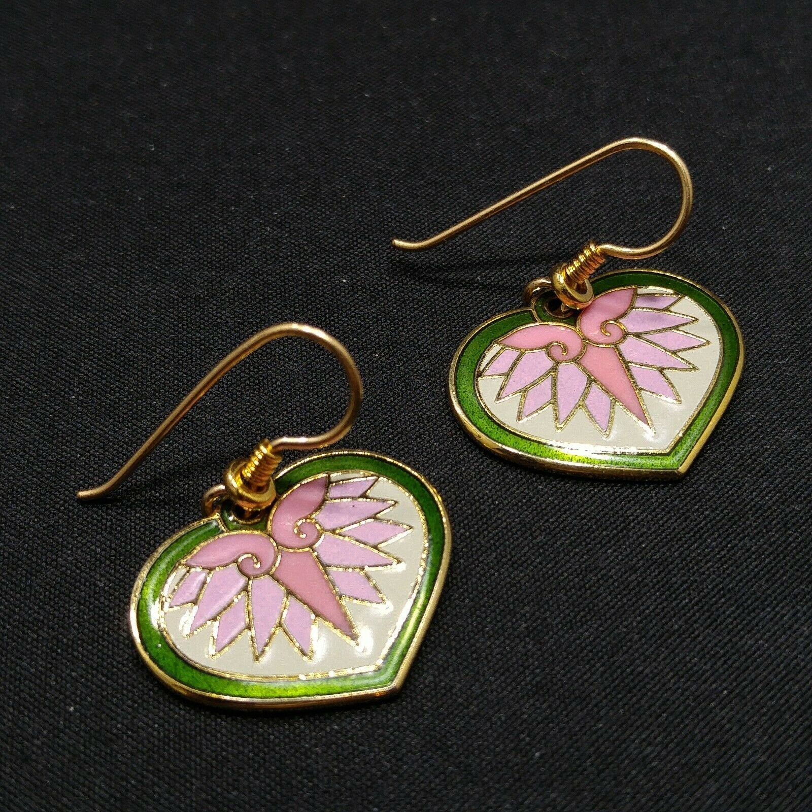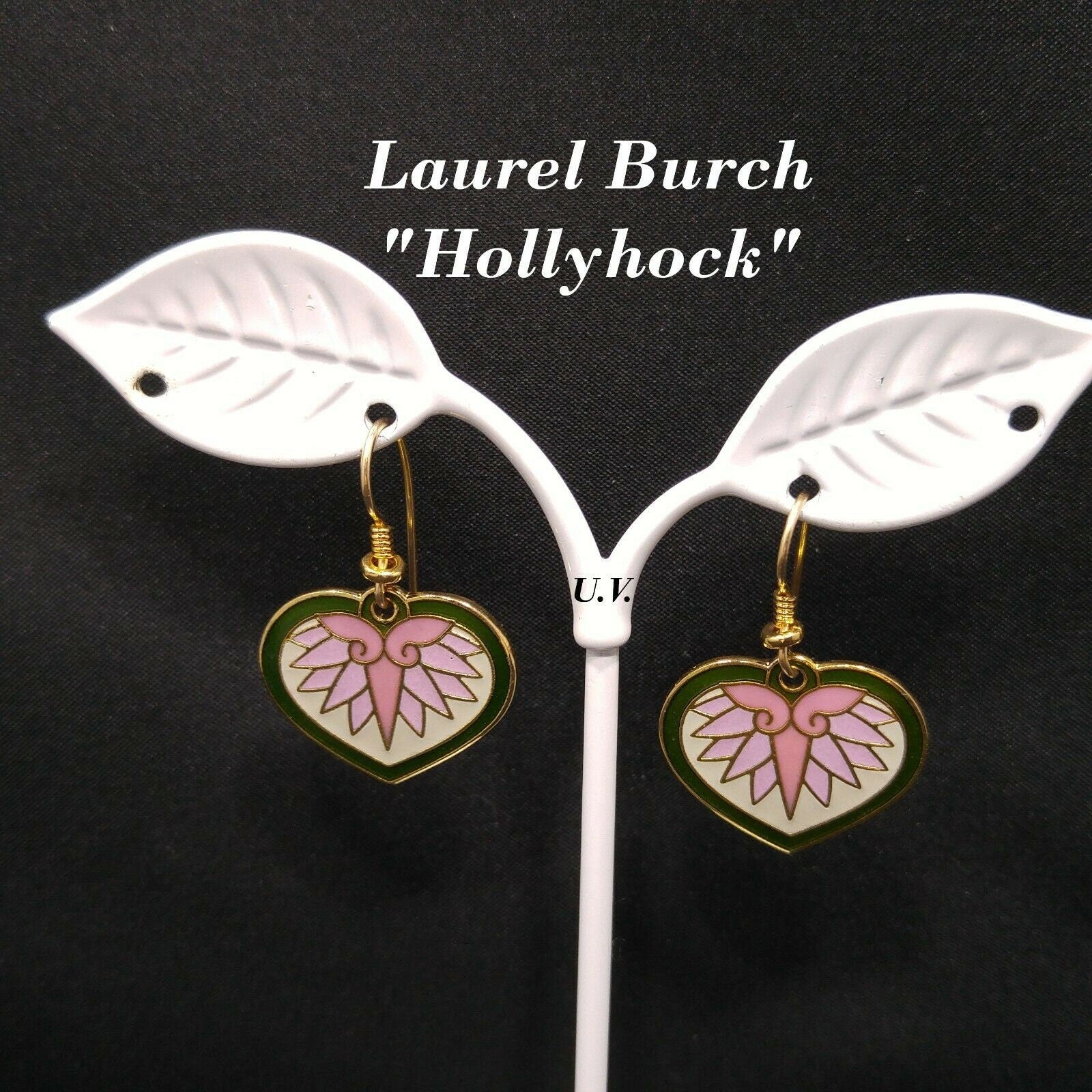 *Description: This is a great pair of Laurel Burch hollyhock design floral earrings in gold plated cloisonne outlines and backing with enamel in shades of pink, green, and white, from the 1980s. This beautiful pair of earrings is a very popular design. The design name is not printed on the back which usually means they are a little older. The enamel and cloisonne design is on a heart shape. The ear wires are gold filled. This would be a great addition to your vintage jewelry collection or make a great vintage gift!