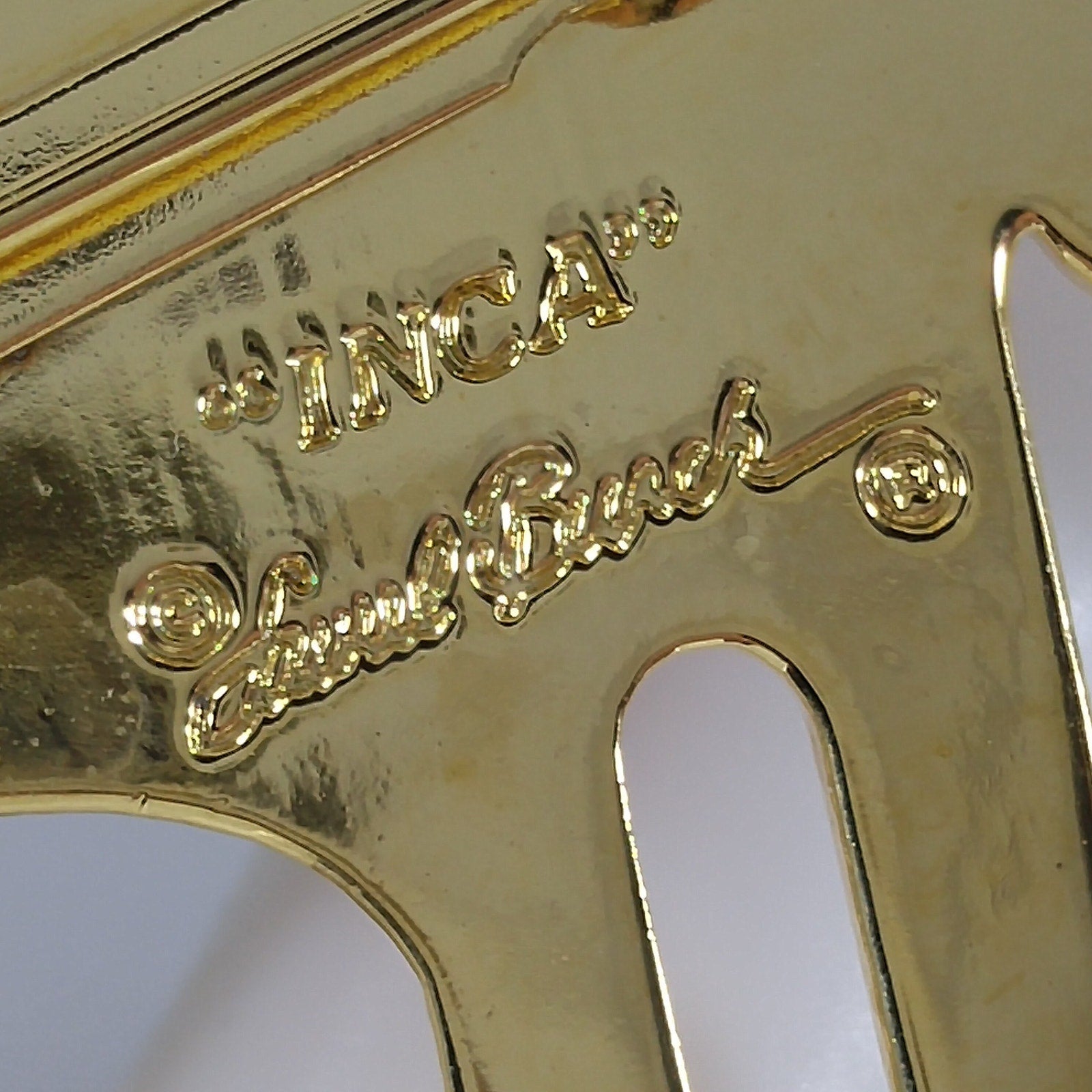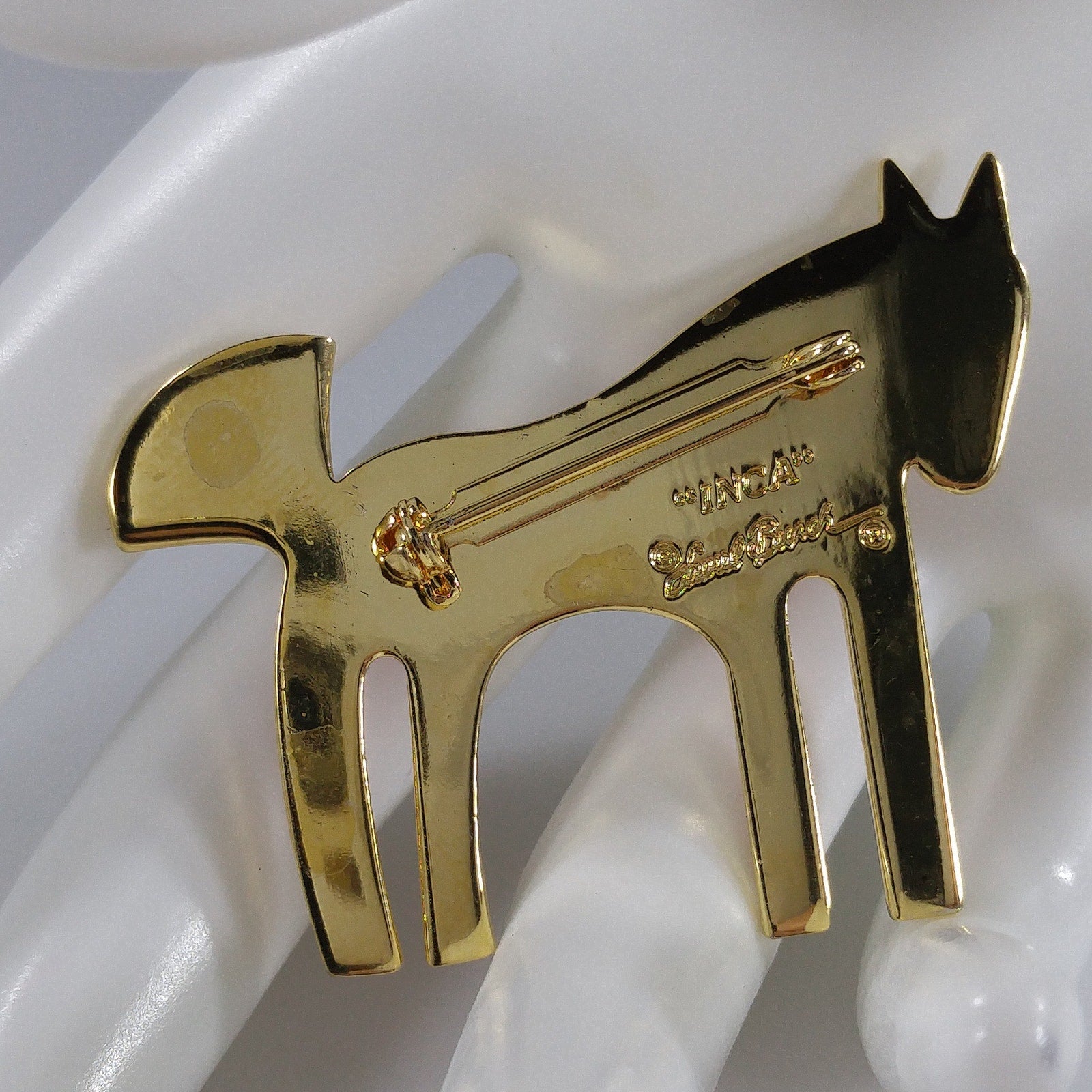 *Description: This is a great Laurel Burch red horse cloisonné gold plated brooch entitled "Inca" from the 1980s. The red horse with gold triangles on its body also has a purple face and purple with yellow mane in enamel. The tail is red, purple, and yellow enamel. This would be a great addition to your vintage jewelry collection or make a great vintage gift! It would make an amazing gift for an animal lover, particularly horses!