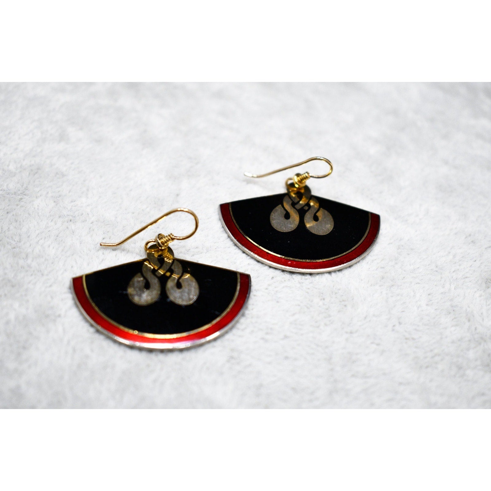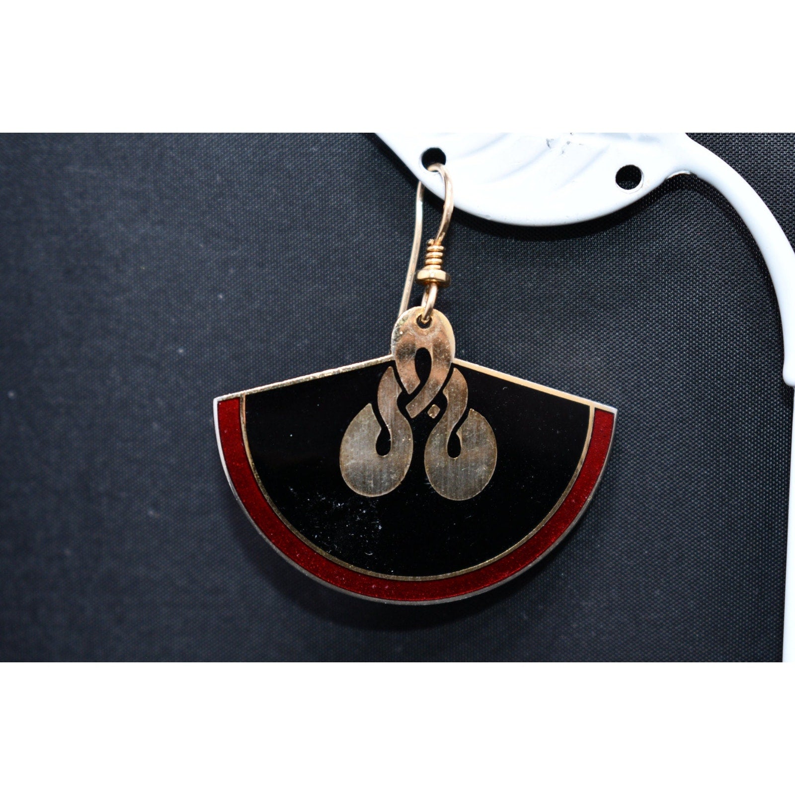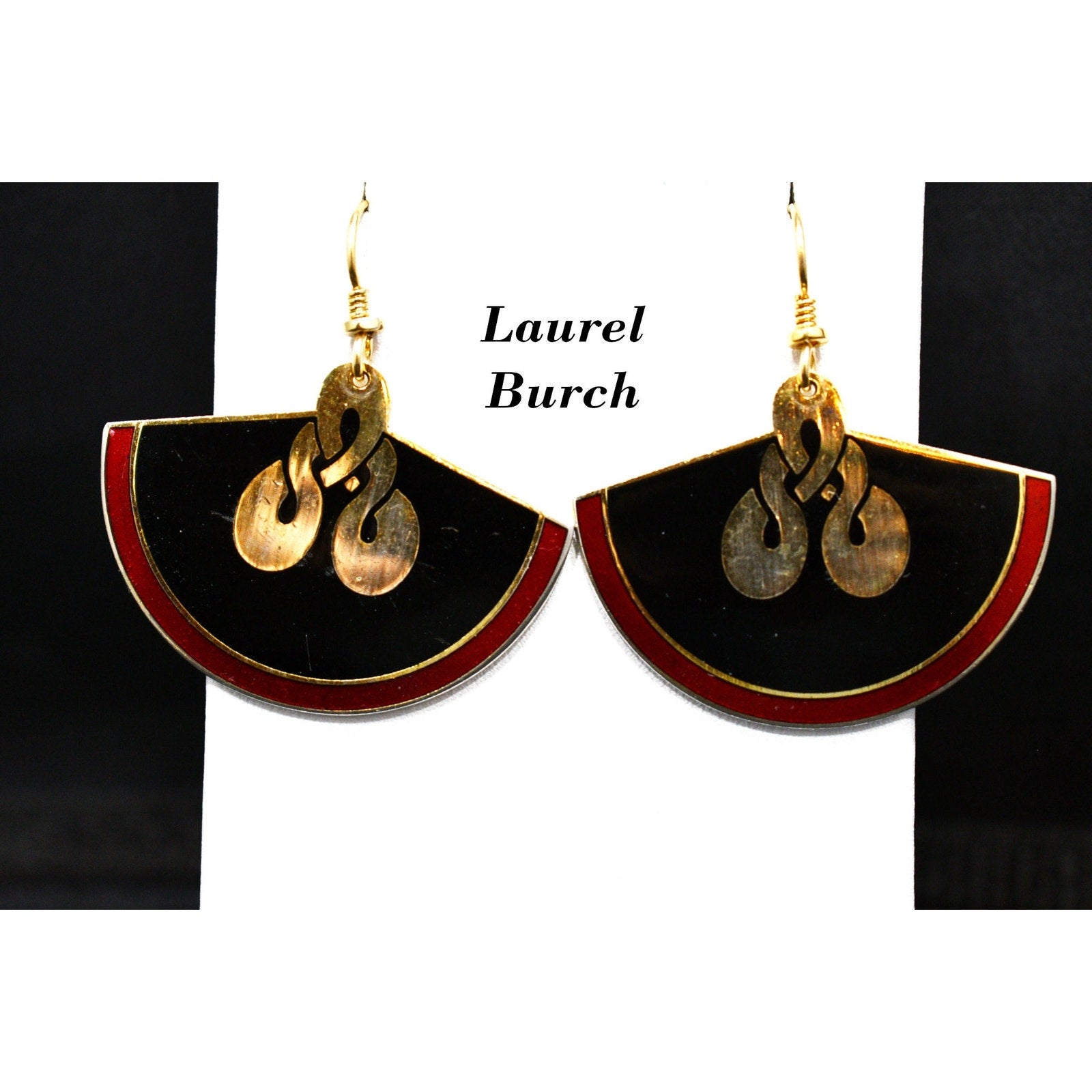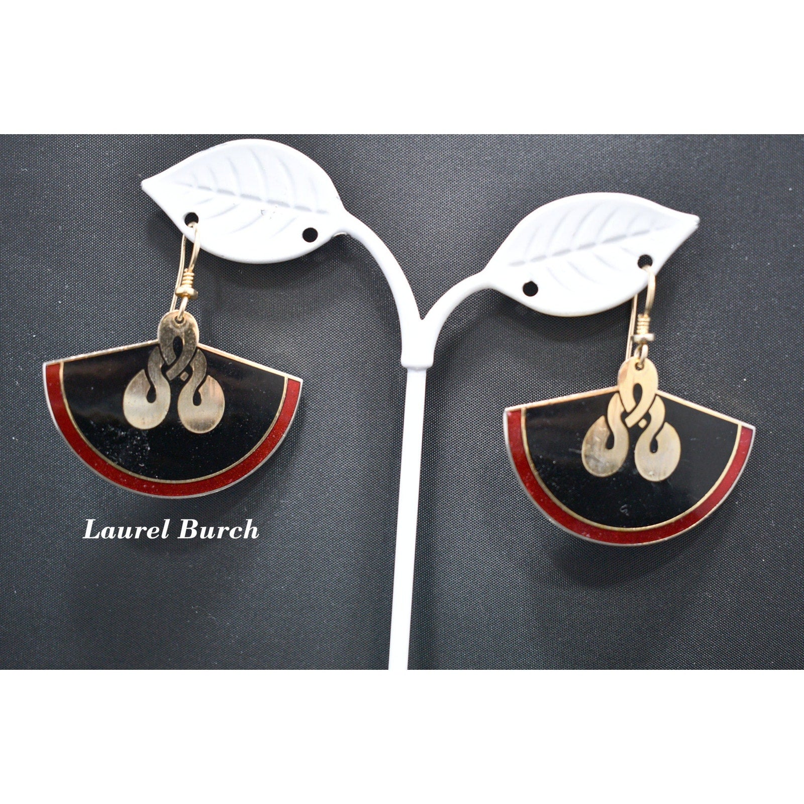 *Description: This is a great pair of Laurel Burch large fan earrings, gold plated cloisonne, with enamel in metallic red and black from the early 1980s. In the center is a gold reflective love knot design. This would be a great addition to your vintage jewelry collection or make a great vintage gift! Please review photos carefully for tiny dings in the enamel and plating prior to purchase. All of our earrings are pre-loved. This would be a great addition to your vintage jewelry collection or make a great vintage gift!