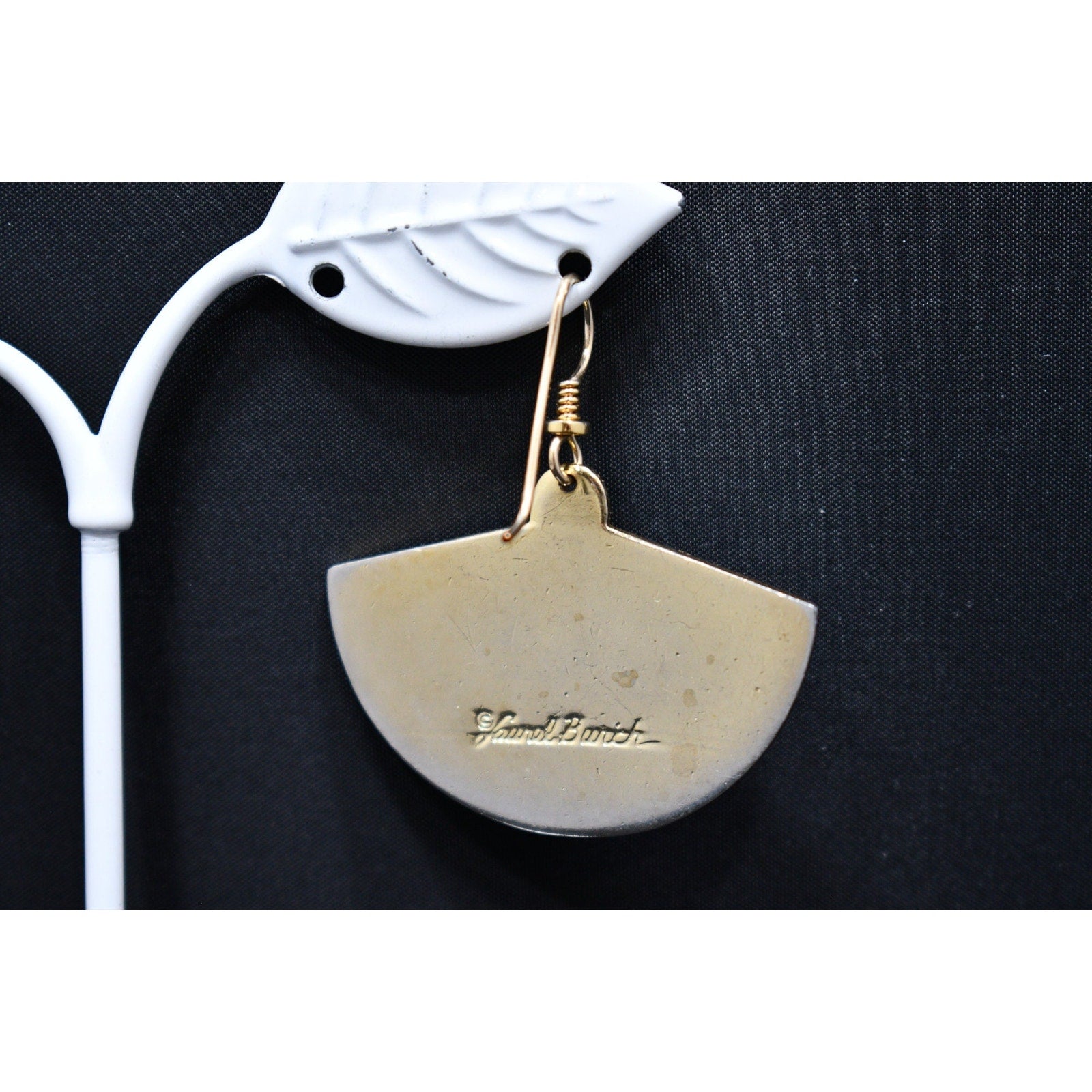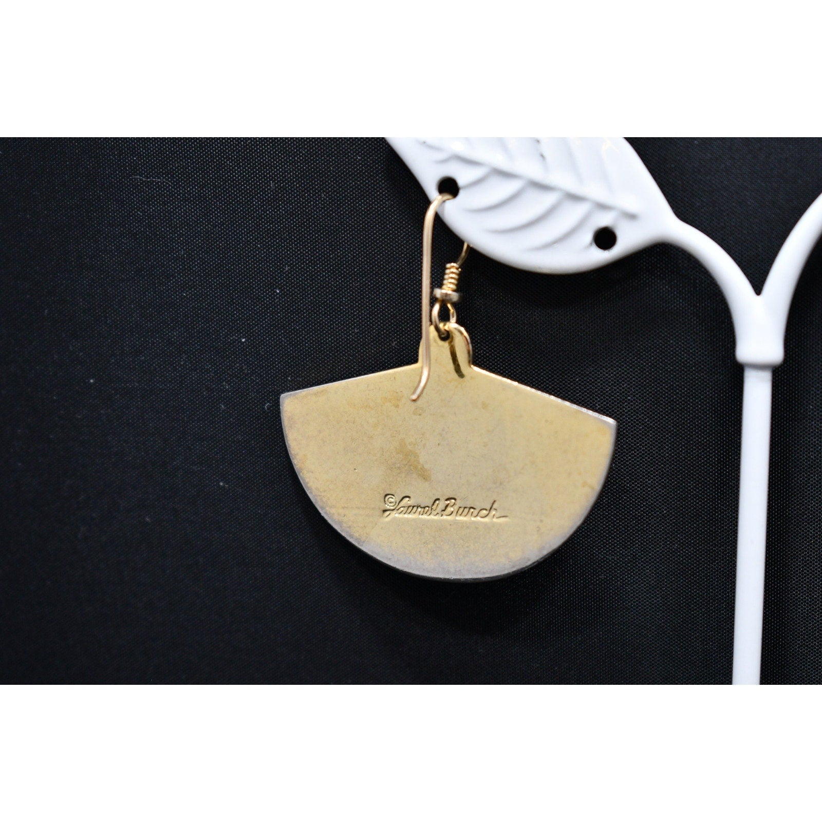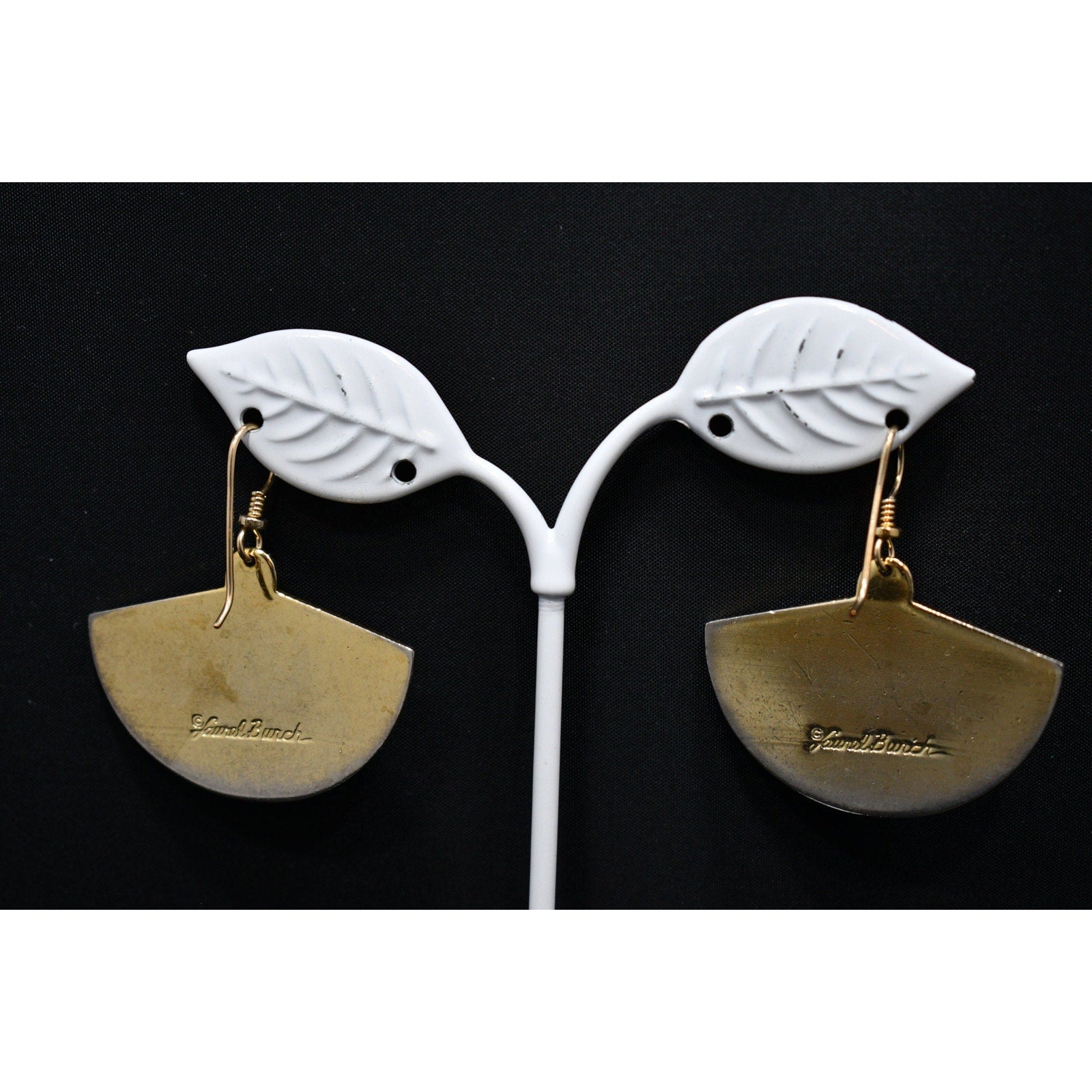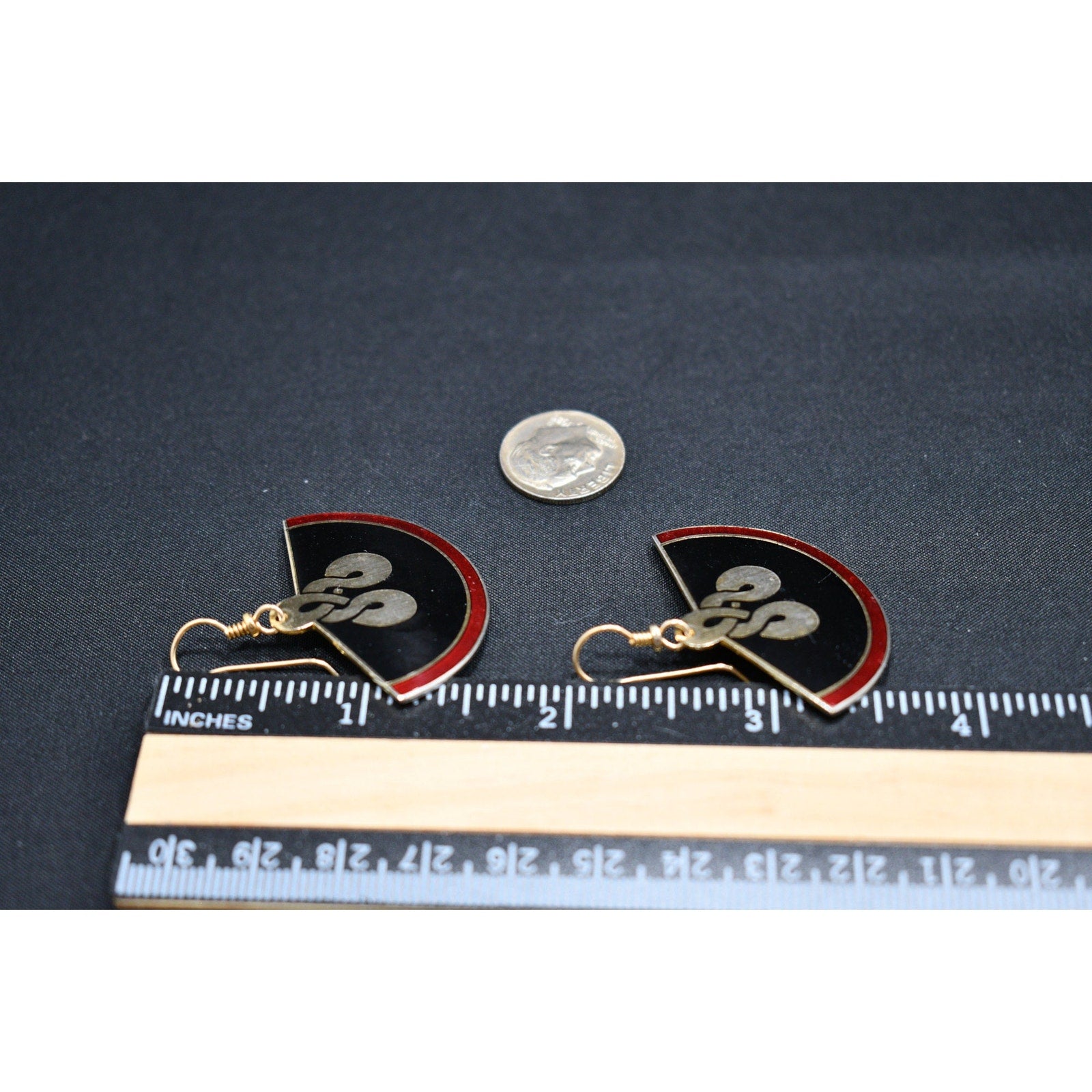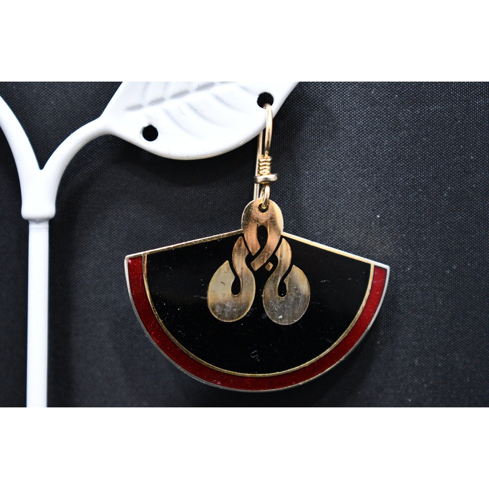 *Description: This is a great pair of Laurel Burch large fan earrings, gold plated cloisonne, with enamel in metallic red and black from the early 1980s. In the center is a gold reflective love knot design. This would be a great addition to your vintage jewelry collection or make a great vintage gift! Please review photos carefully for tiny dings in the enamel and plating prior to purchase. All of our earrings are pre-loved. This would be a great addition to your vintage jewelry collection or make a great vintage gift!