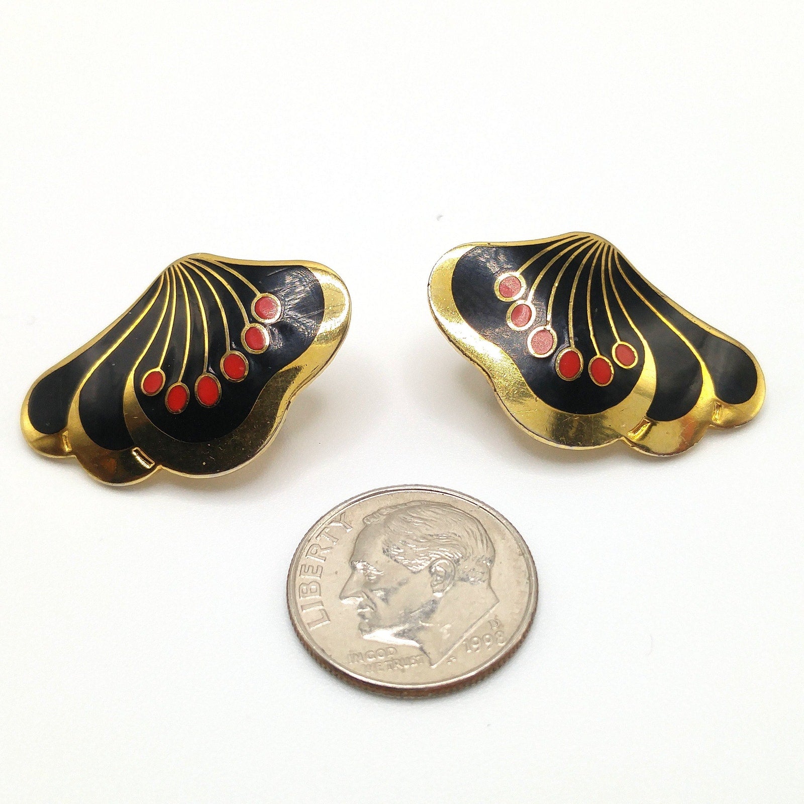 *Description: This is a beautiful pair of vintage Laurel Burch clip on black and red earrings from the 1980s. The earrings are stamped Laurel Burch and "Le Fleur" on the back of each earring. The "Le Fleur" means FLOWER in French. Laurel Burch, who was an amazing artist, created these earrings using the cloisonné technique using enamel of black and dots of red, outlined in gold plate. They are a beautiful example of a feminine flower made with beautiful materials. This would be a great addition to your vintage jewelry collection or make a great vintage gift!