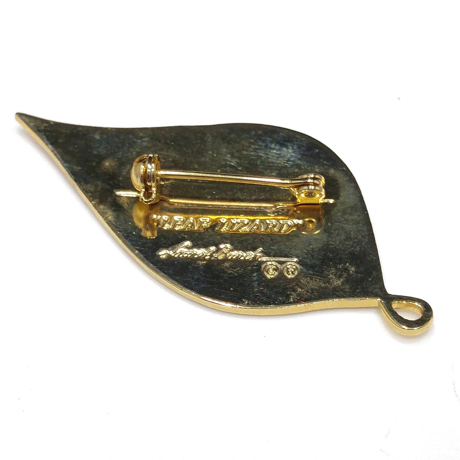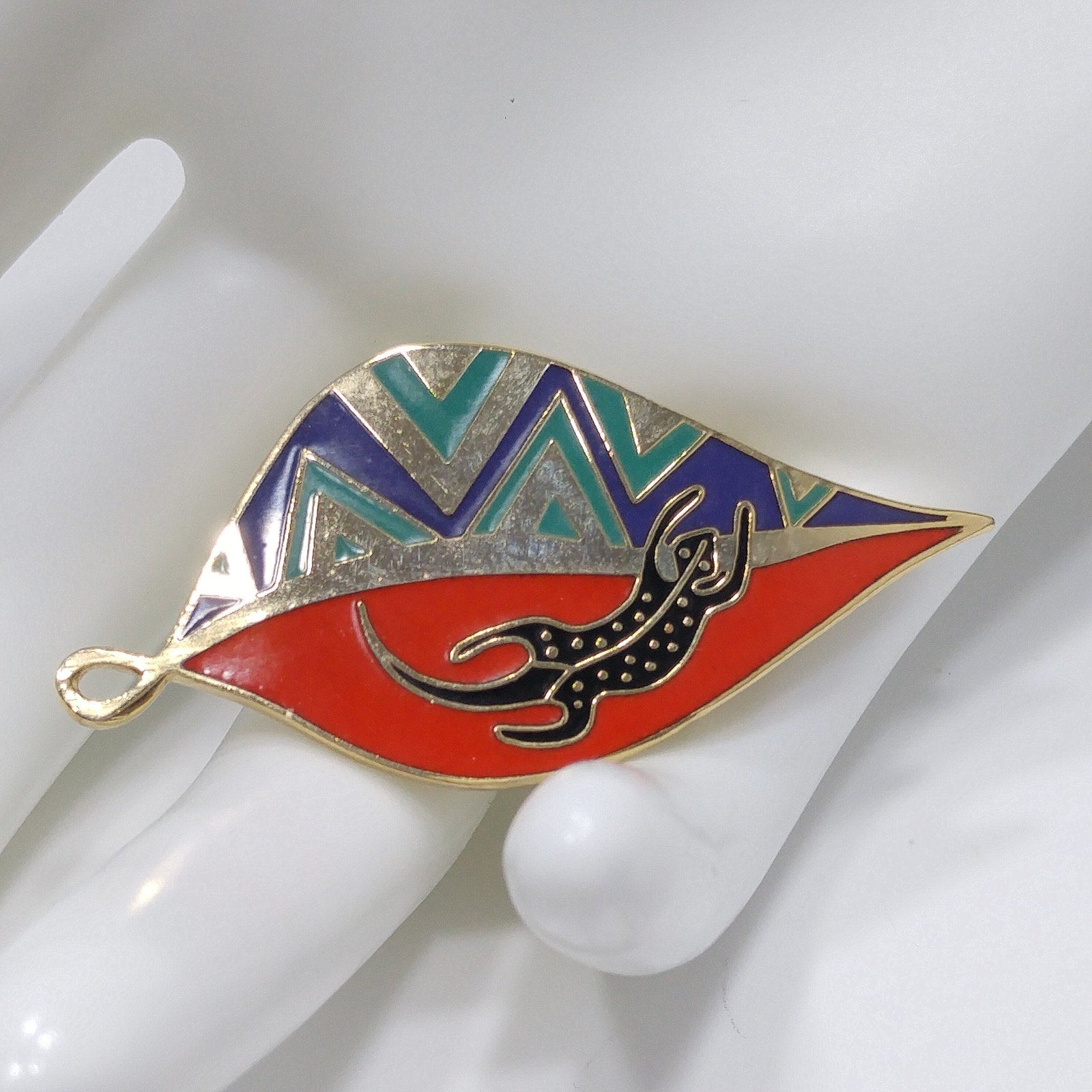 Laurel Burch "Leaf Lizard" Brooch & Pendant, Cloisonné Gold Plated, Enamel, 1980s Vintage Jewelry