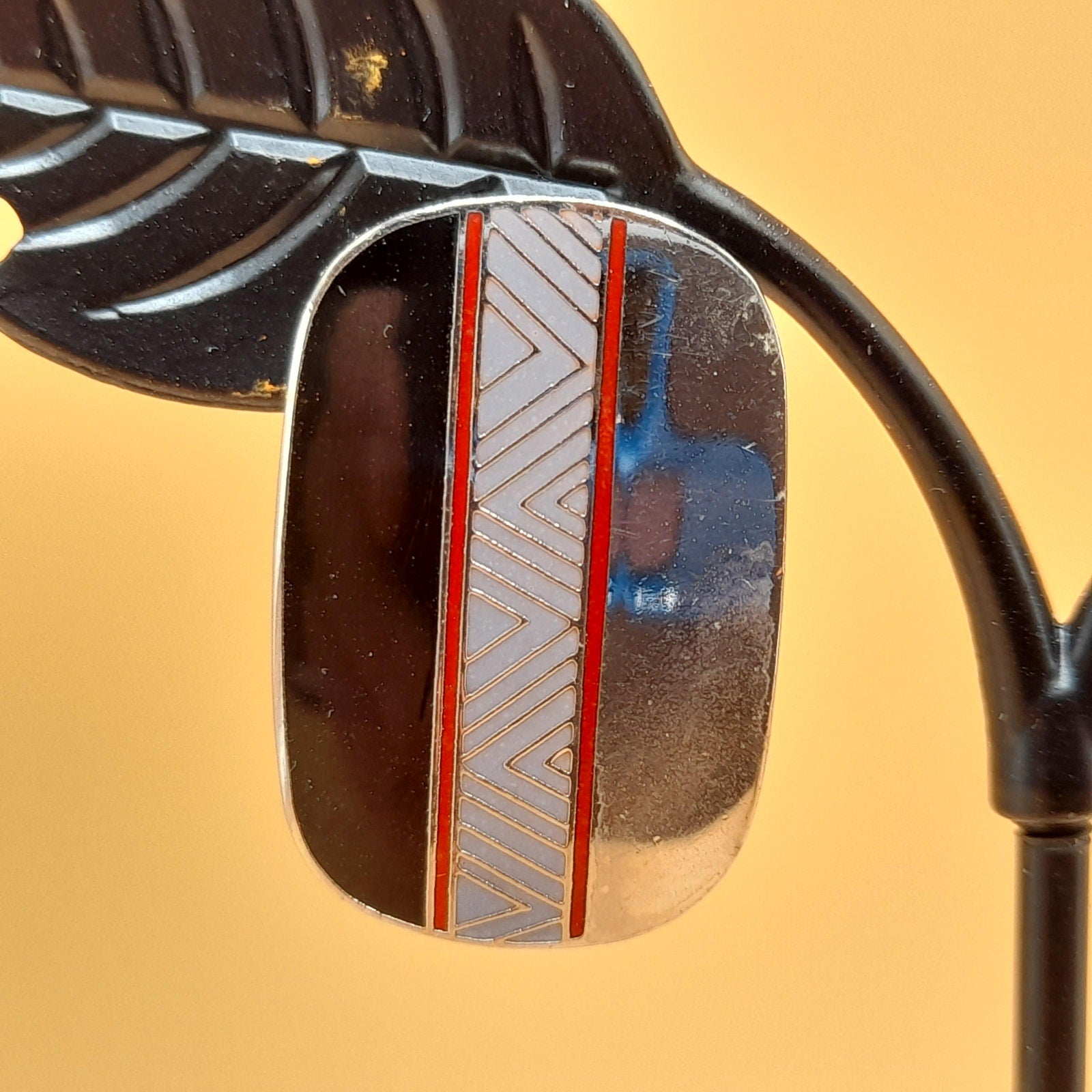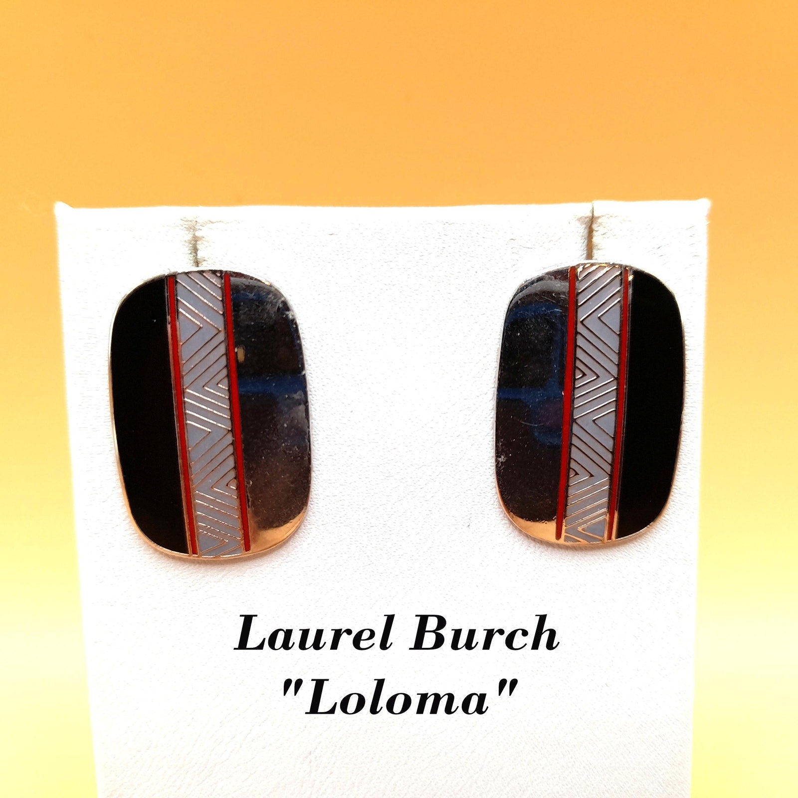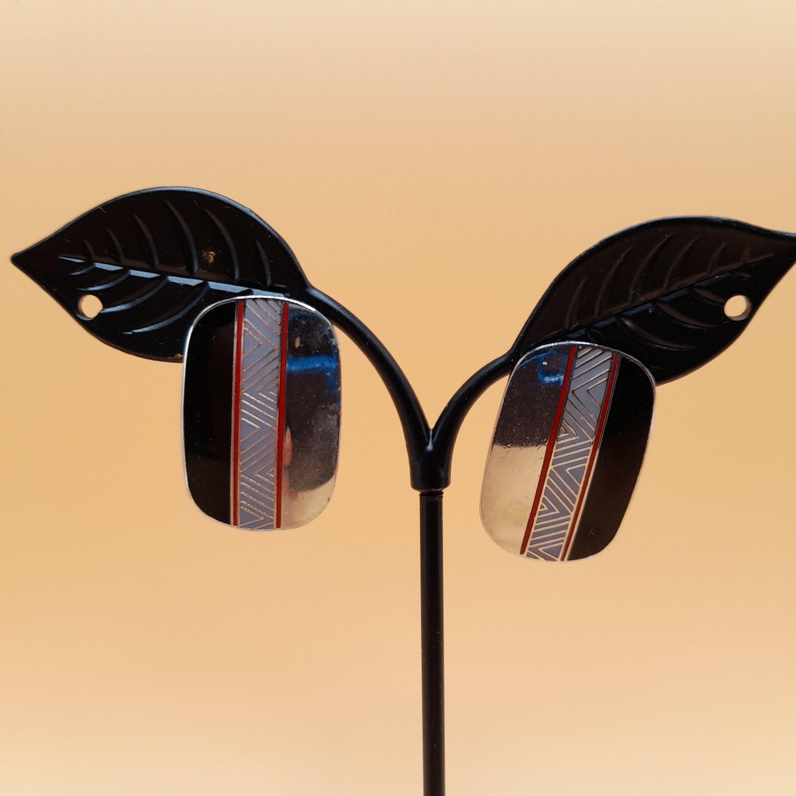 *Description: This is a great pair of vintage post Laurel Burch "Loloma" abstract style earrings with gold plate in silver tone, very reflective, red and black enamel using the cloisonne technique from the 1980s.