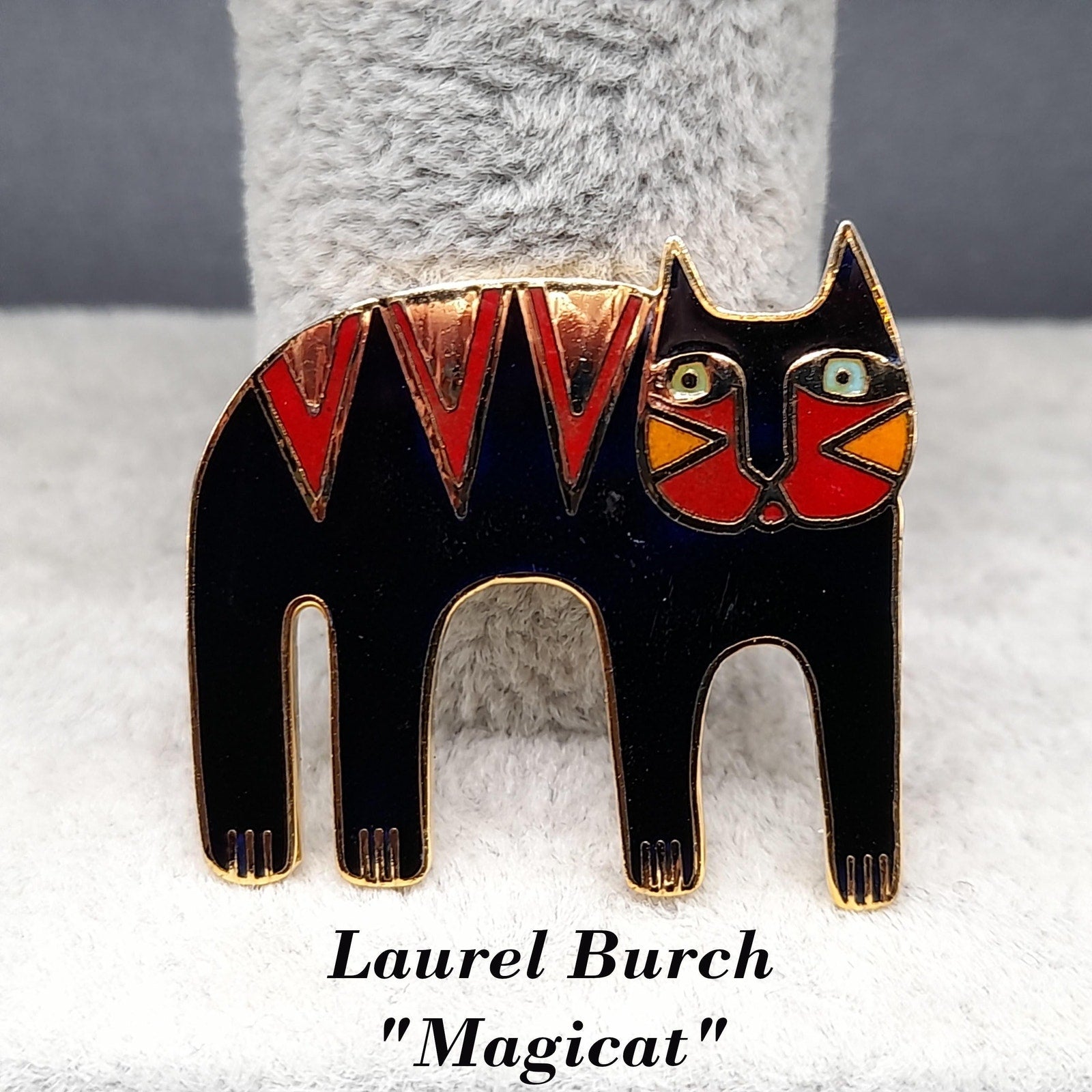 *Description: This is a great Laurel Burch Magicat cat brooch in gold plated cloisonne and enamel in black, red, orange and light blue from the 1980s. This cat pin is perfect for the cat lover in your life. It would look beautiful on a jacket, hat, or bag. It is in excellent condition.