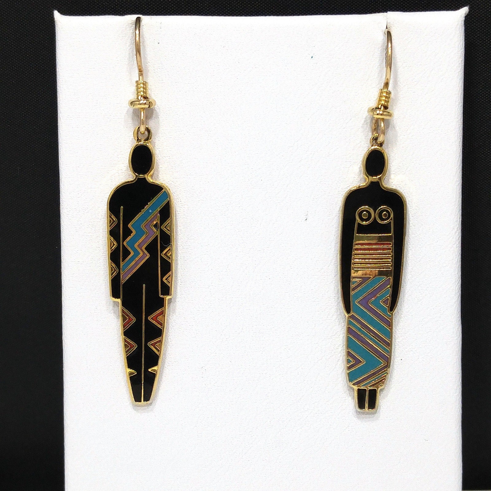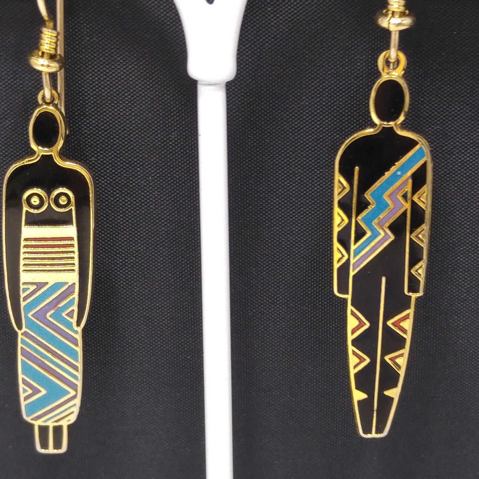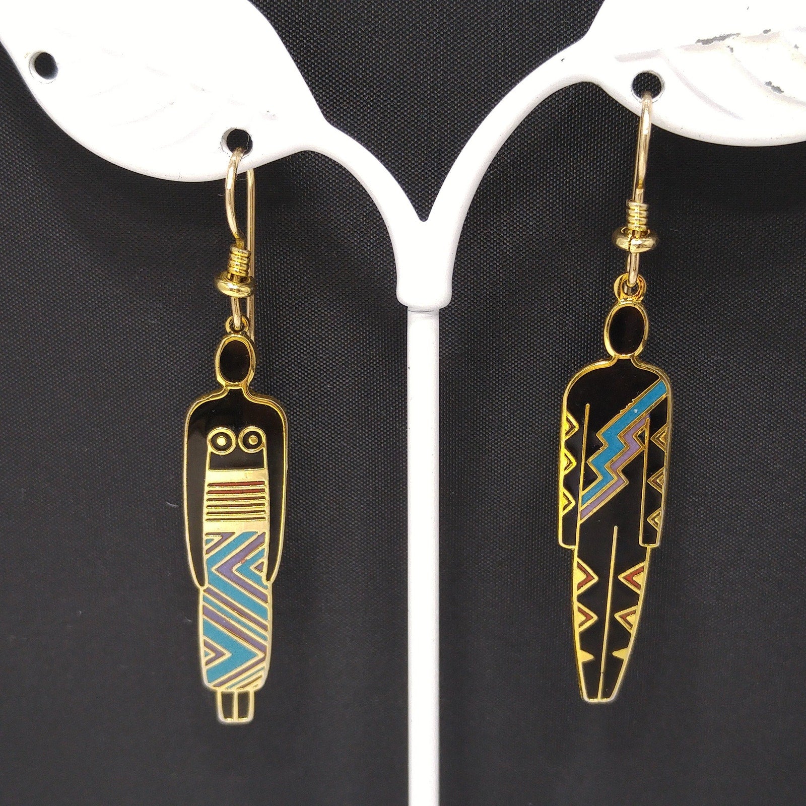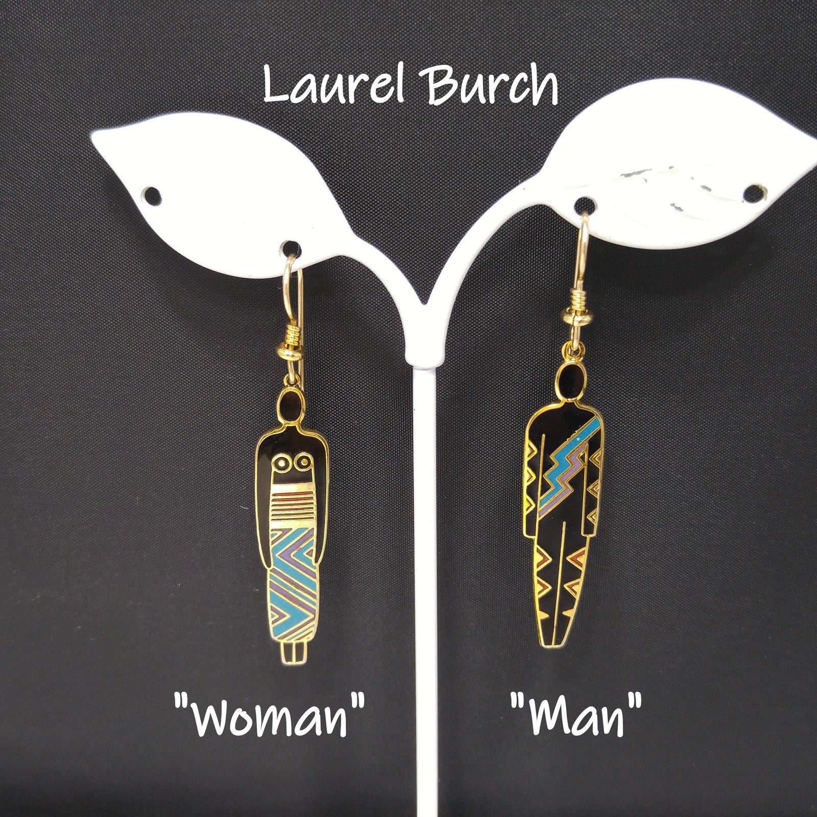 *Description: This is a great artistic pair of Laurel Burch earrings, tribal fashion, from the 1980s. Black enamel earrings trimmed in teal and maroon red with a gold outline. One earring is stamped "Man" and the other stamped "Woman". This is another great example of the art work shared by Laurel Burch through her jewelry.
