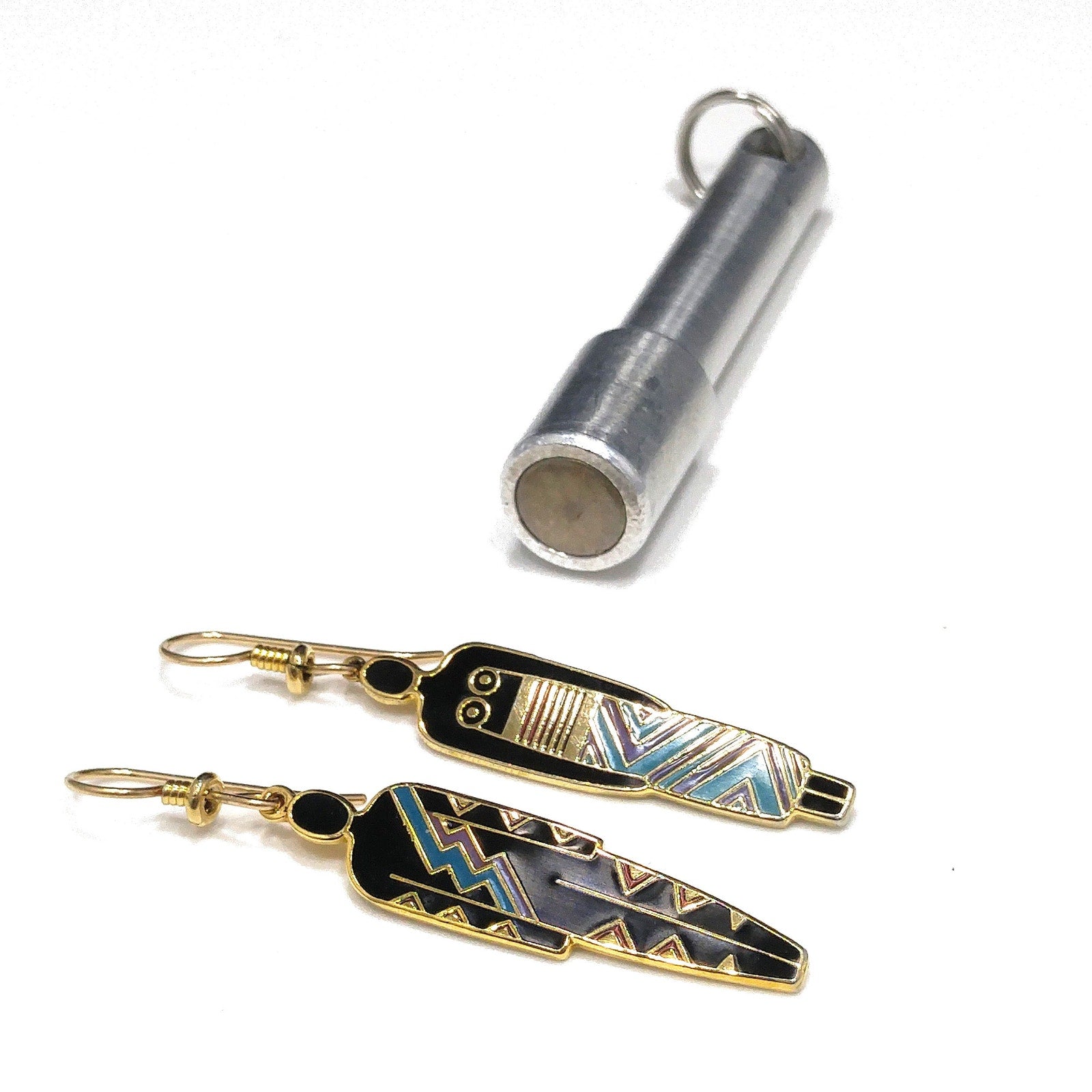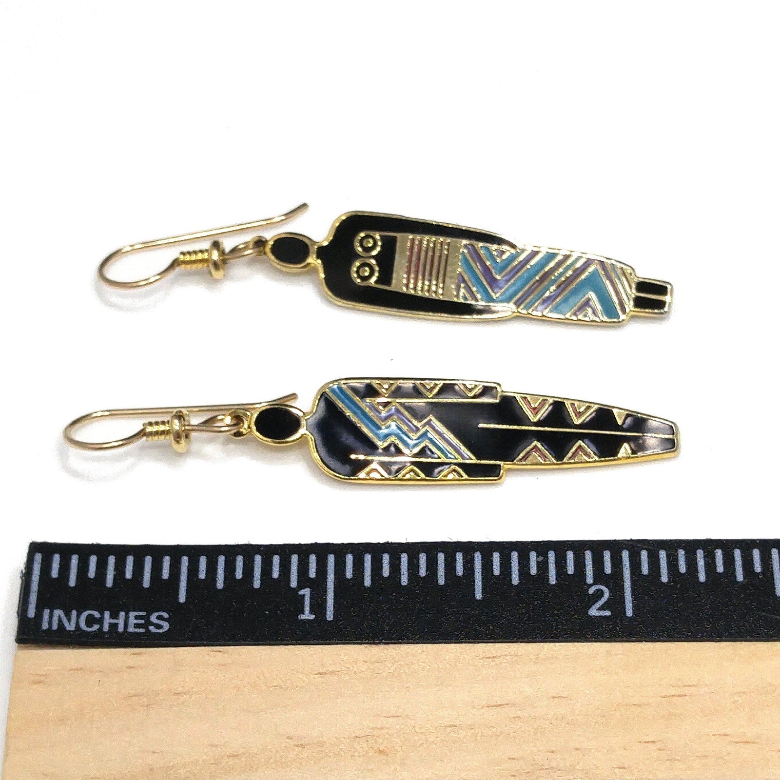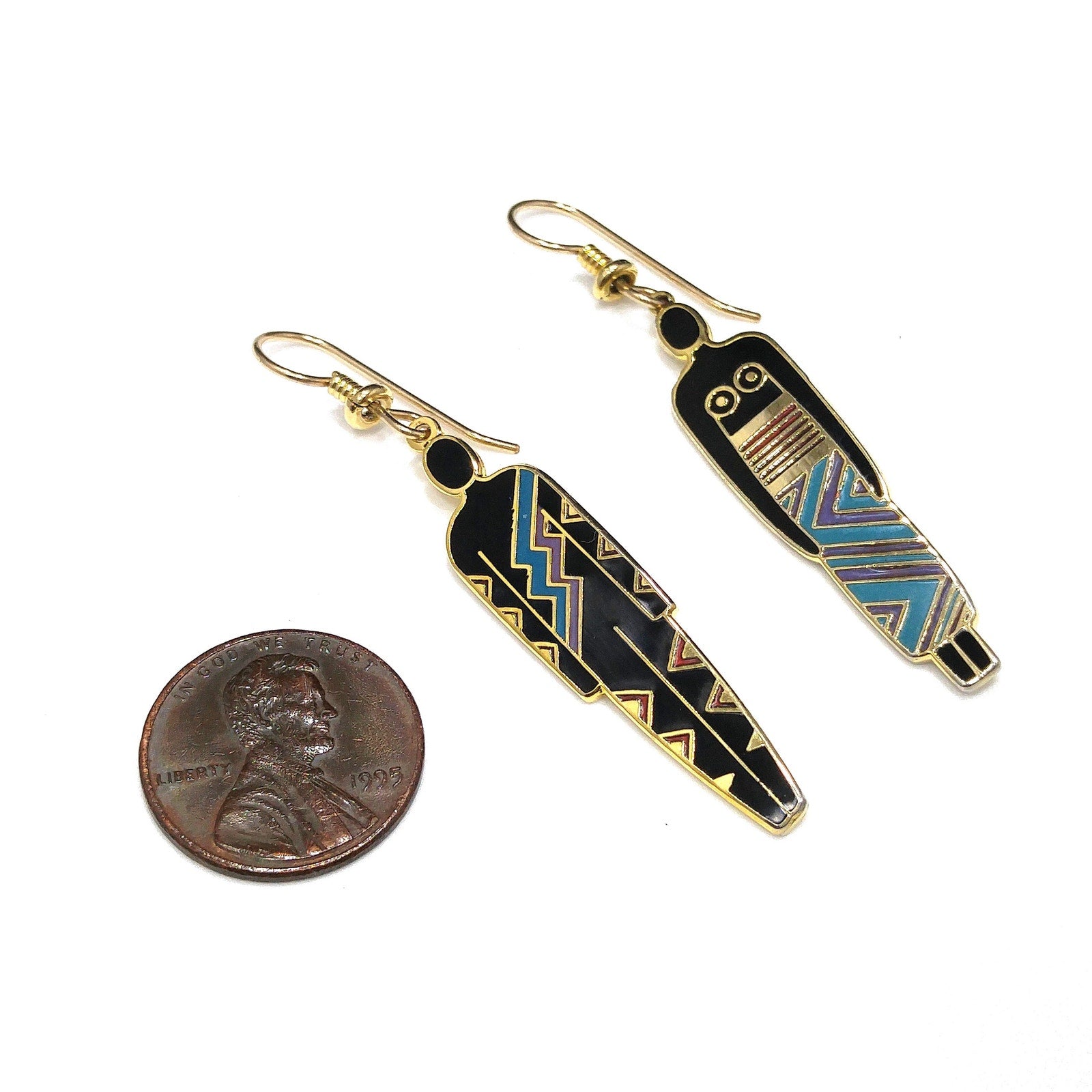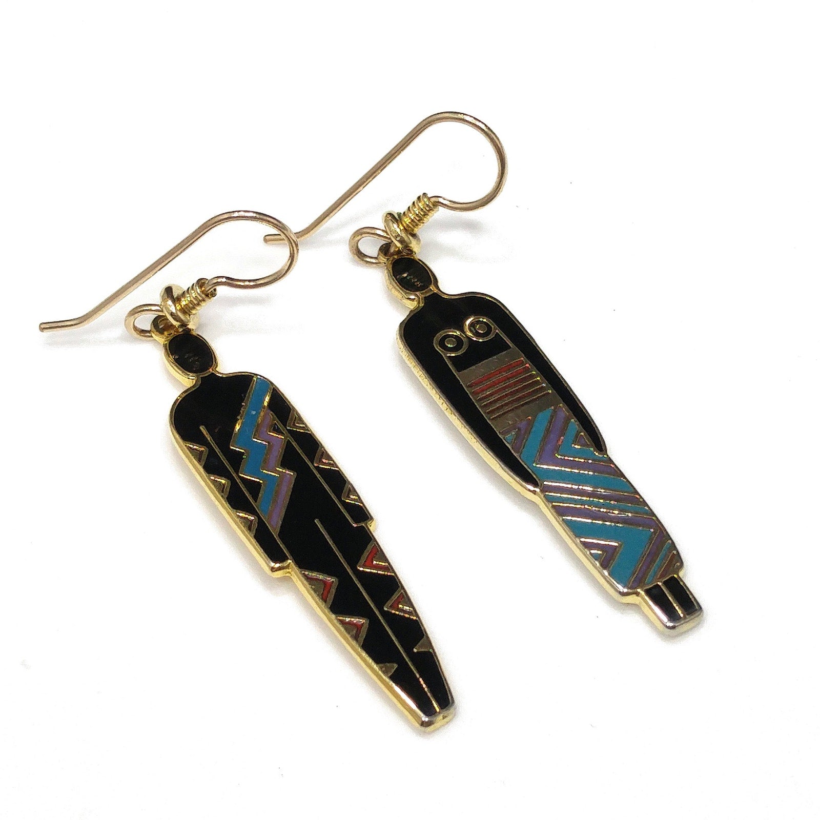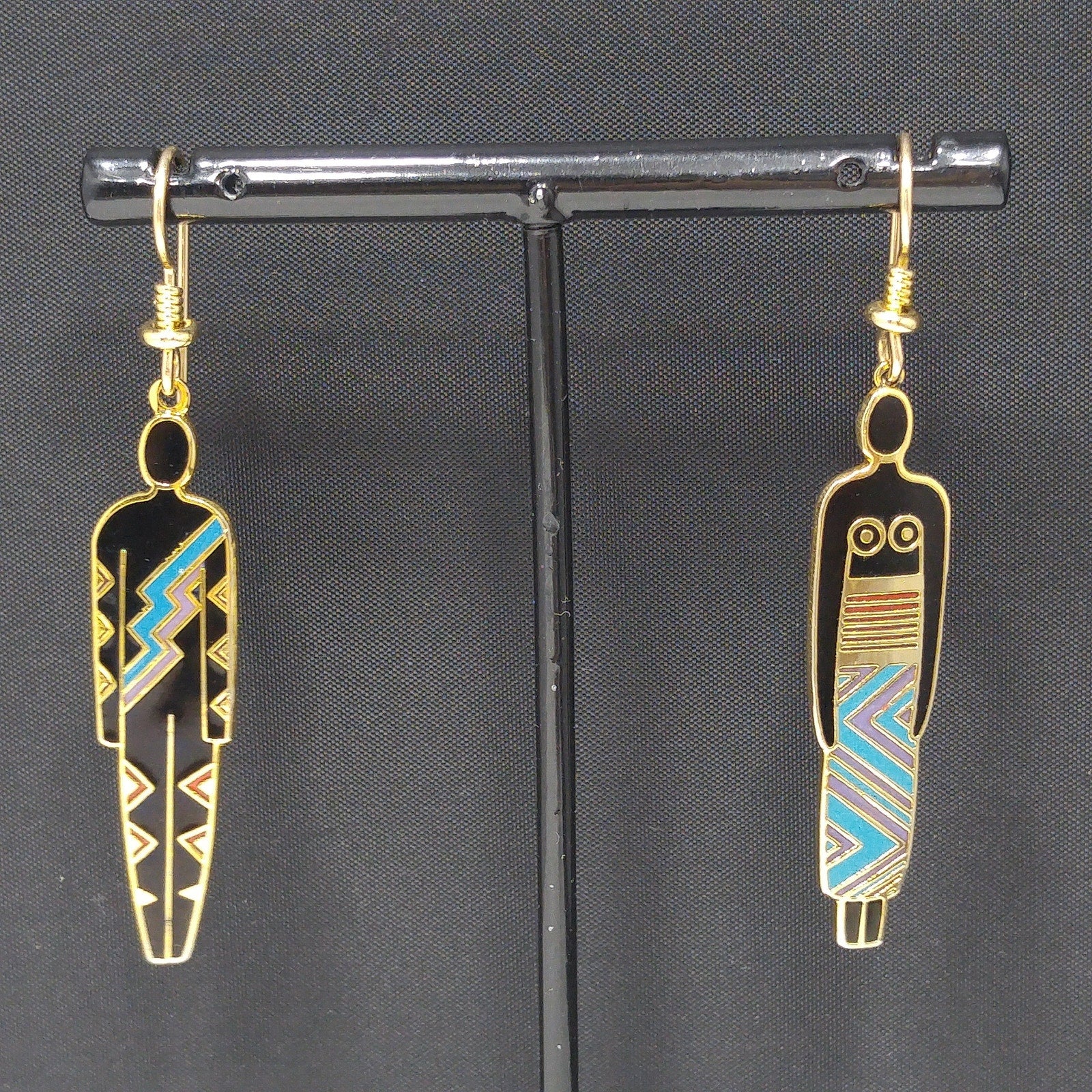 *Description: This is a great artistic pair of Laurel Burch earrings, tribal fashion, from the 1980s. Black enamel earrings trimmed in teal and maroon red with a gold outline. One earring is stamped "Man" and the other stamped "Woman". This is another great example of the art work shared by Laurel Burch through her jewelry.