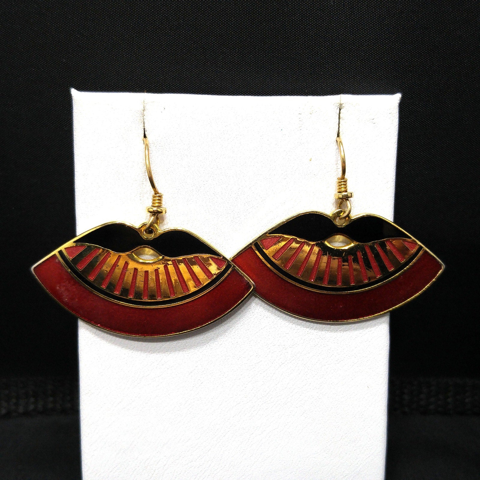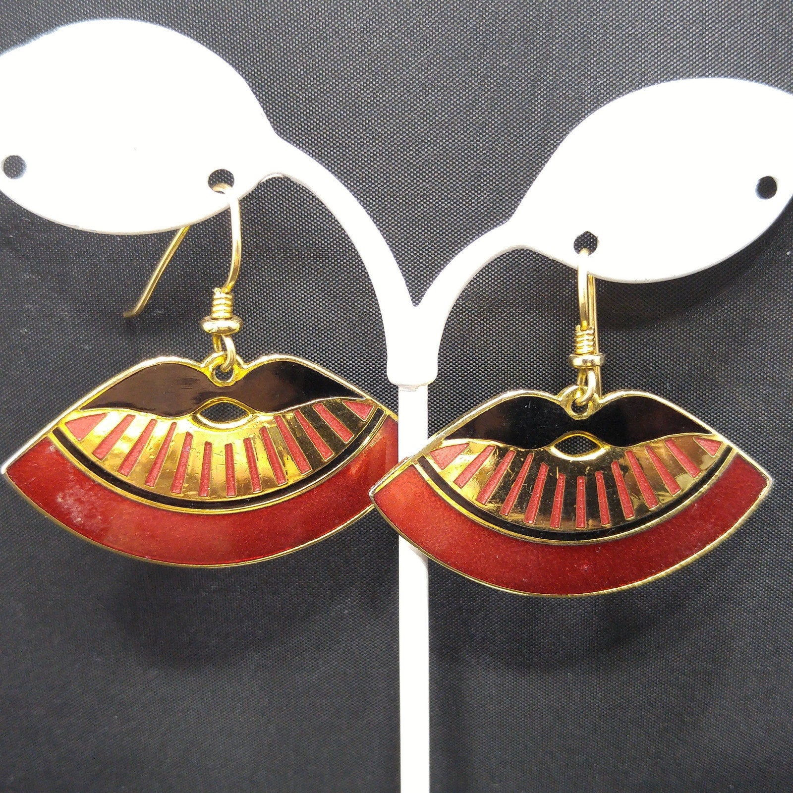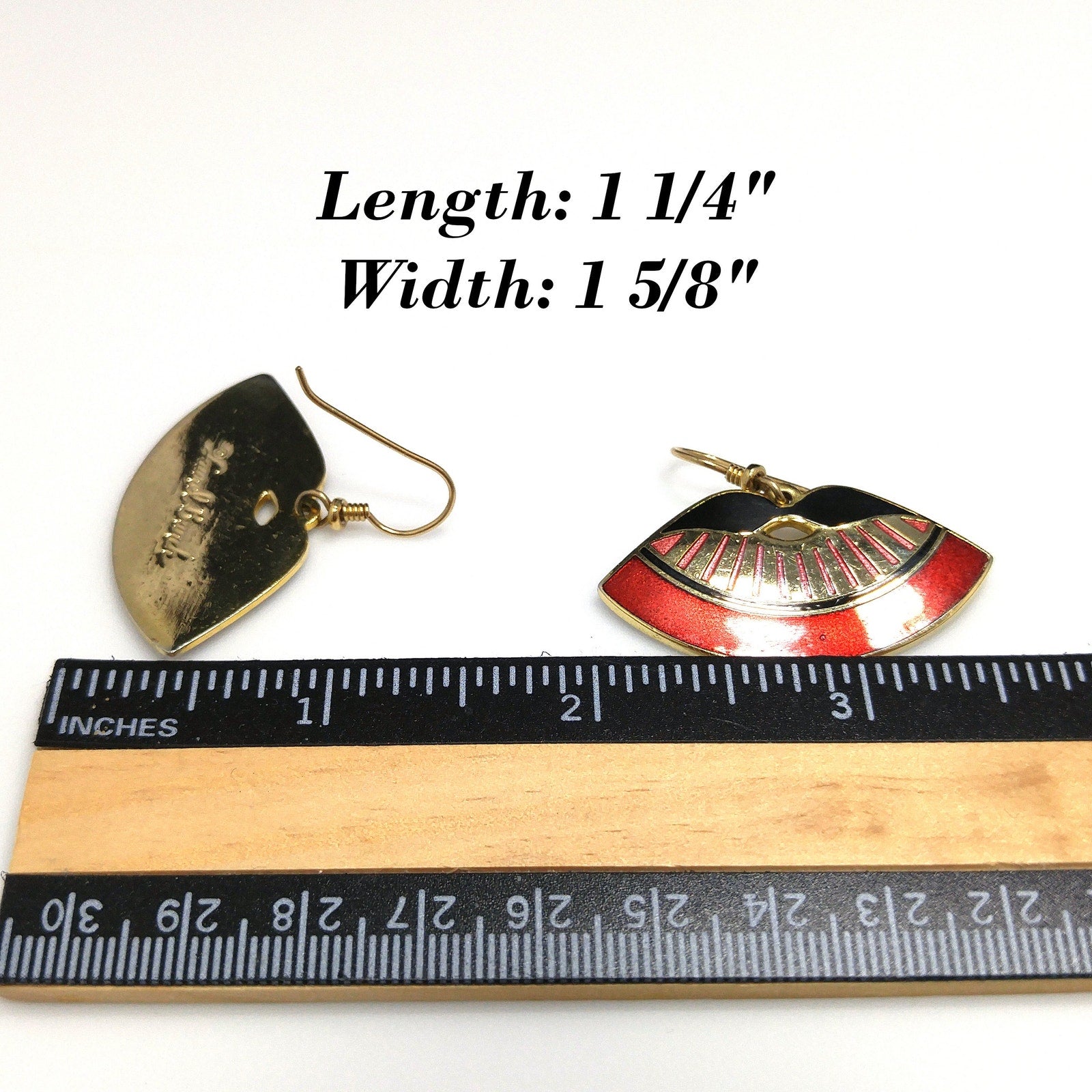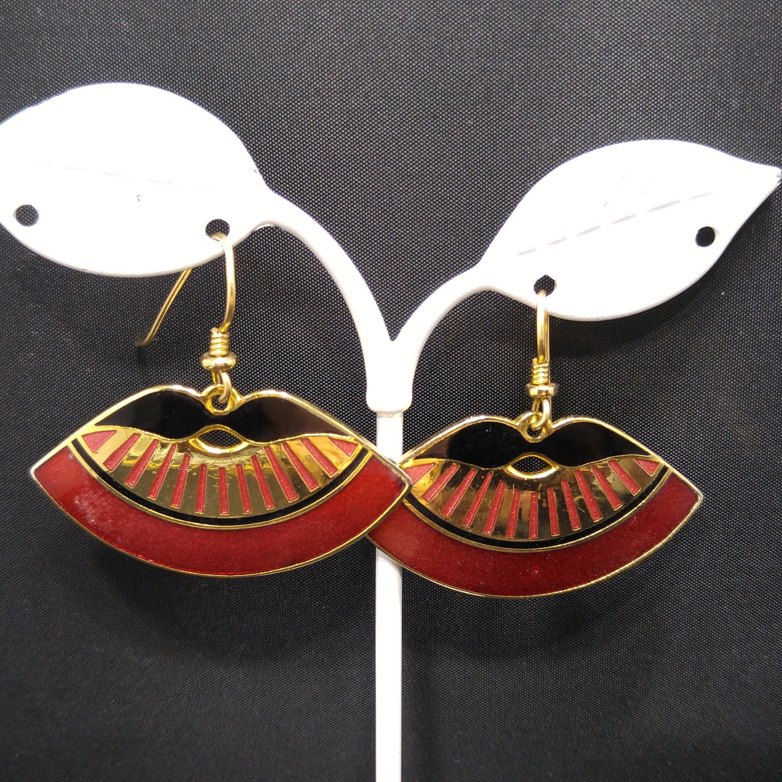 *Description: This is a great pair of large Laurel Burch cloisonne enamel earrings in metallic red and black with gold plated outlines and backing from the 1980s. The earrings are on gold filled ear wires. The black enamel at the top is shaped like a mustache. This would be a great addition to your vintage jewelry collection or make a great vintage gift!
