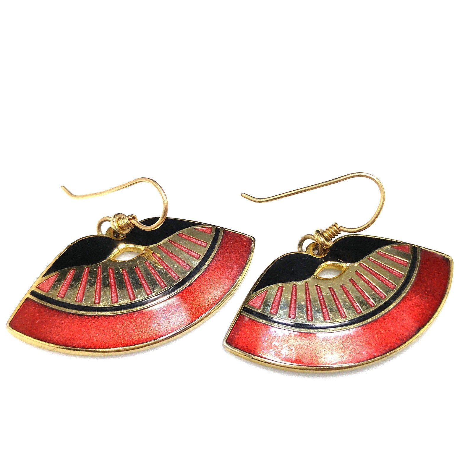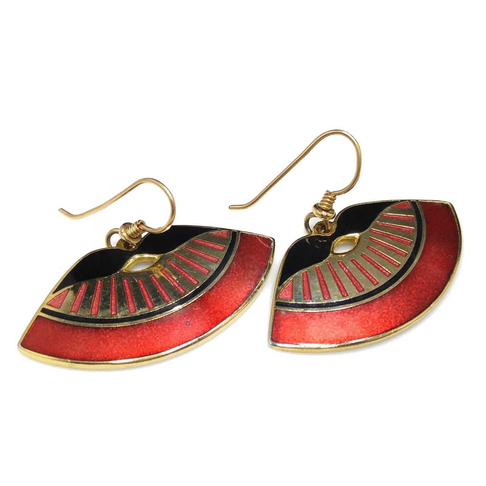 Laurel Burch Metallic Red Fan Earrings, Cloisonne Gold Plate Enamel, 1980s Vintage Jewelry