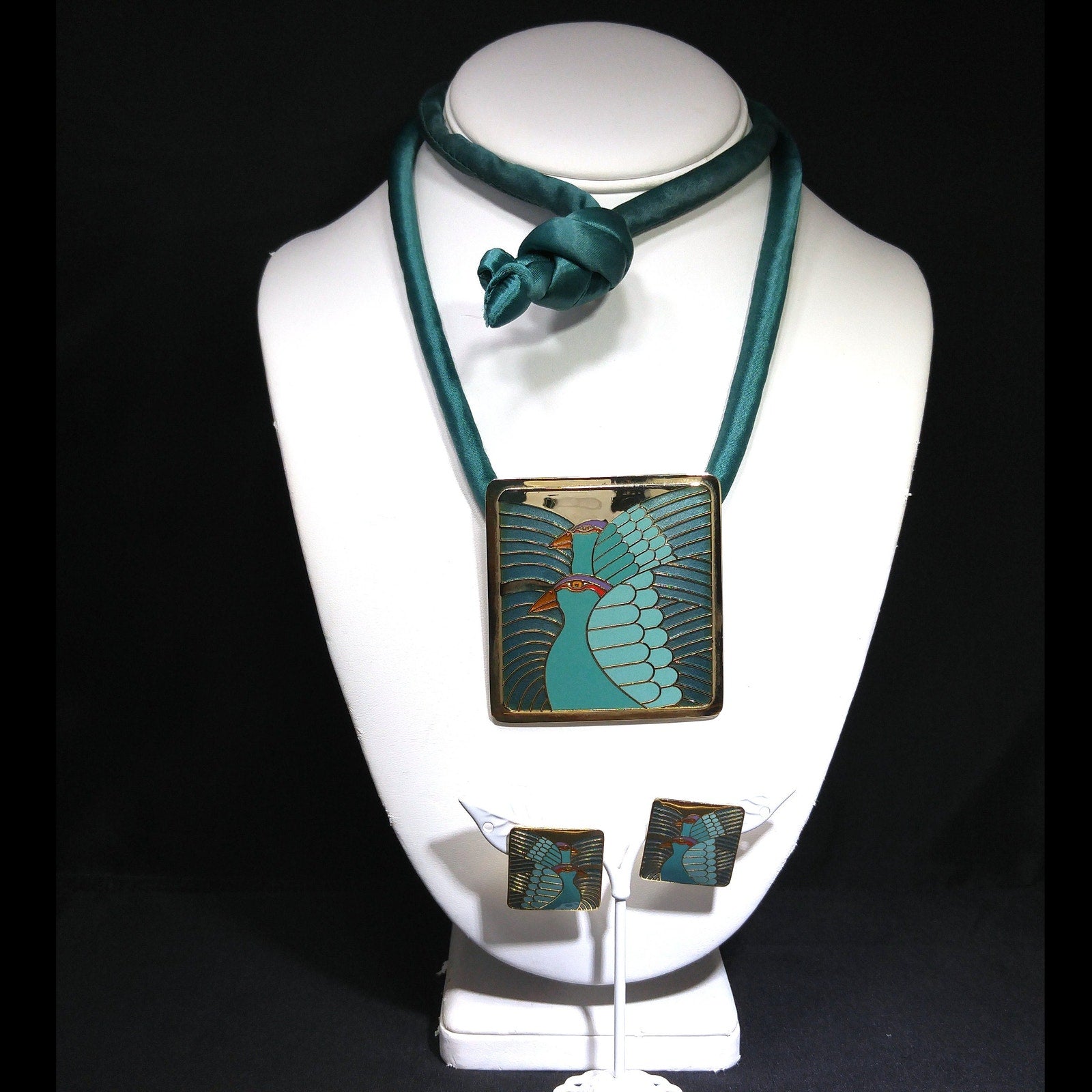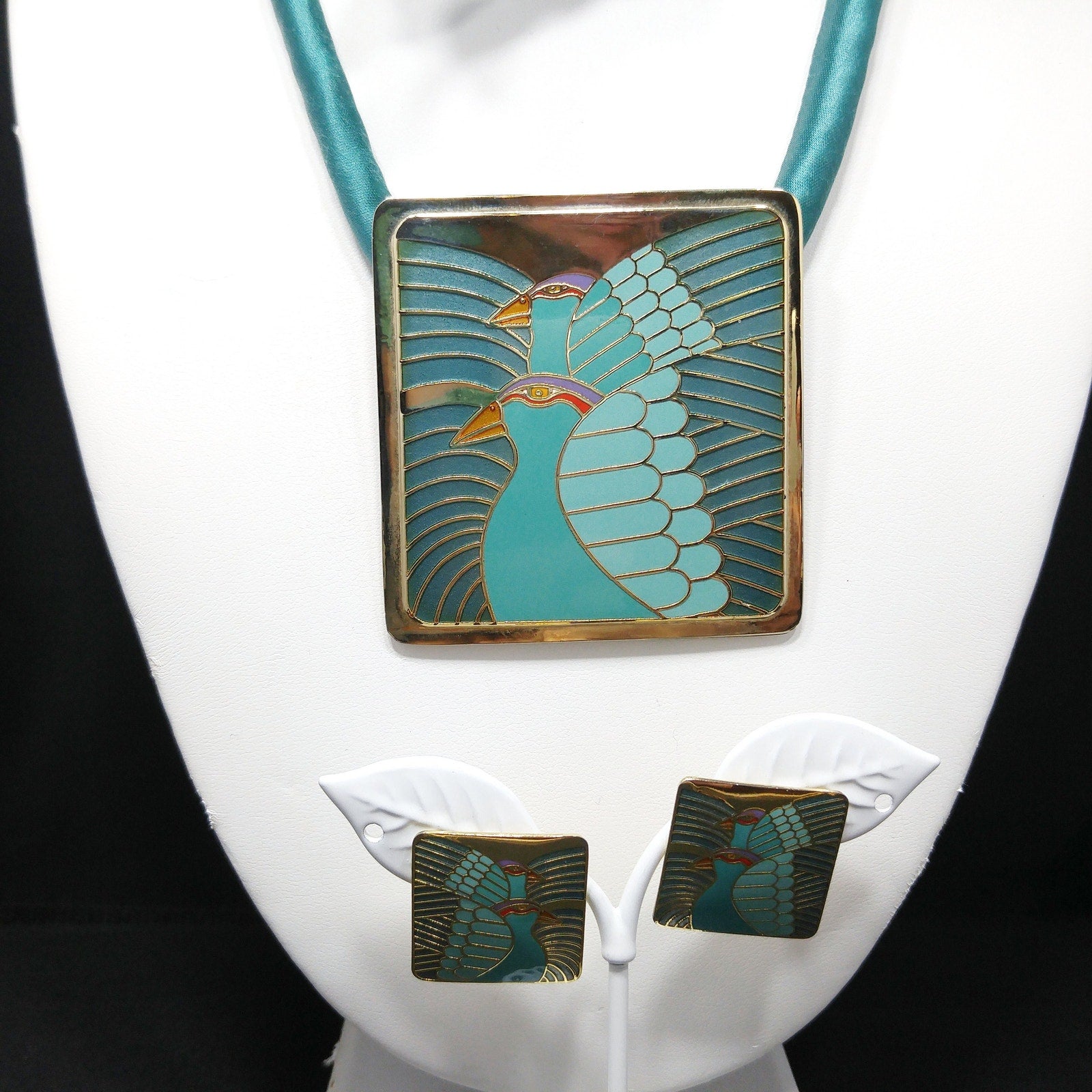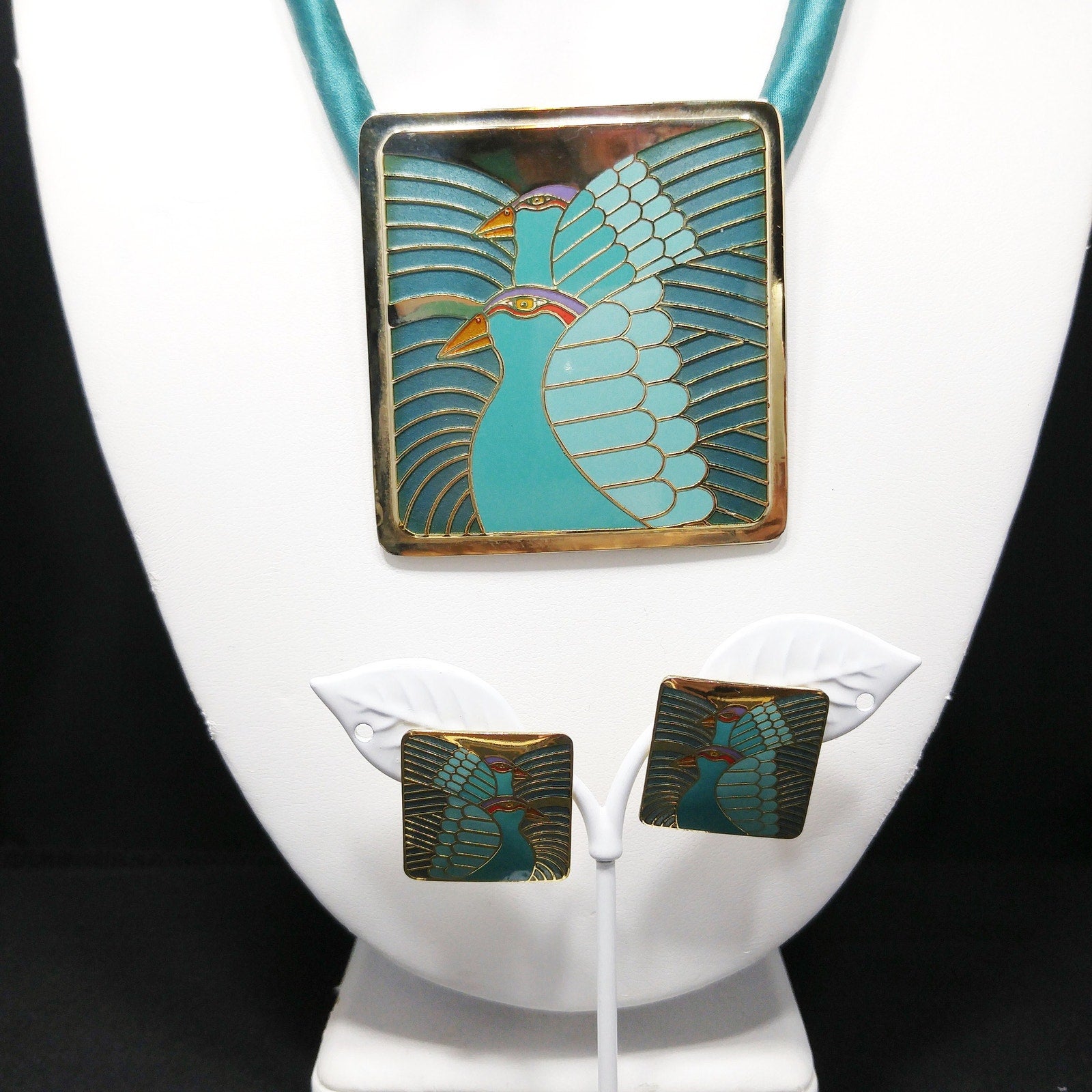 Laurel Burch Moon Doves Teal Pendant Necklace & Post Earrings Set Rare Vintage