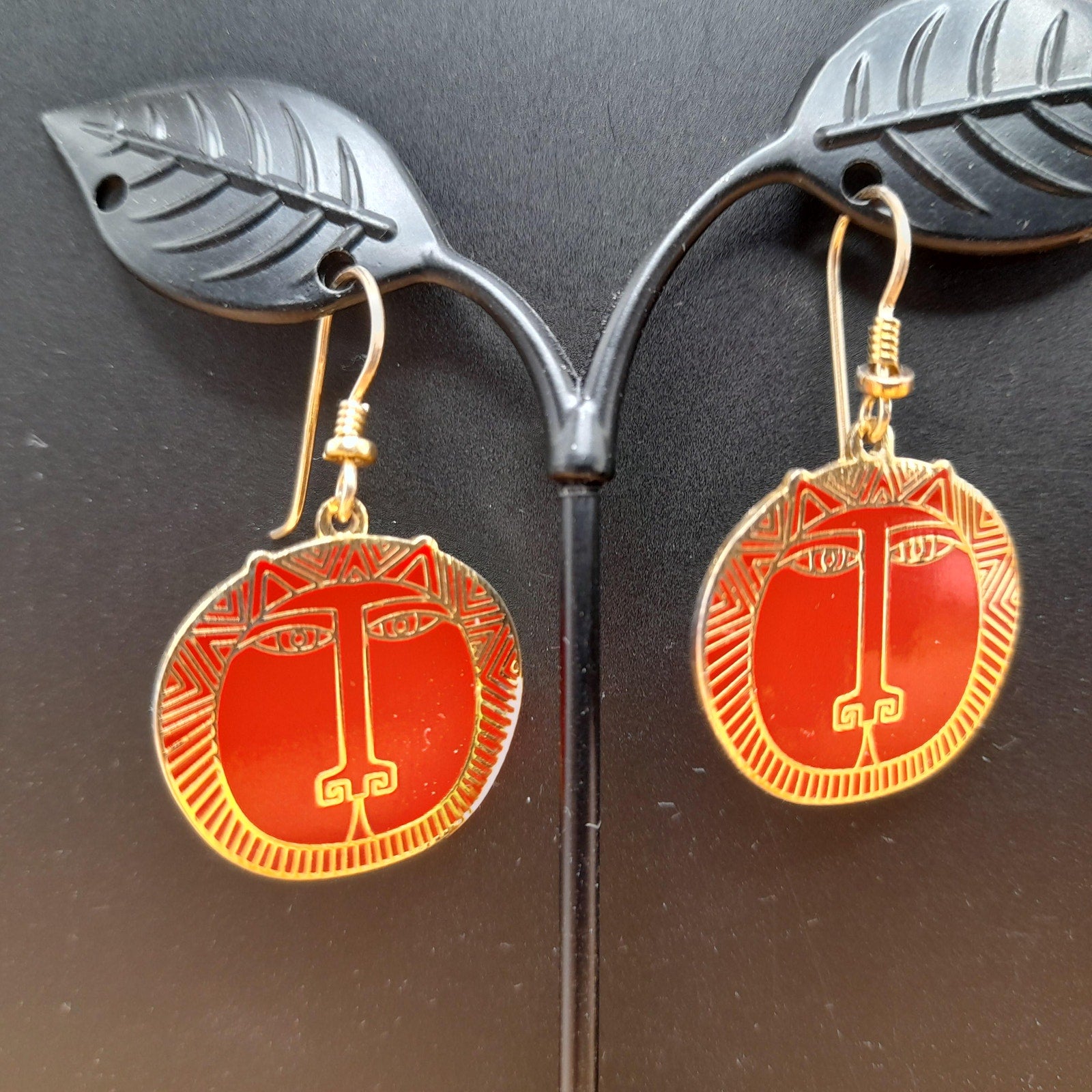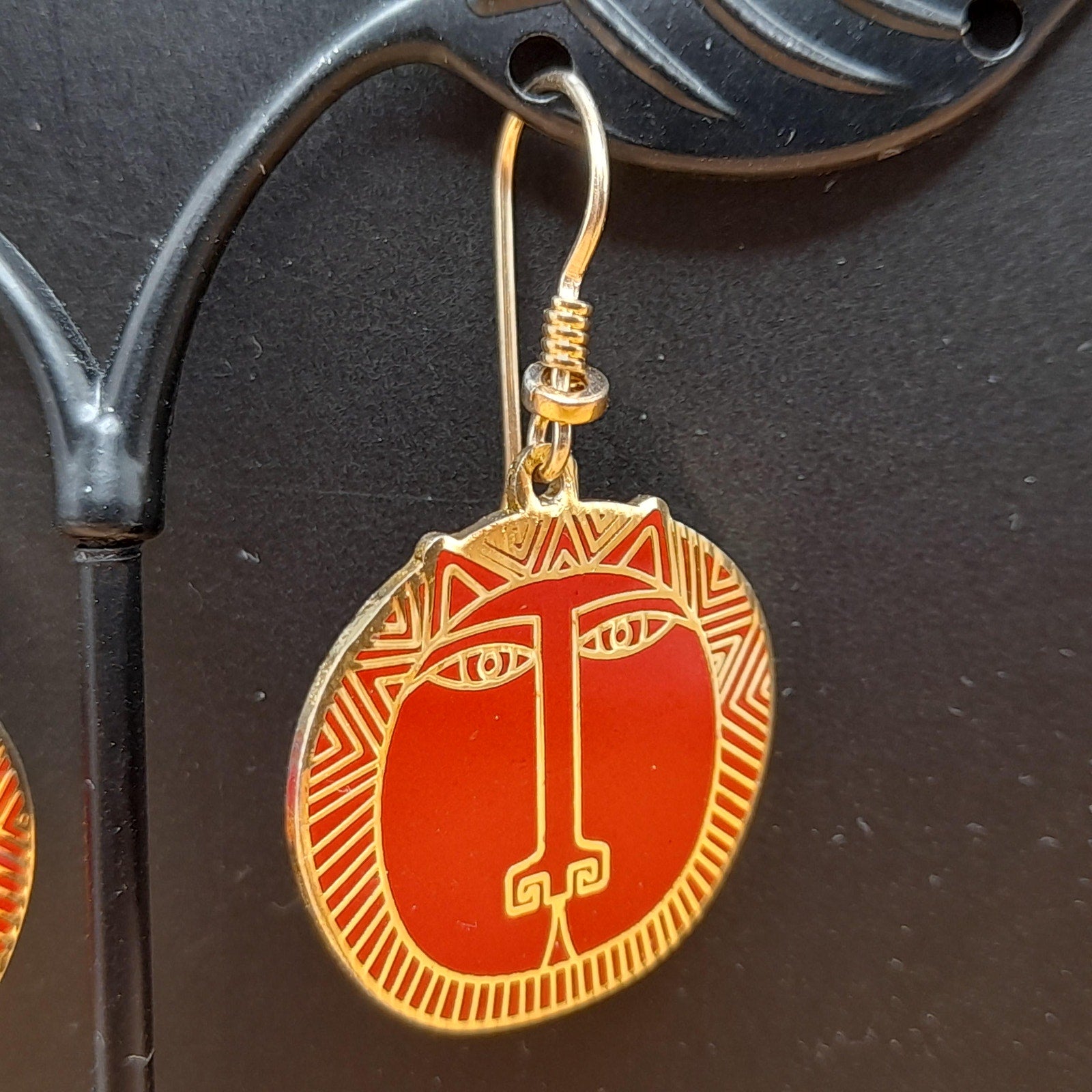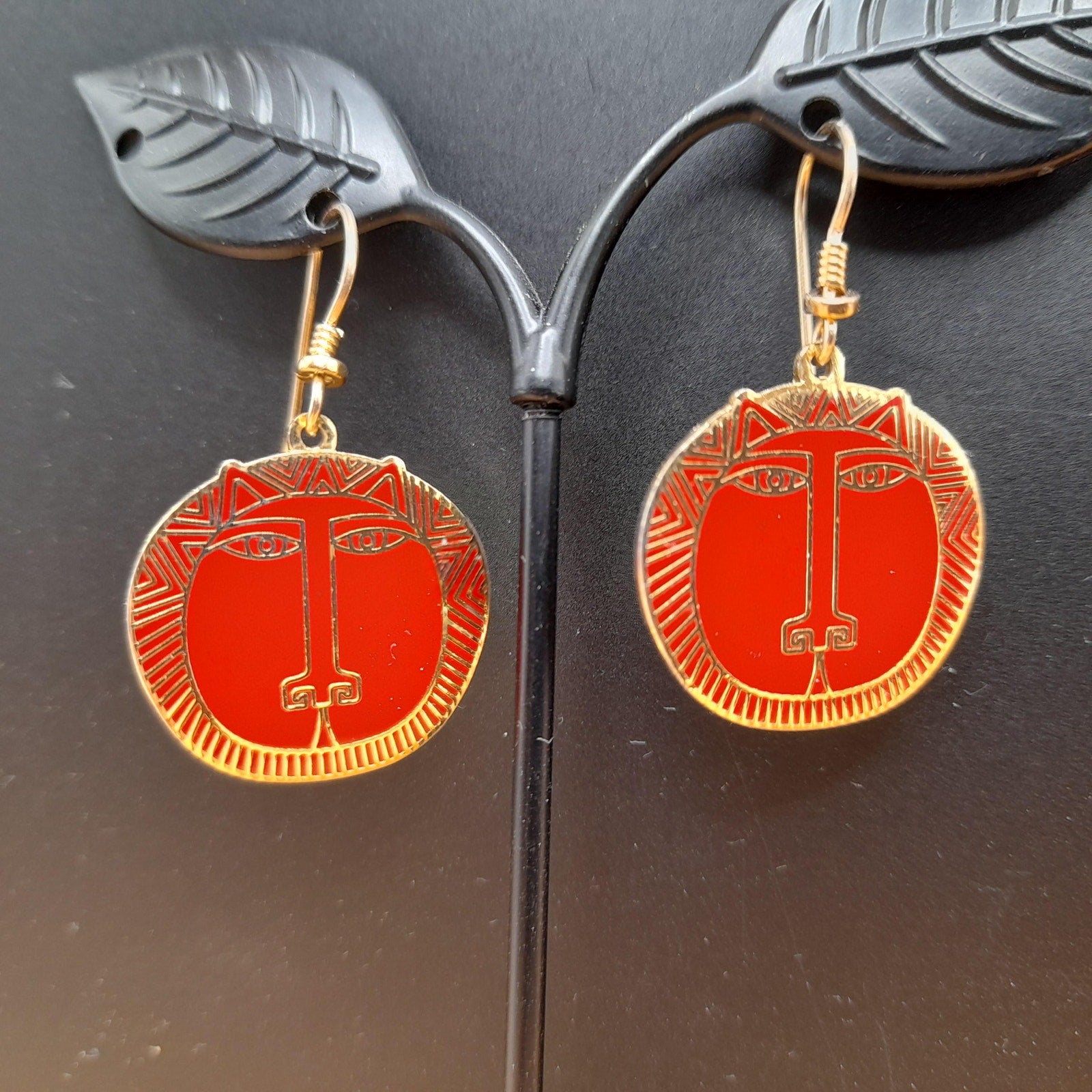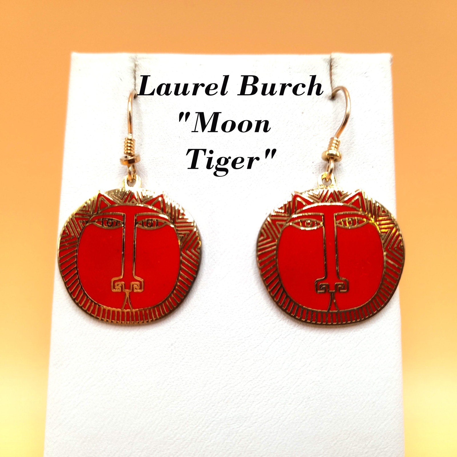 *Description: This is a great Laurel Burch pair of "Moon Tiger" drop earrings in red enamel; all on gold plated and cloisonné tiger heads from the 1980s. This is a great pair of earrings for tiger, cat, and animal lovers. This would be a great addition to your vintage jewelry collection or make a great vintage gift!