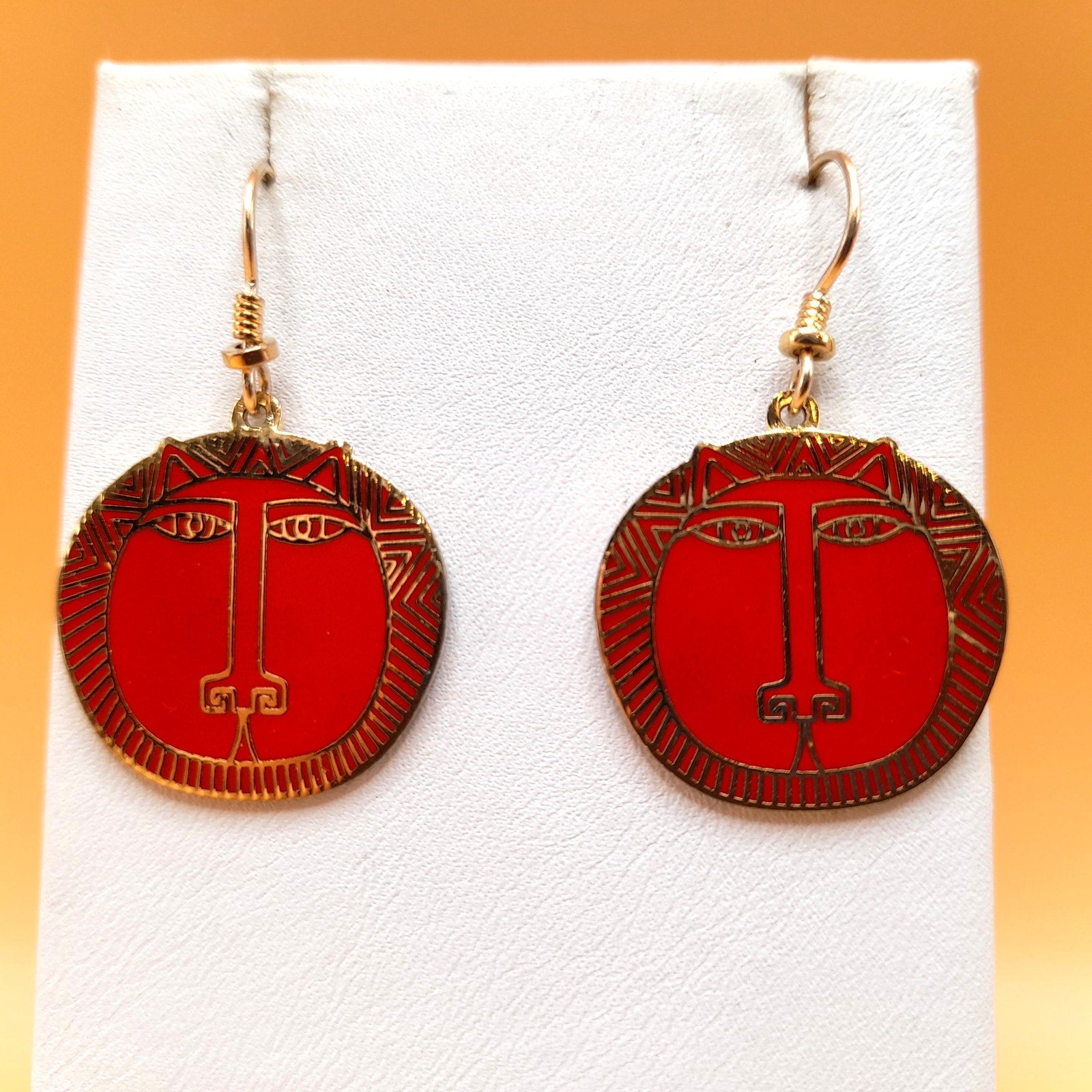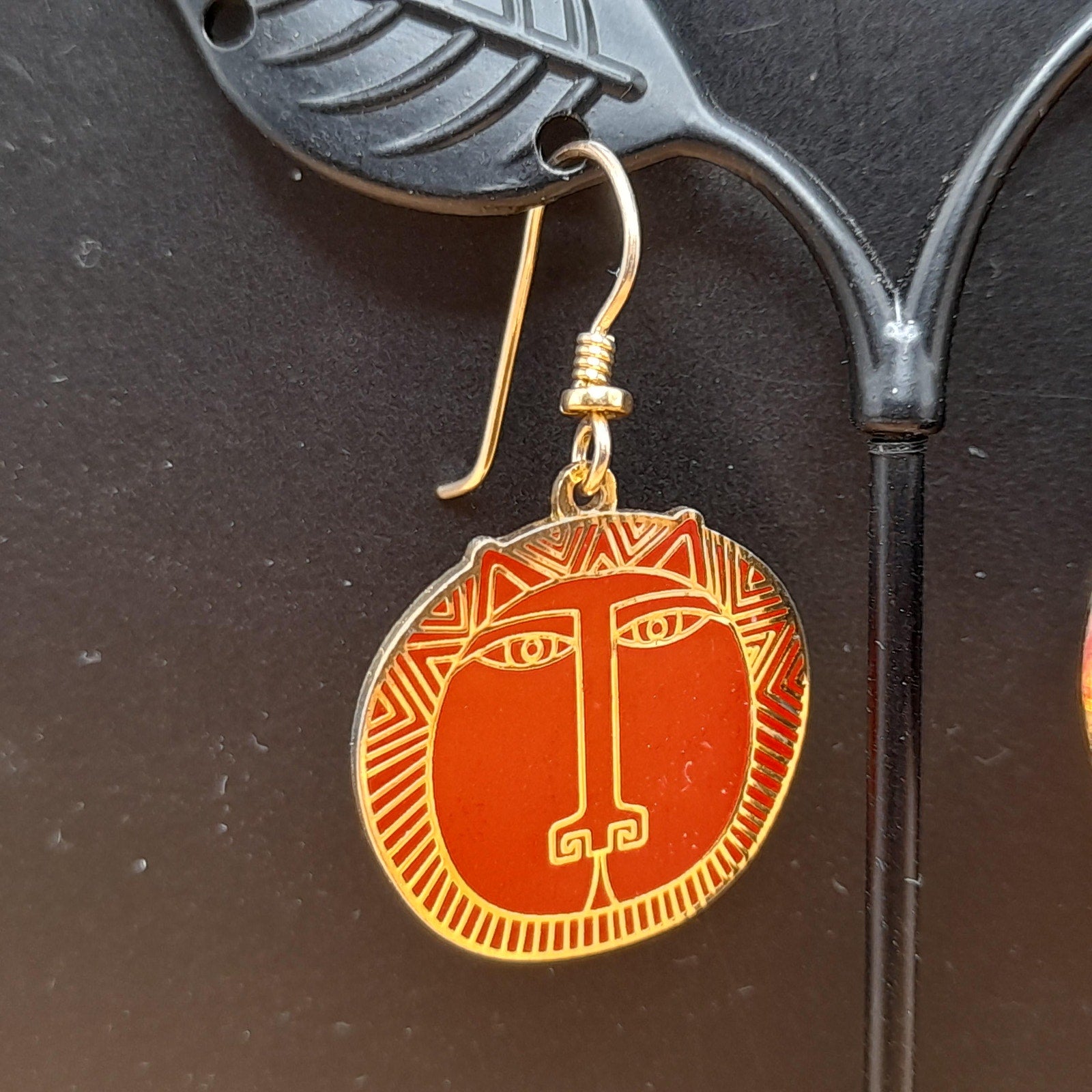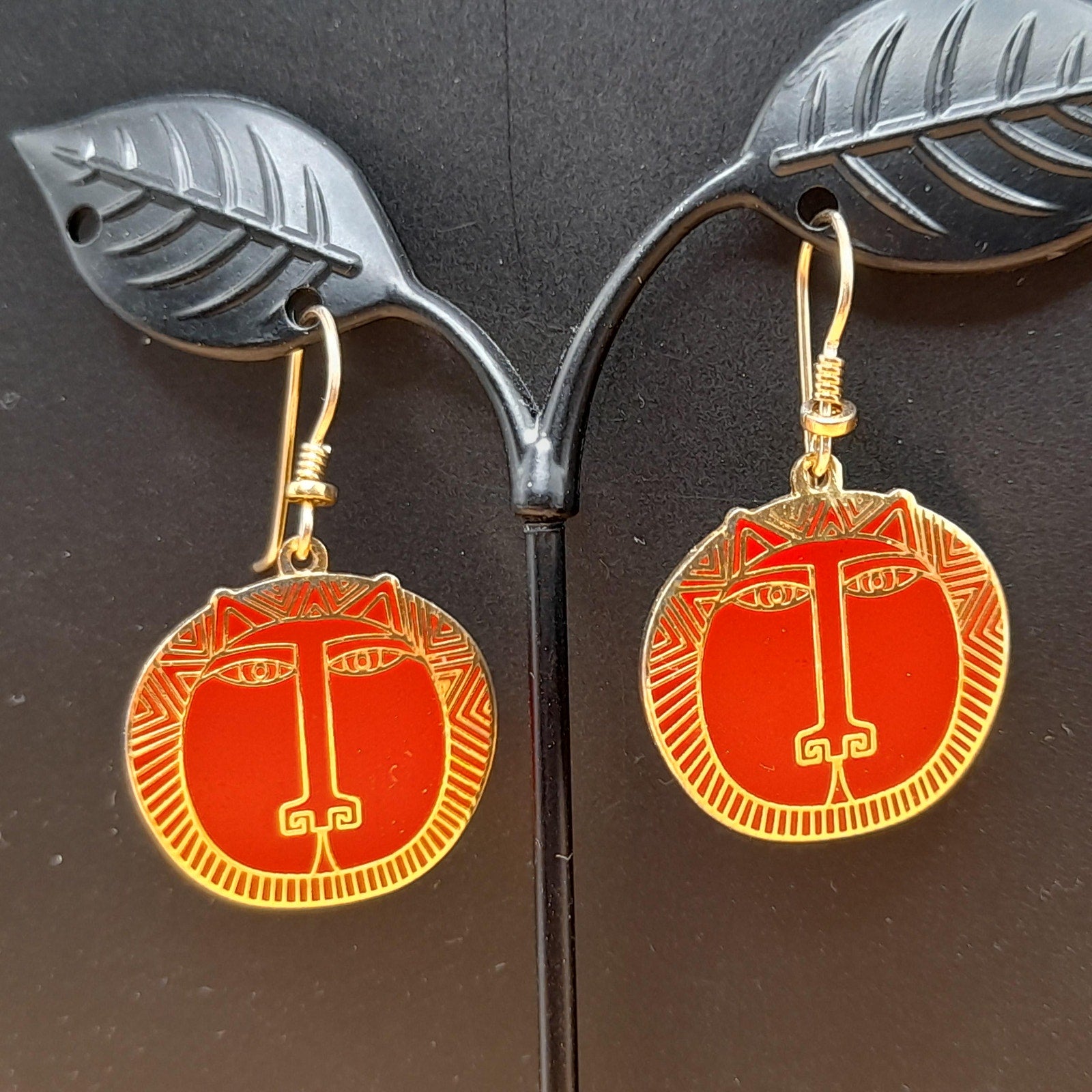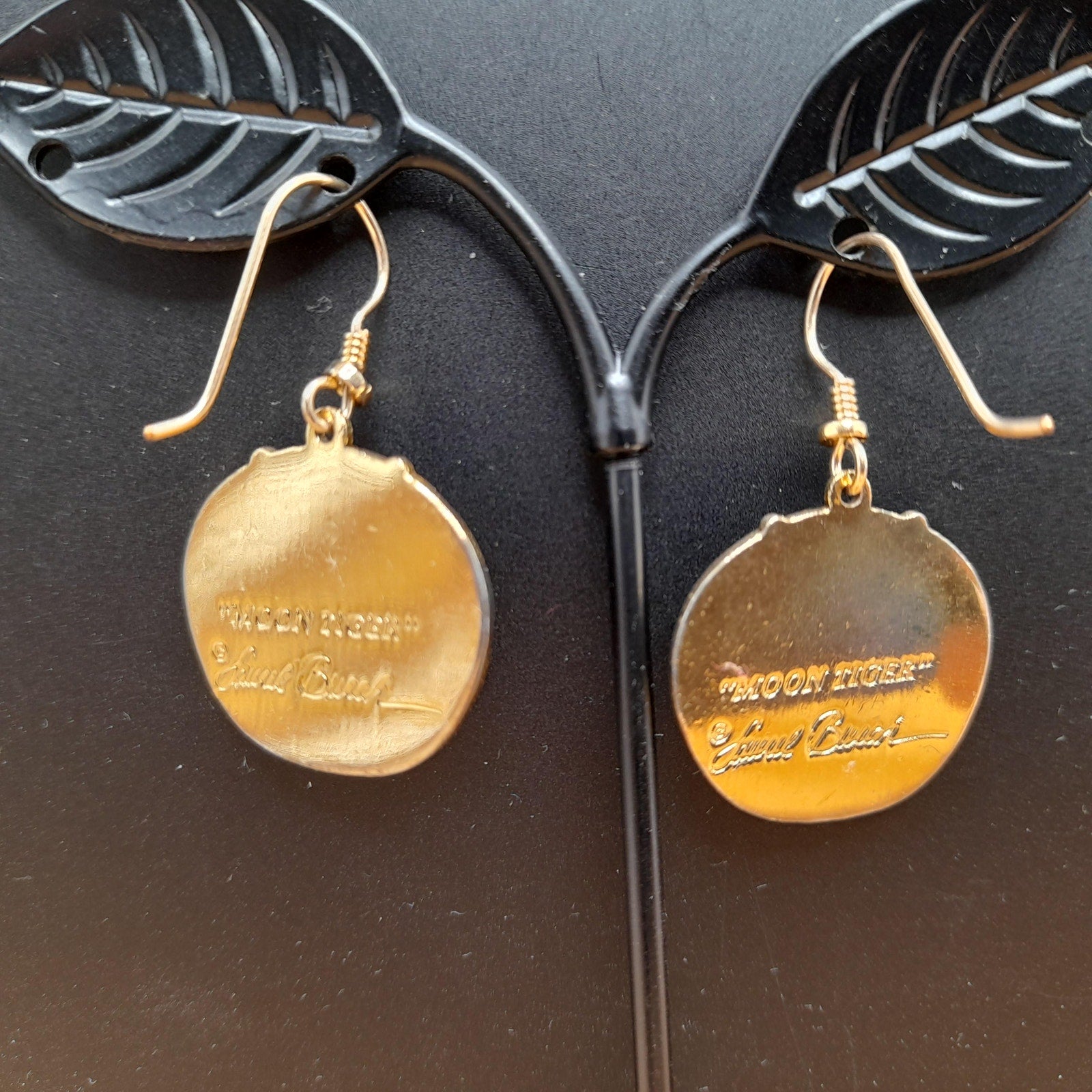 *Description: This is a great Laurel Burch pair of "Moon Tiger" drop earrings in red enamel; all on gold plated and cloisonné tiger heads from the 1980s. This is a great pair of earrings for tiger, cat, and animal lovers. This would be a great addition to your vintage jewelry collection or make a great vintage gift!