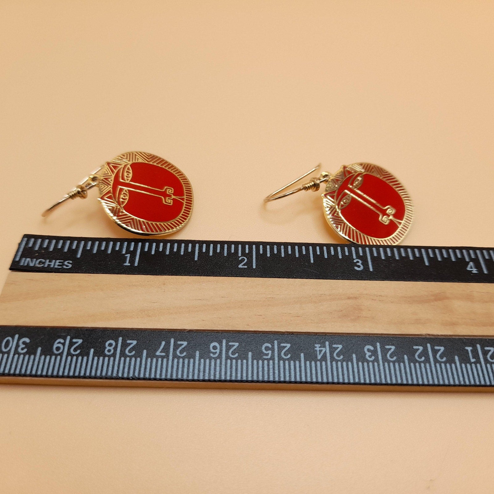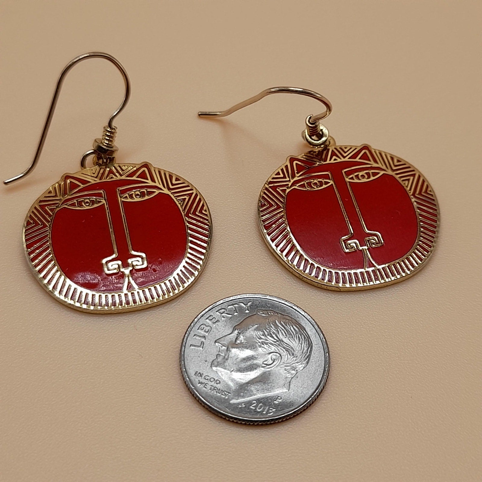 Laurel Burch "Moon Tiger" Red Drop Earrings, Gold Plated Cloisonné, Red Enamel, 1980s Vintage Jewelry