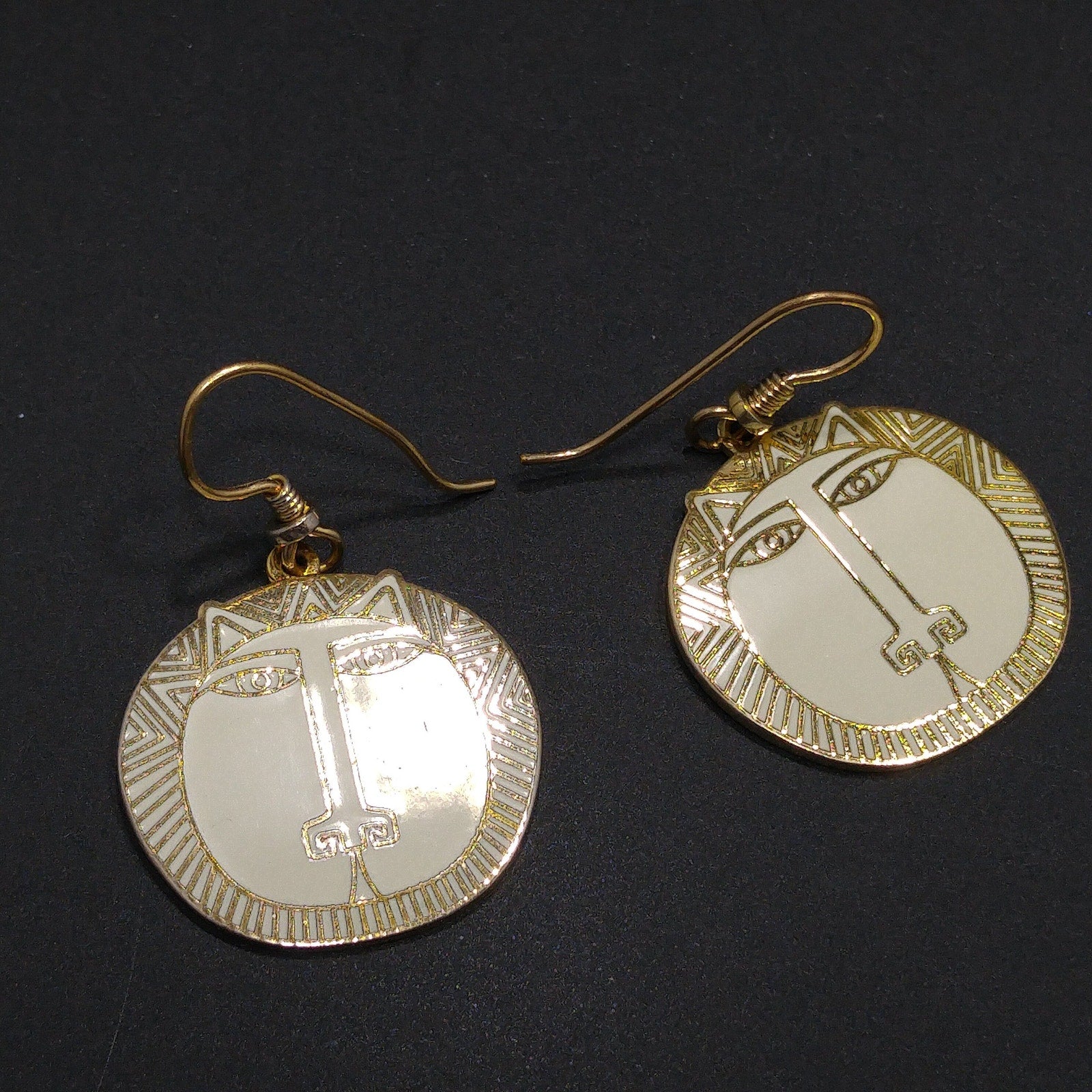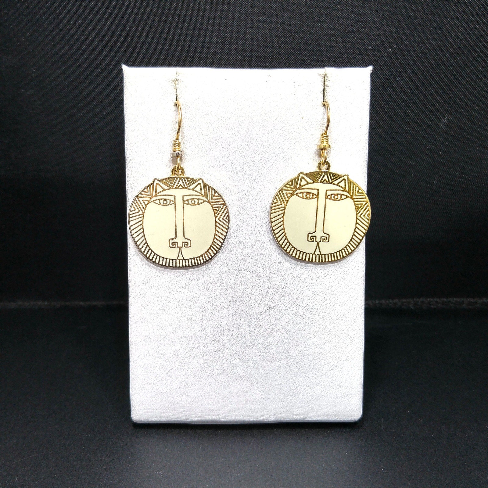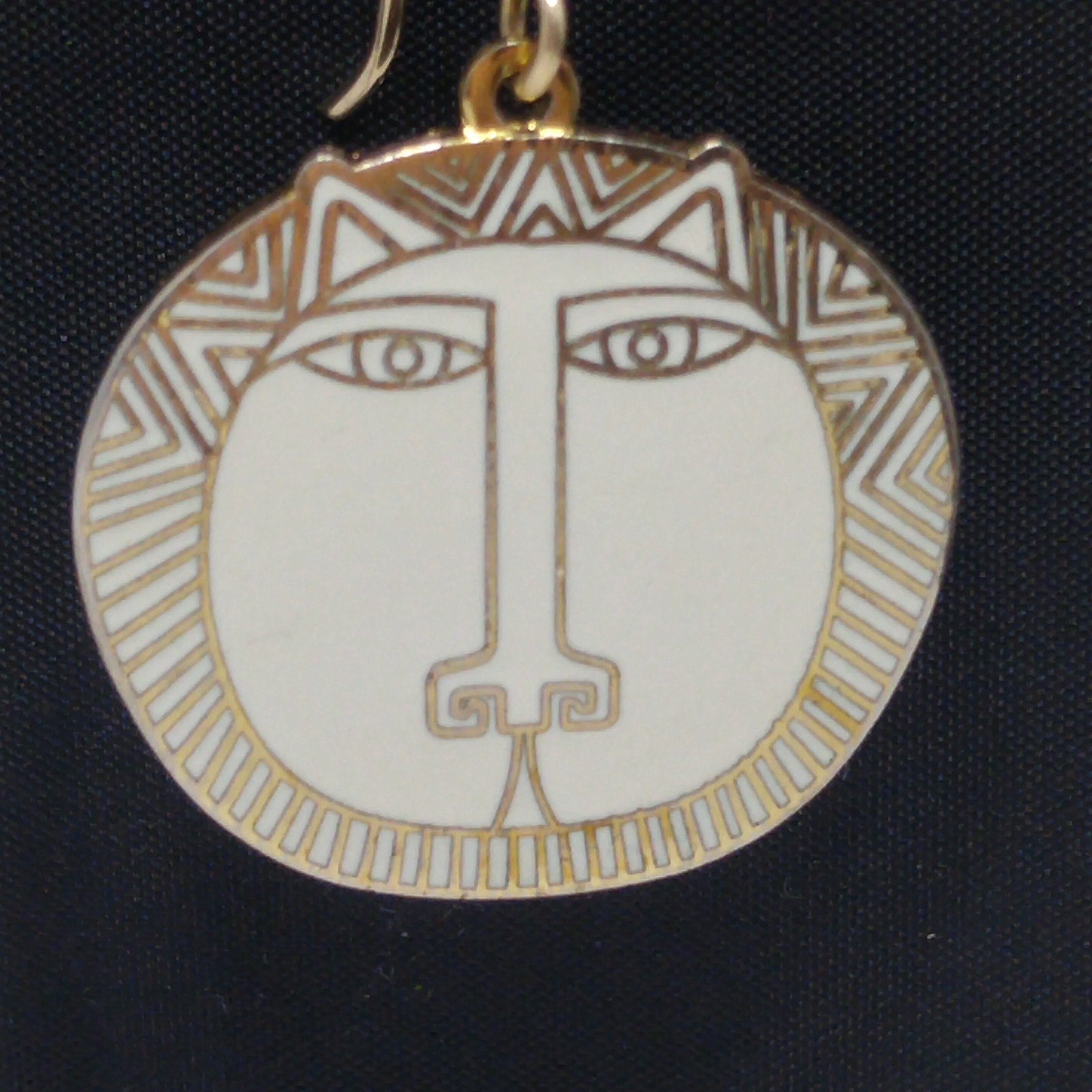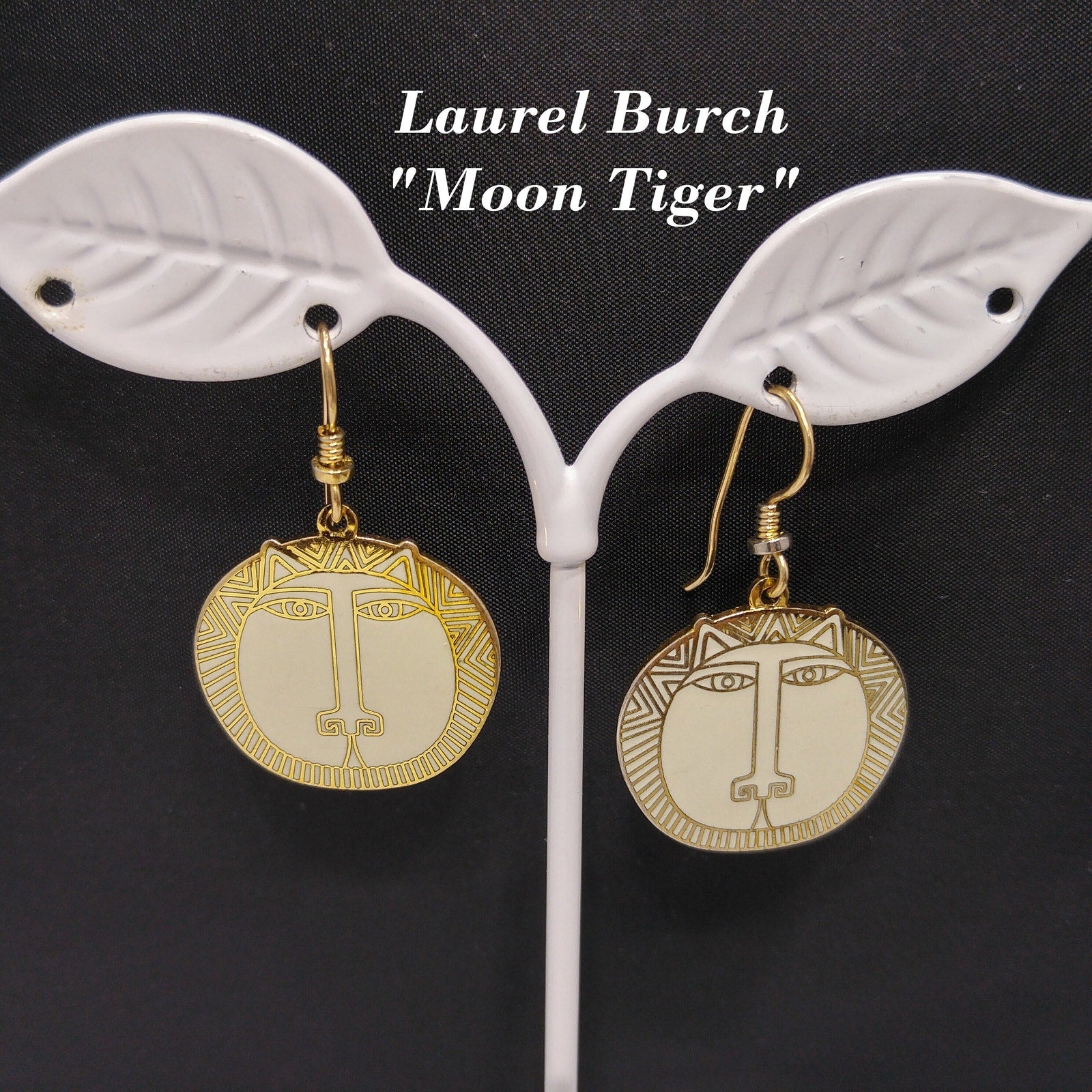 *Description: This is a great Laurel Burch pair of "Moon Tiger" drop earrings in creamy white enamel; all on gold plated and cloisonné tiger heads from the 1980s. This is a great pair of earrings for tiger, cat, and animal lovers. Due to the neutral color of the enamel, this is a perfect pair of earrings to wear with many outfits. This would be a great addition to your vintage jewelry collection or make a great vintage gift!