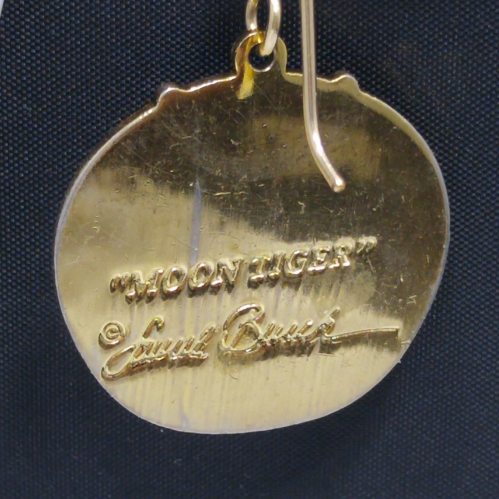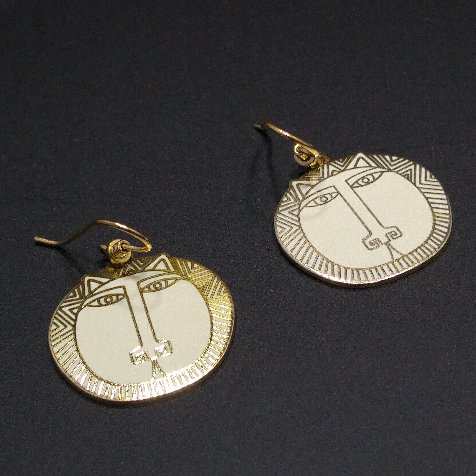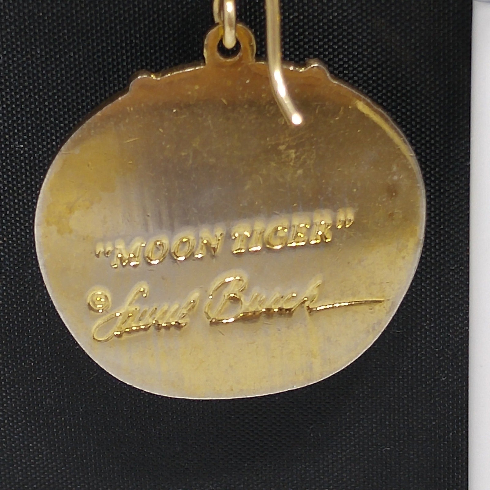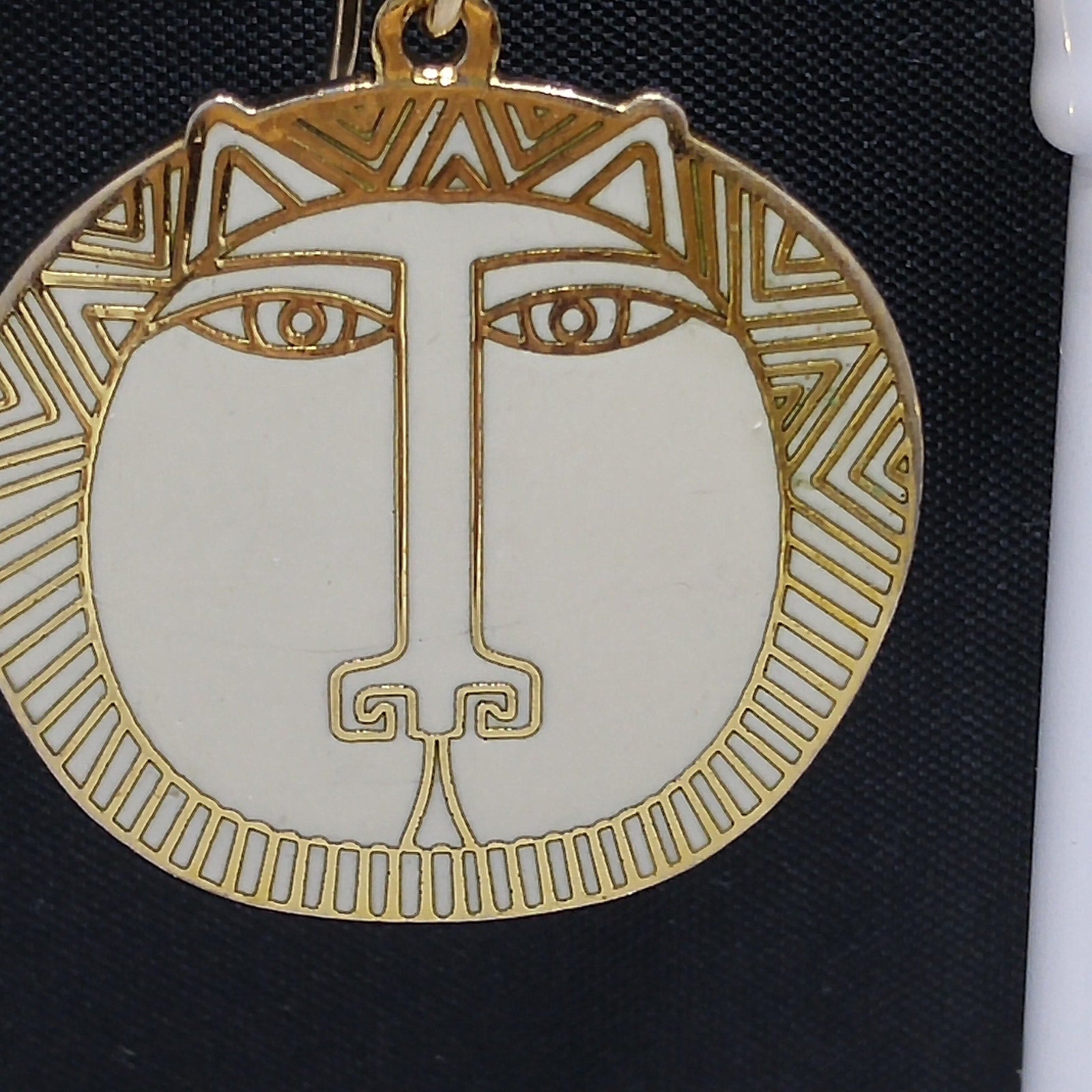 *Description: This is a great Laurel Burch pair of "Moon Tiger" drop earrings in creamy white enamel; all on gold plated and cloisonné tiger heads from the 1980s. This is a great pair of earrings for tiger, cat, and animal lovers. Due to the neutral color of the enamel, this is a perfect pair of earrings to wear with many outfits. This would be a great addition to your vintage jewelry collection or make a great vintage gift!