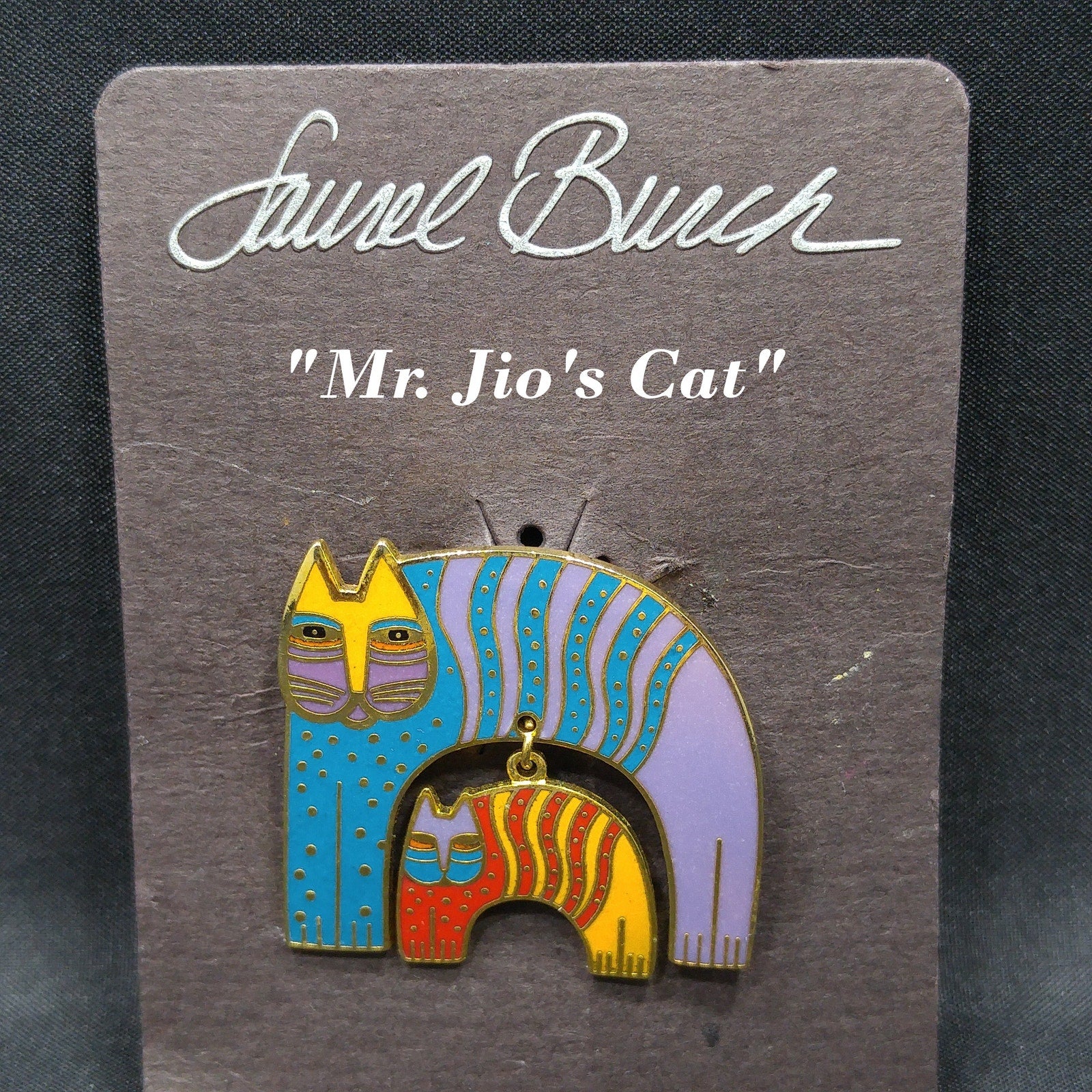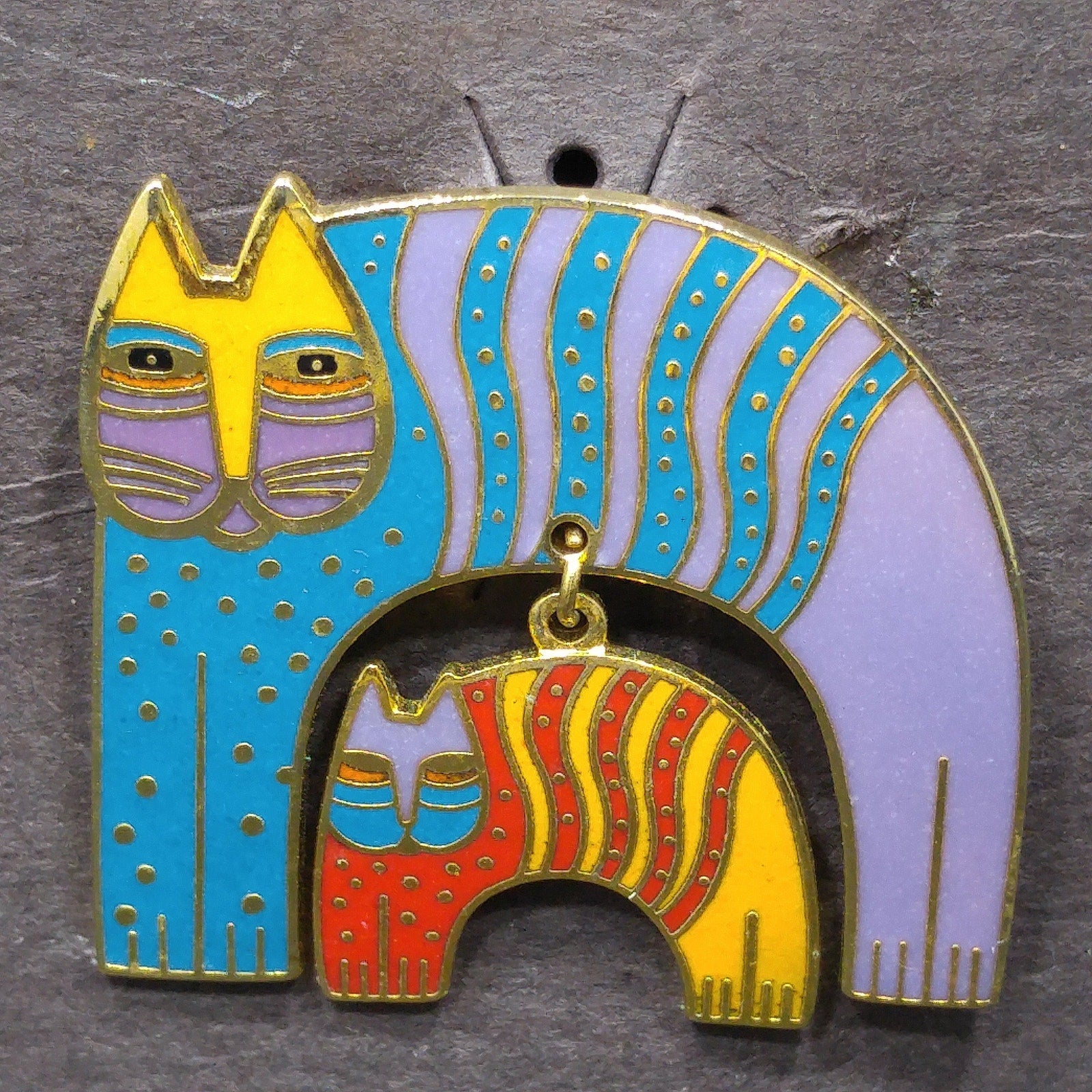 *Description: This is a great brooch by Laurel Burch in the shape of a multicolored cat and it's kitten standing below from the 1980s. The kitten is hanging from the belly of the adult cat like a charm. It is the same shape with matching colors and smaller size. The brooch is gold plated cloisonne with enamel in lavender, teal, golden yellow, and red. It is stamped Laurel Burch and Mr. Jio's Cat on the back and it is still on it's original card from the 80s. This would be a great addition to your vintage jewelry collection or make a great vintage gift!