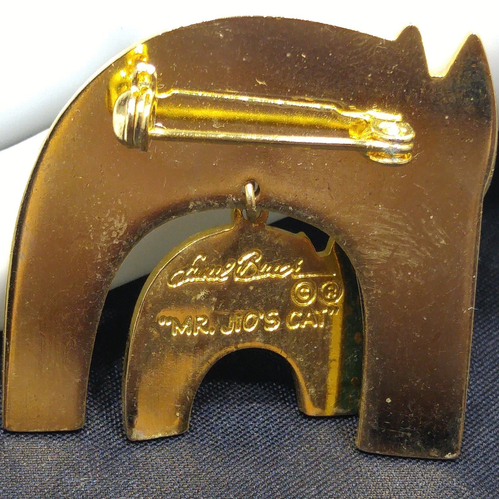 Laurel Burch "Mr. Jio's Cat" Brooch with Dangling Cat Charm, Gold Plated, Cloisonne Enamel, 1980s Vintage Jewelry