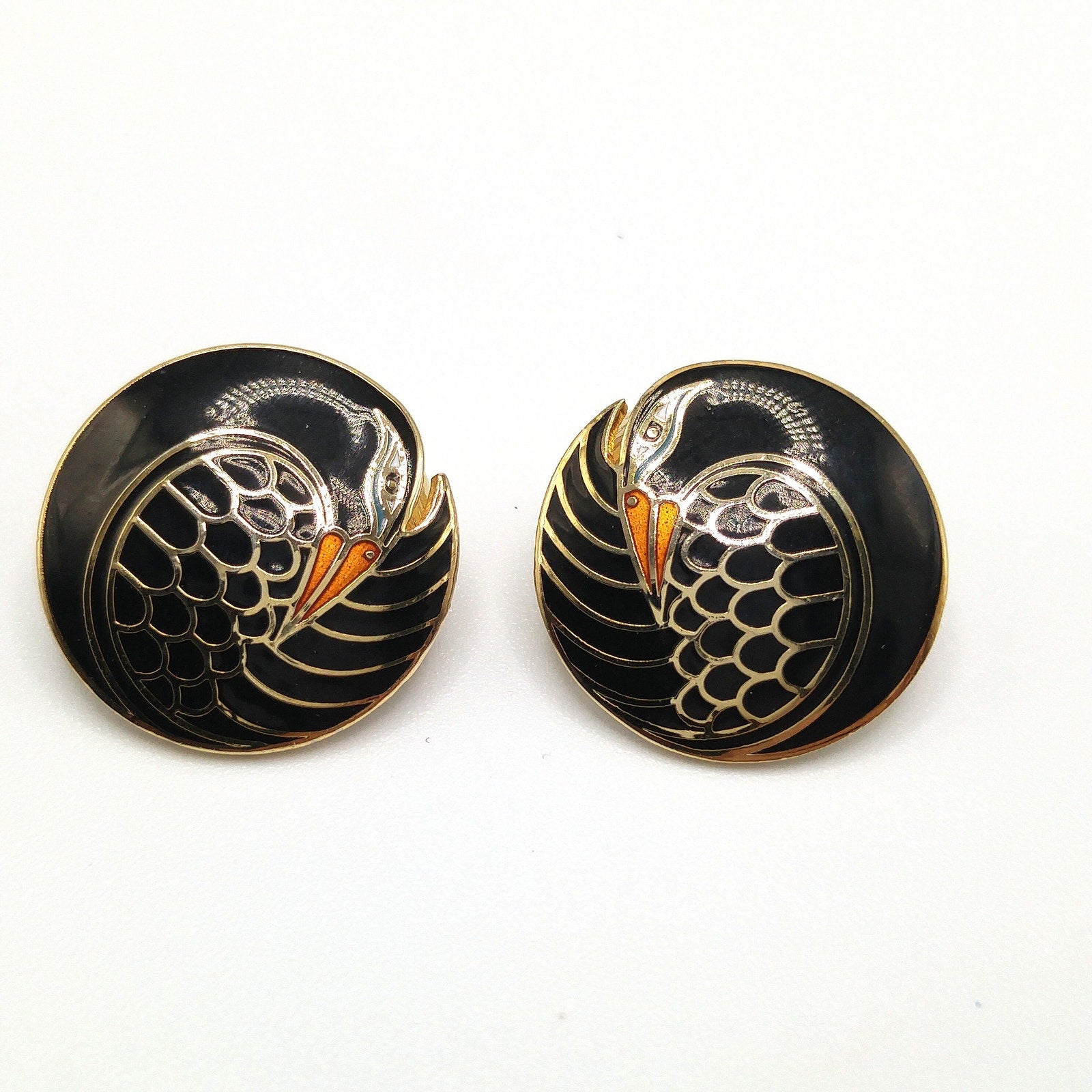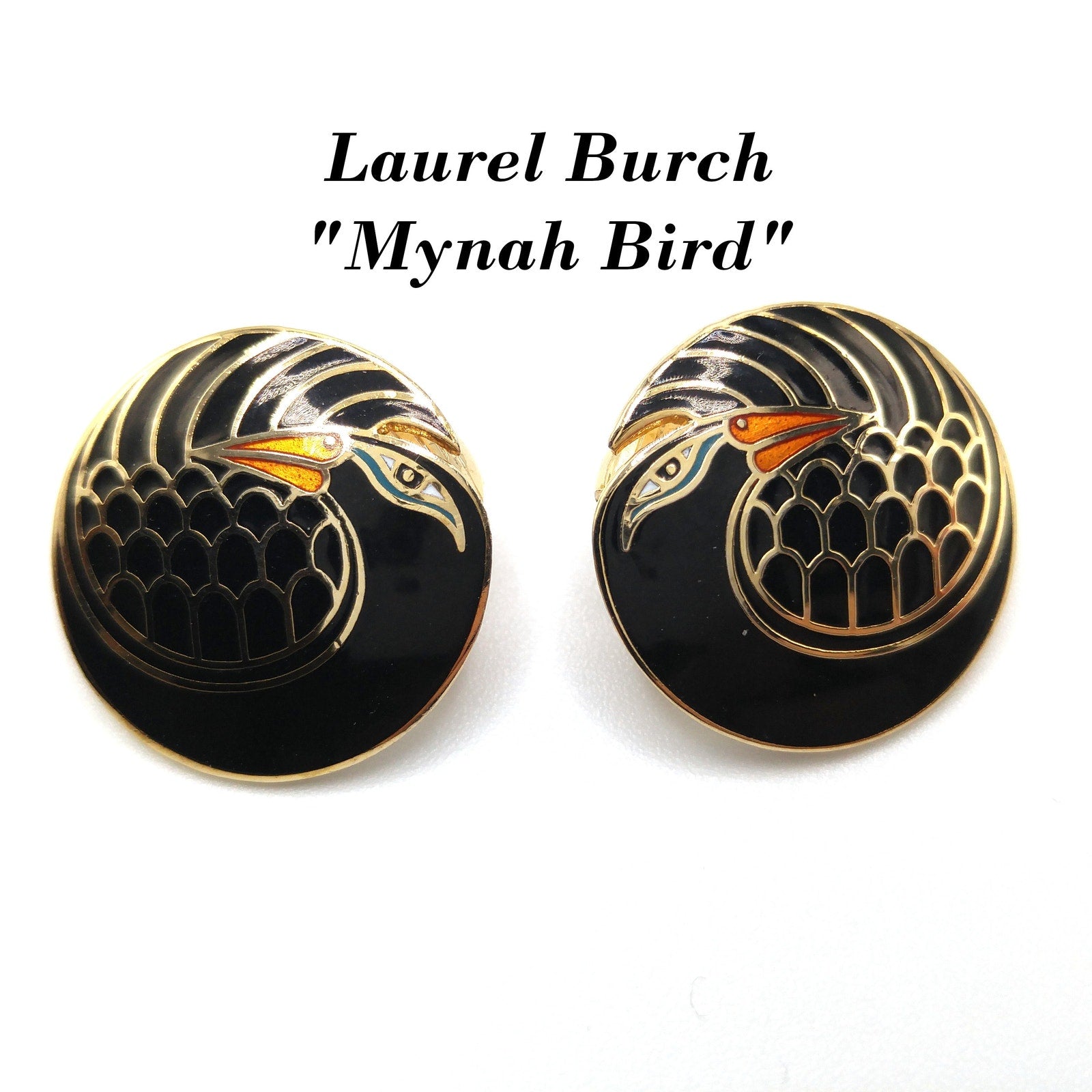 *Description: This is a beautiful pair of vintage Laurel Burch clip on earrings with cloisonné black and orange enamel & gold plate from the 1980s. The earrings are entitled "Mynah Bird" and are designed on a circle with a little cut out between the bird's head and feathers. The bird is the black outlined with gold with an orange beak and its feathers are gold plated cloisonné outlines.