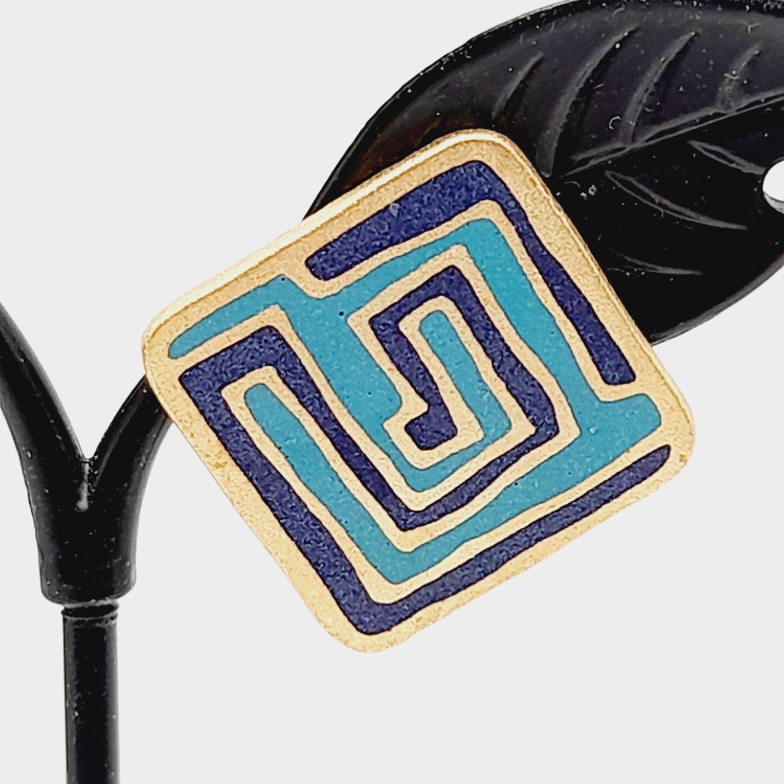 These vintage Laurel Burch “Mystery” earrings capture the designer’s iconic use of bold shapes and vibrant colors. The square posts feature a labyrinth-like geometric pattern in deep blue and teal enamel, outlined in gold plating.