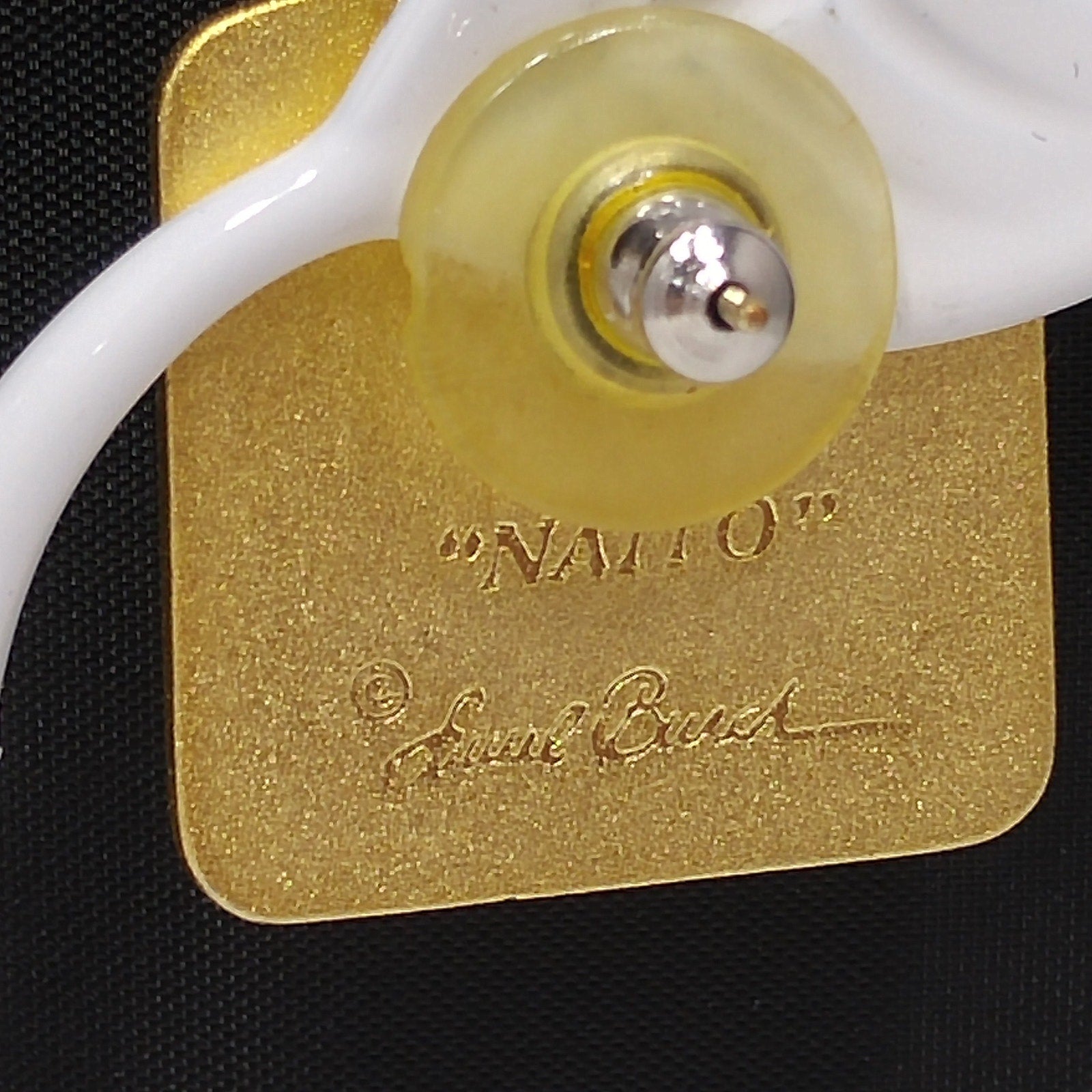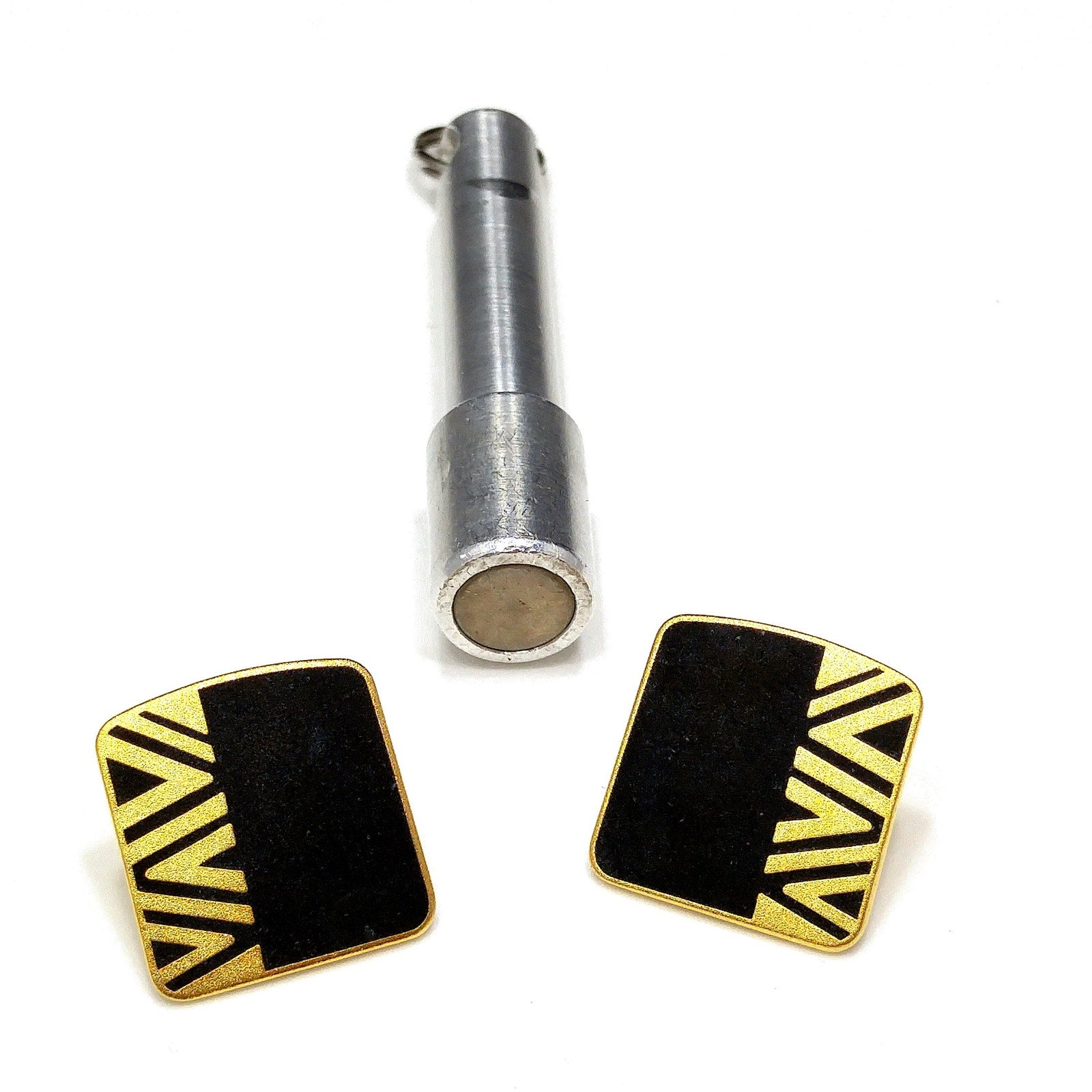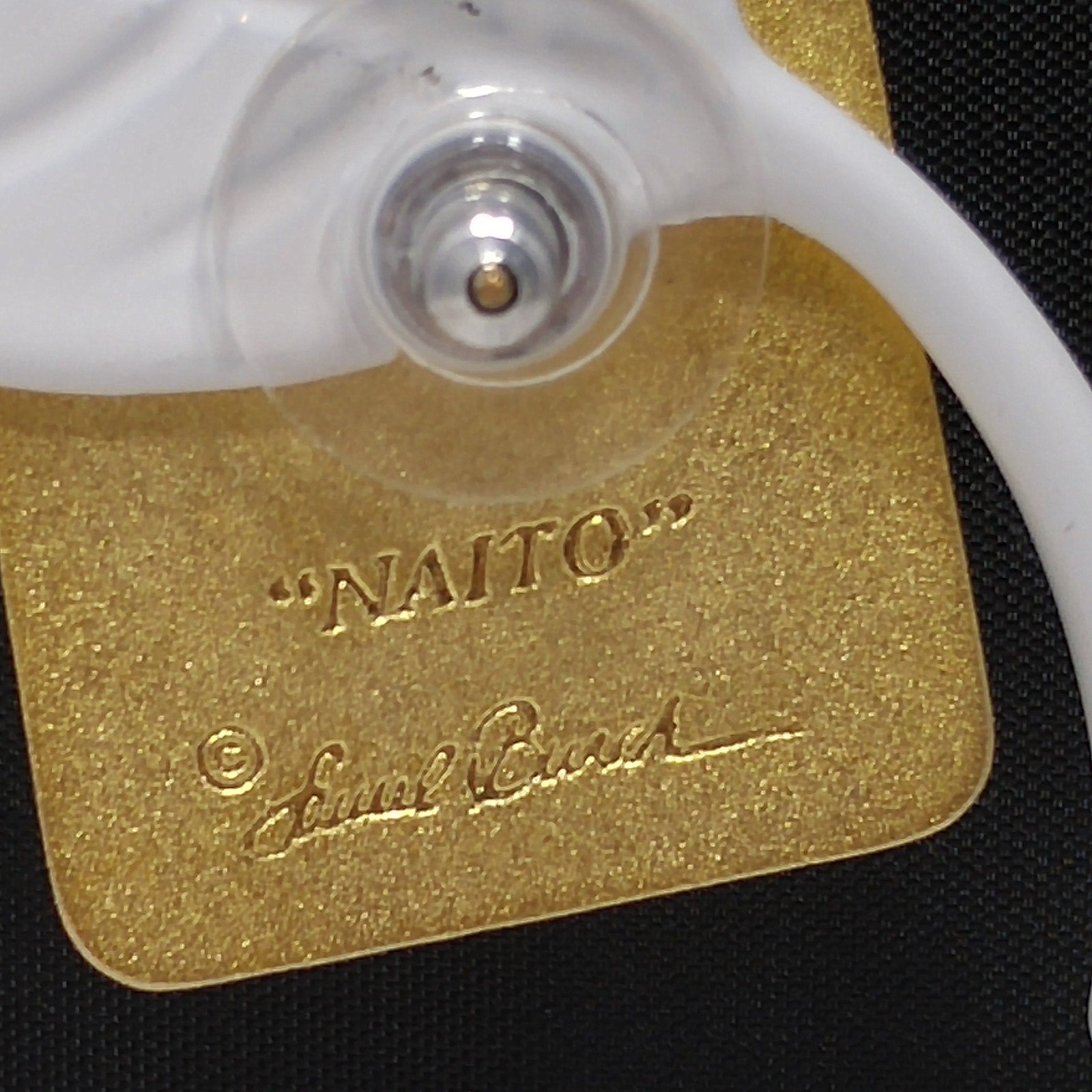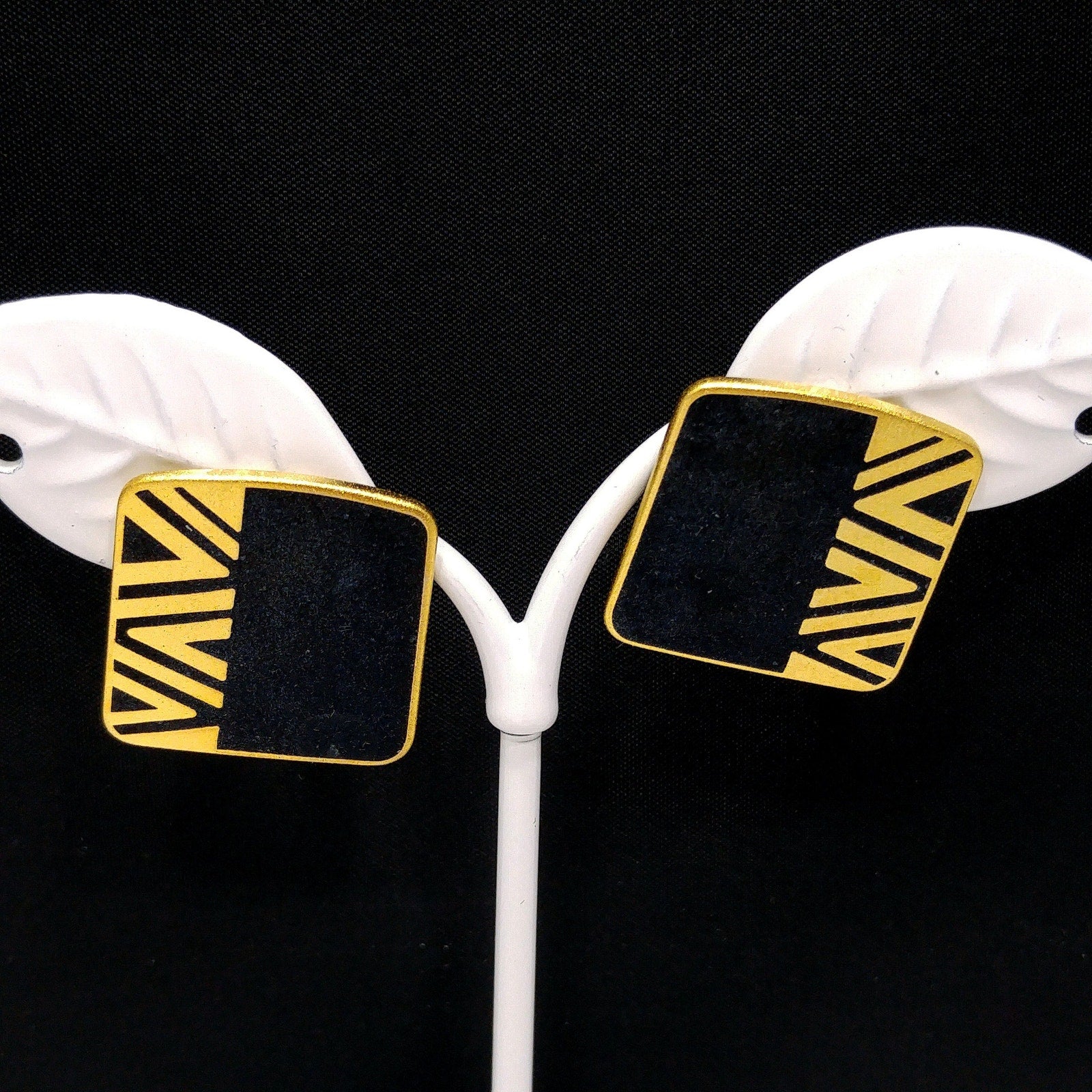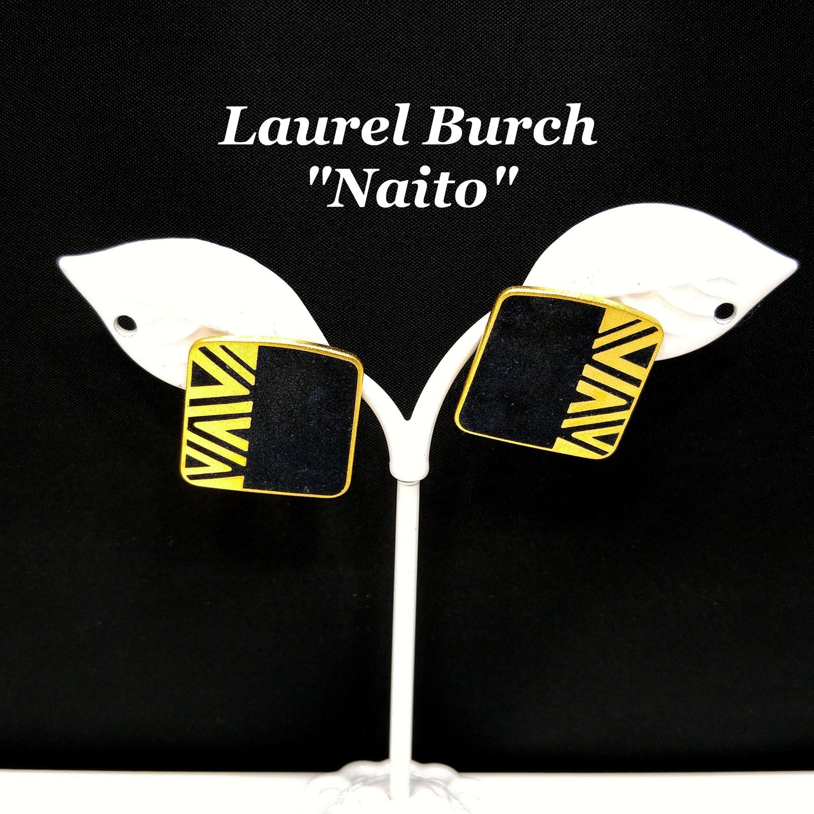 *Description: This is a beautiful pair of Laurel Burch vintage earrings entitled "Naito" from the 1980s. They have a gold plated geometric shape with black enamel. Neither the gold plate or the enamel is shiny, it has a more matte finish on each area. I tested the gold for gold plate and it was more than 10K gold surface. The inside metal is slightly magnetic. The earrings are both signed on the back with Laurel Burch and the design name "Naito". They are in great condition and would be a great addition to your vintage jewelry collection or make a great vintage gift!