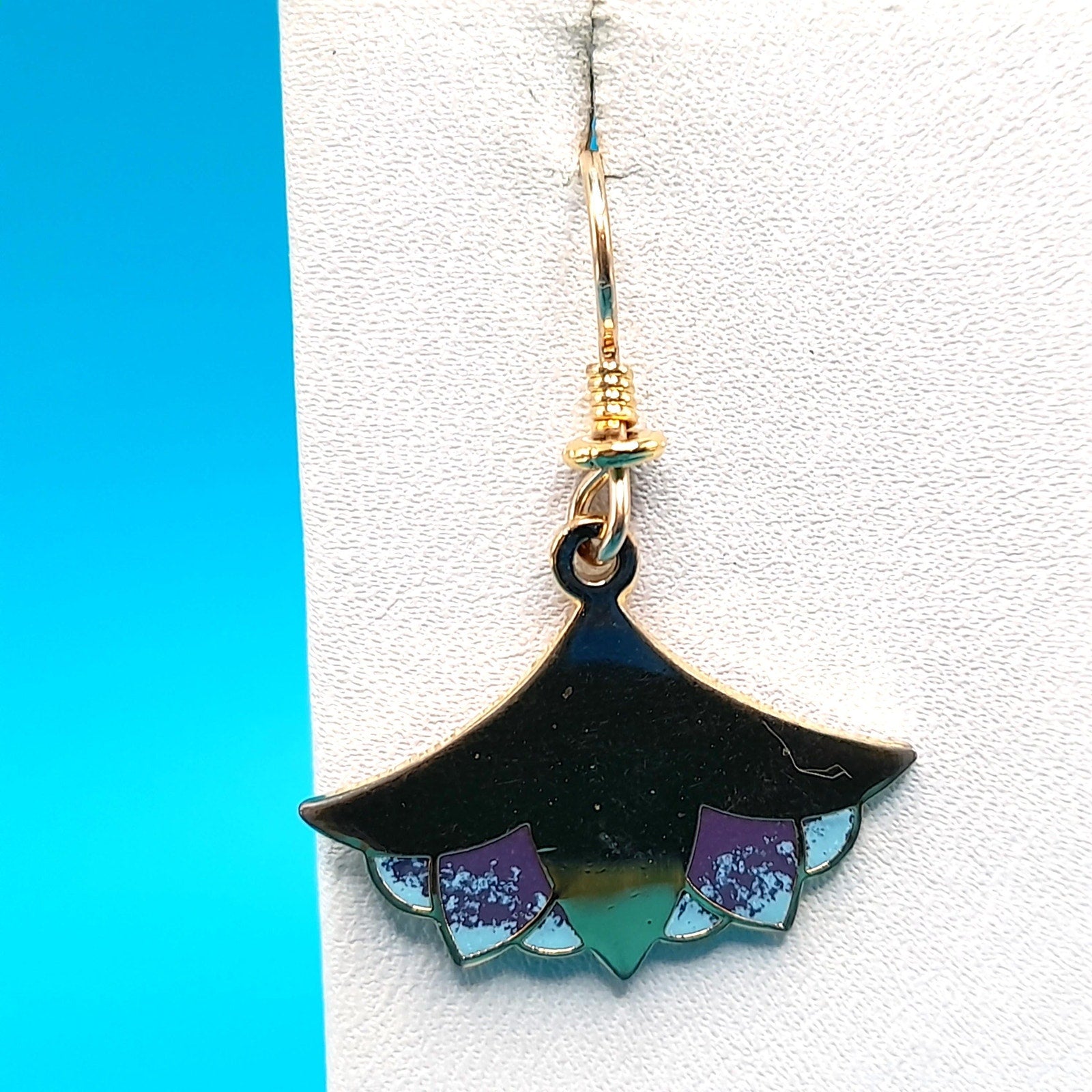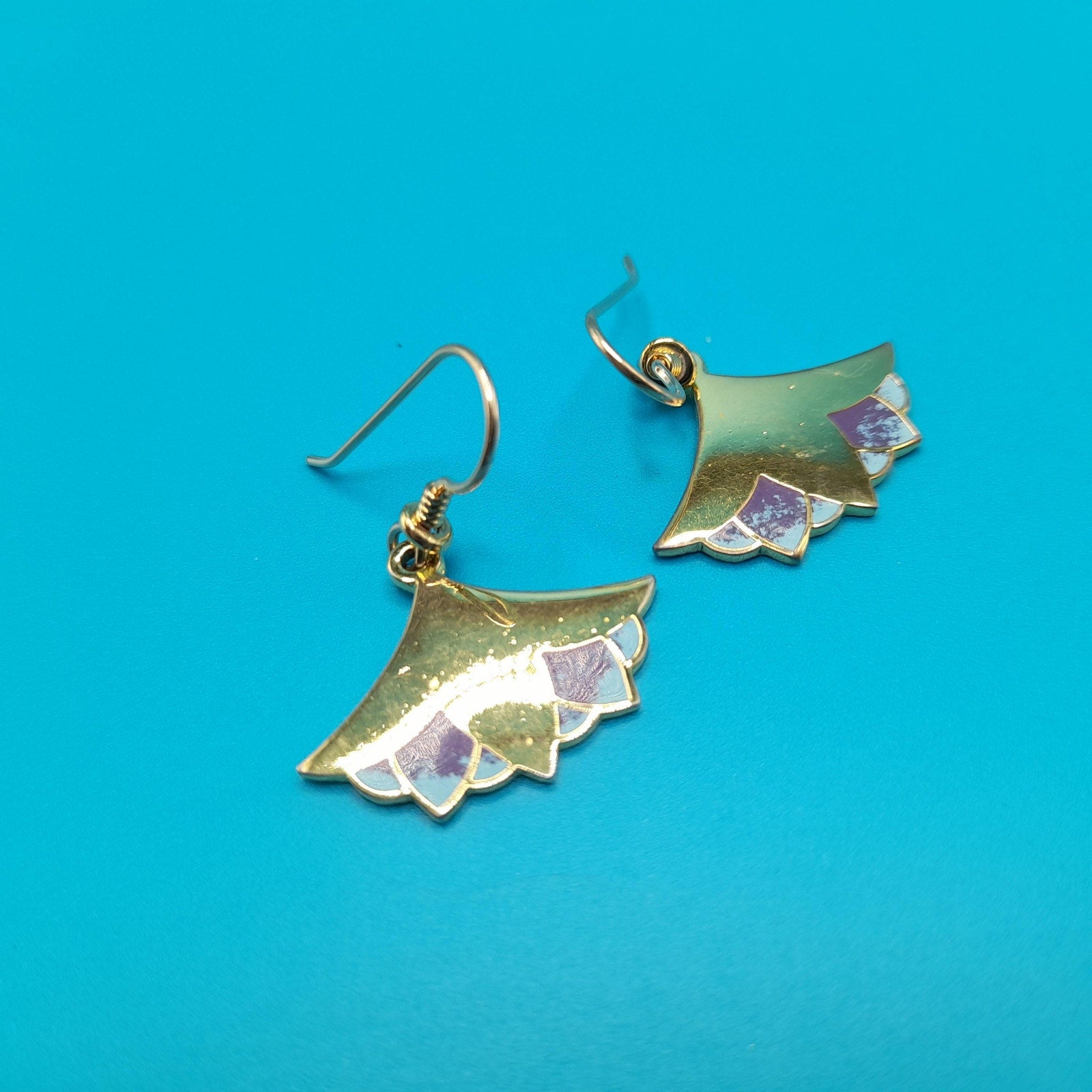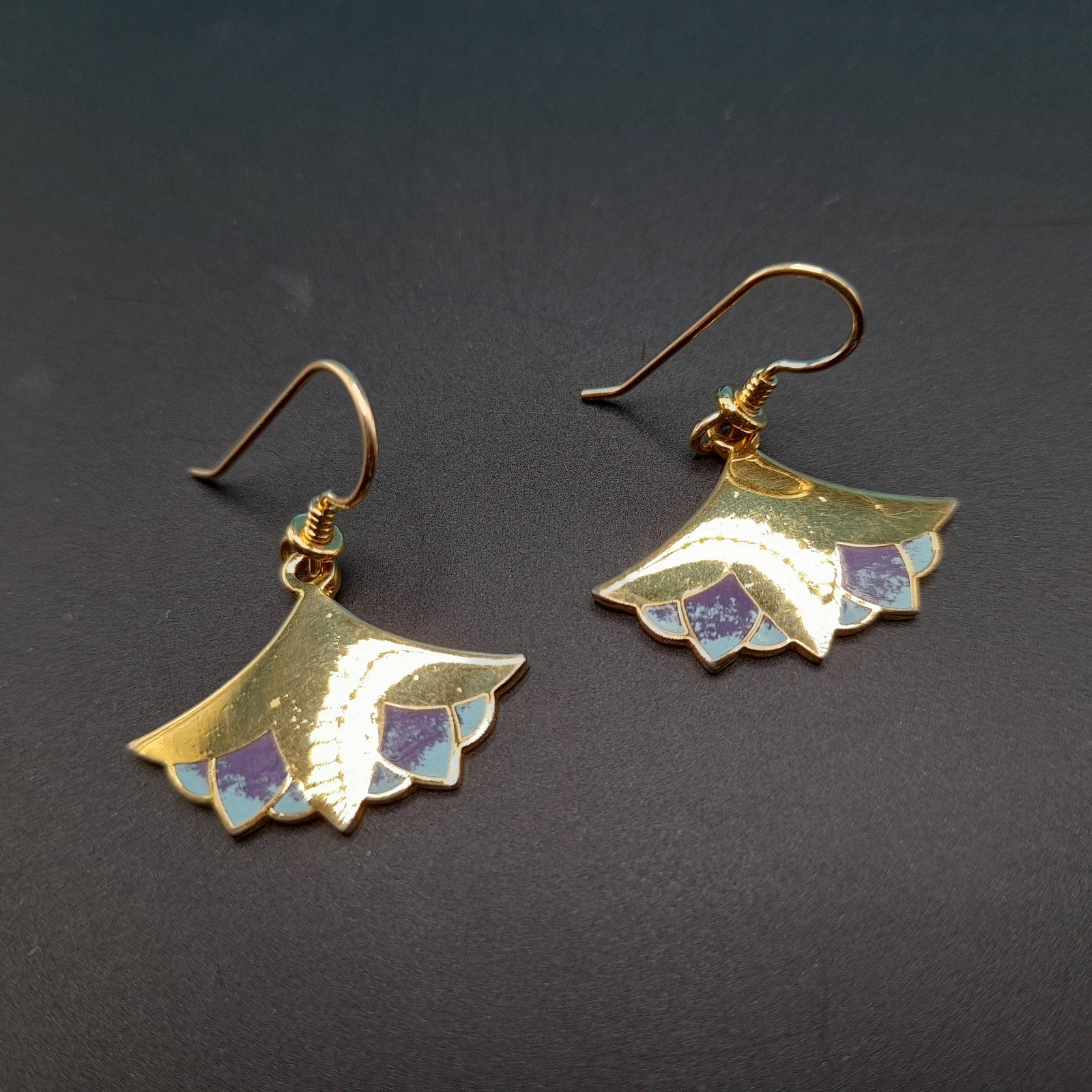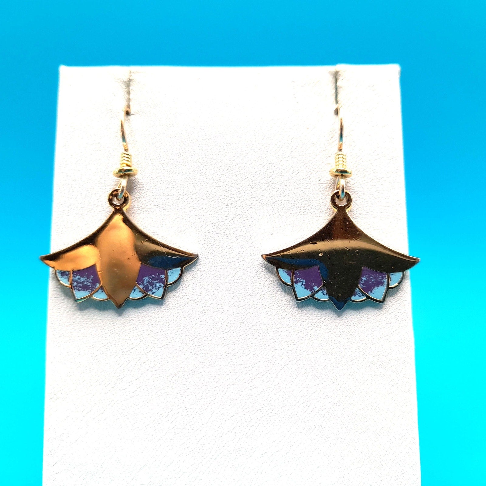 Laurel Burch "Nile Lotus" Drop Earrings, Gold Plated, Enamel Light Blue Purple, 1980s Vintage Jewelry