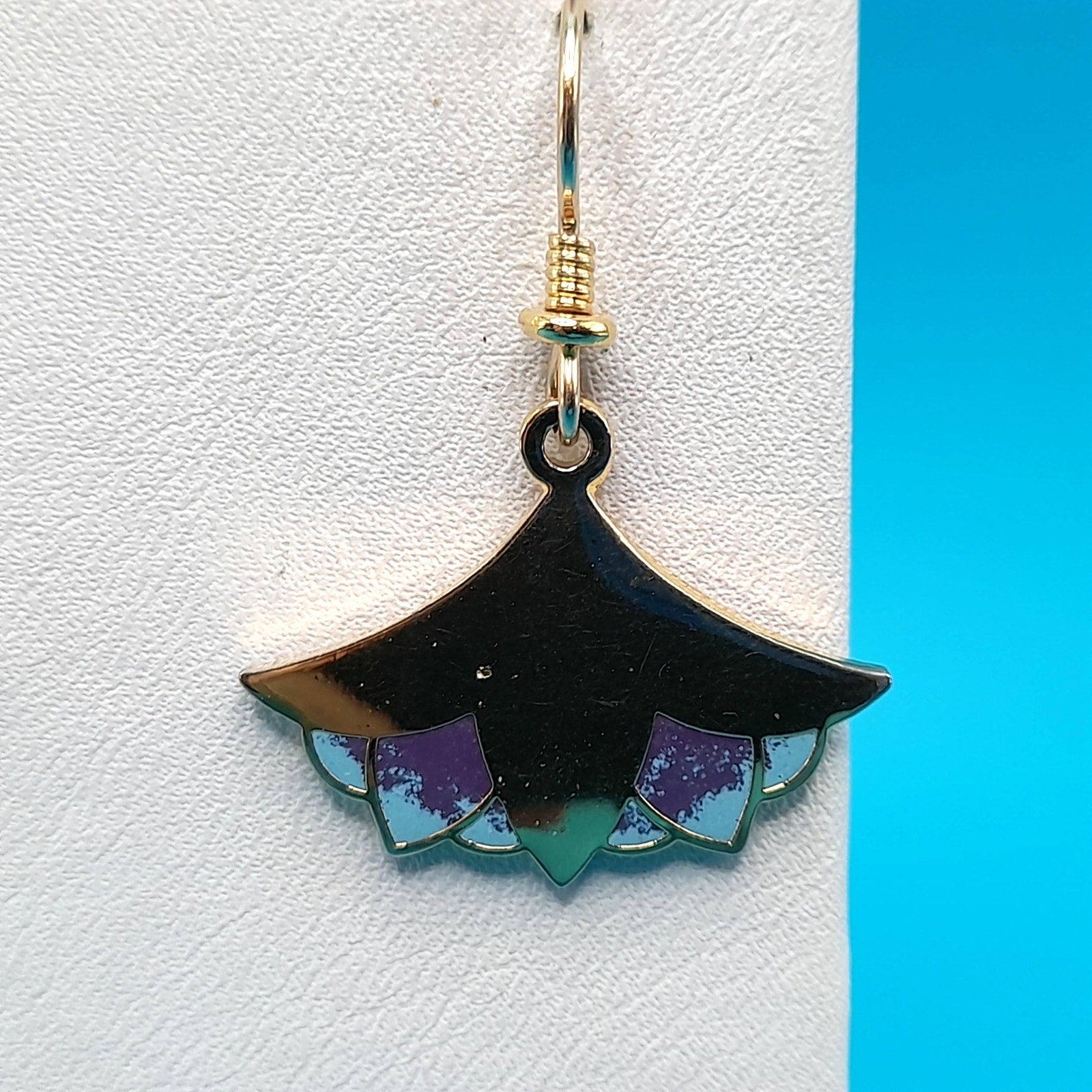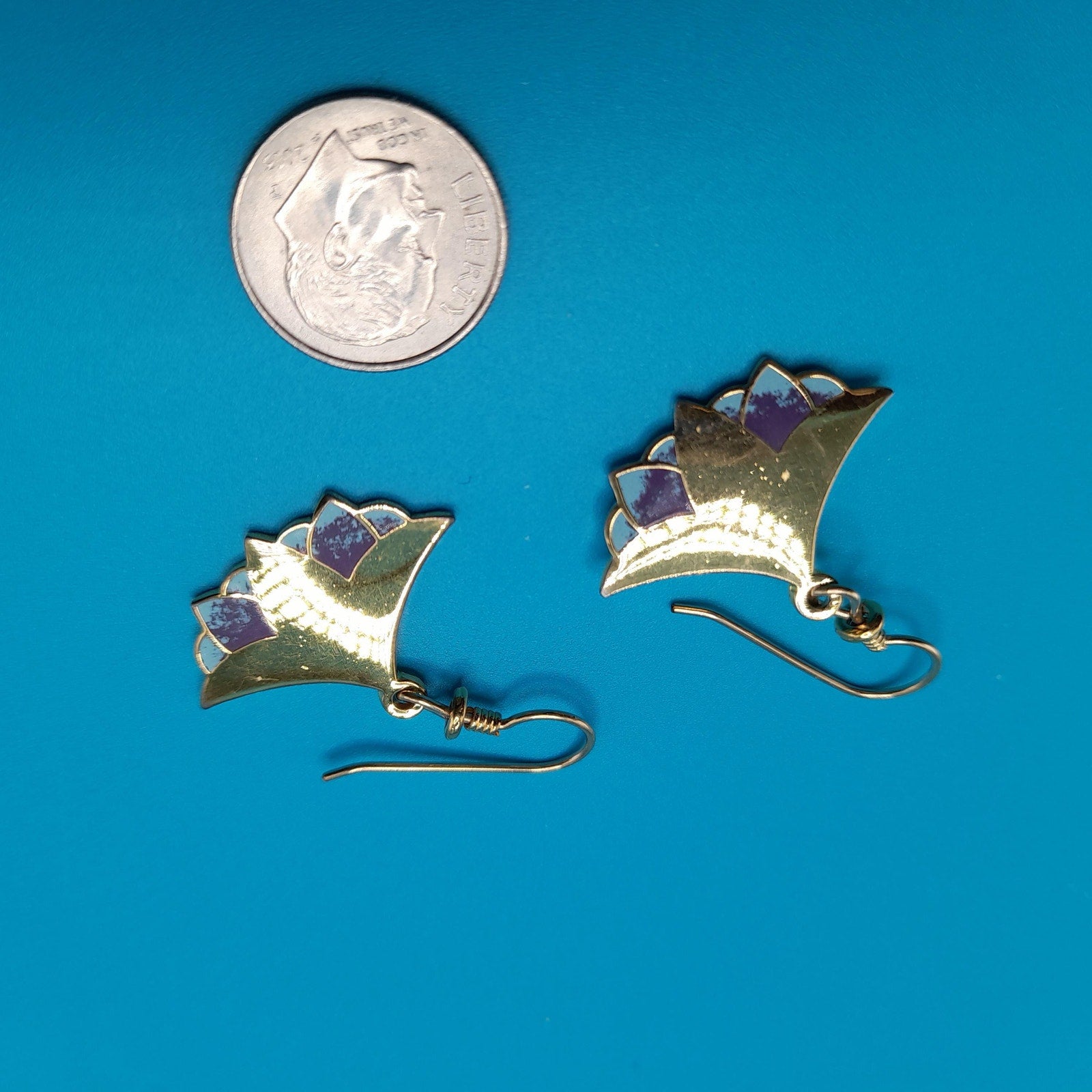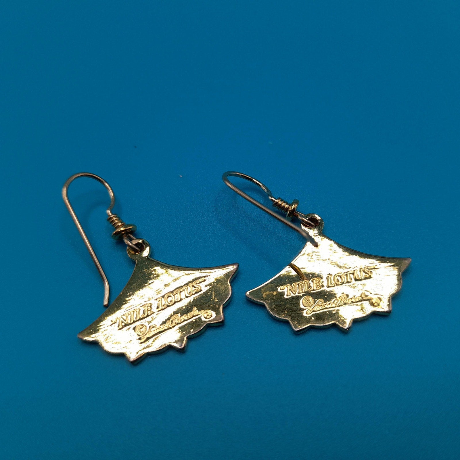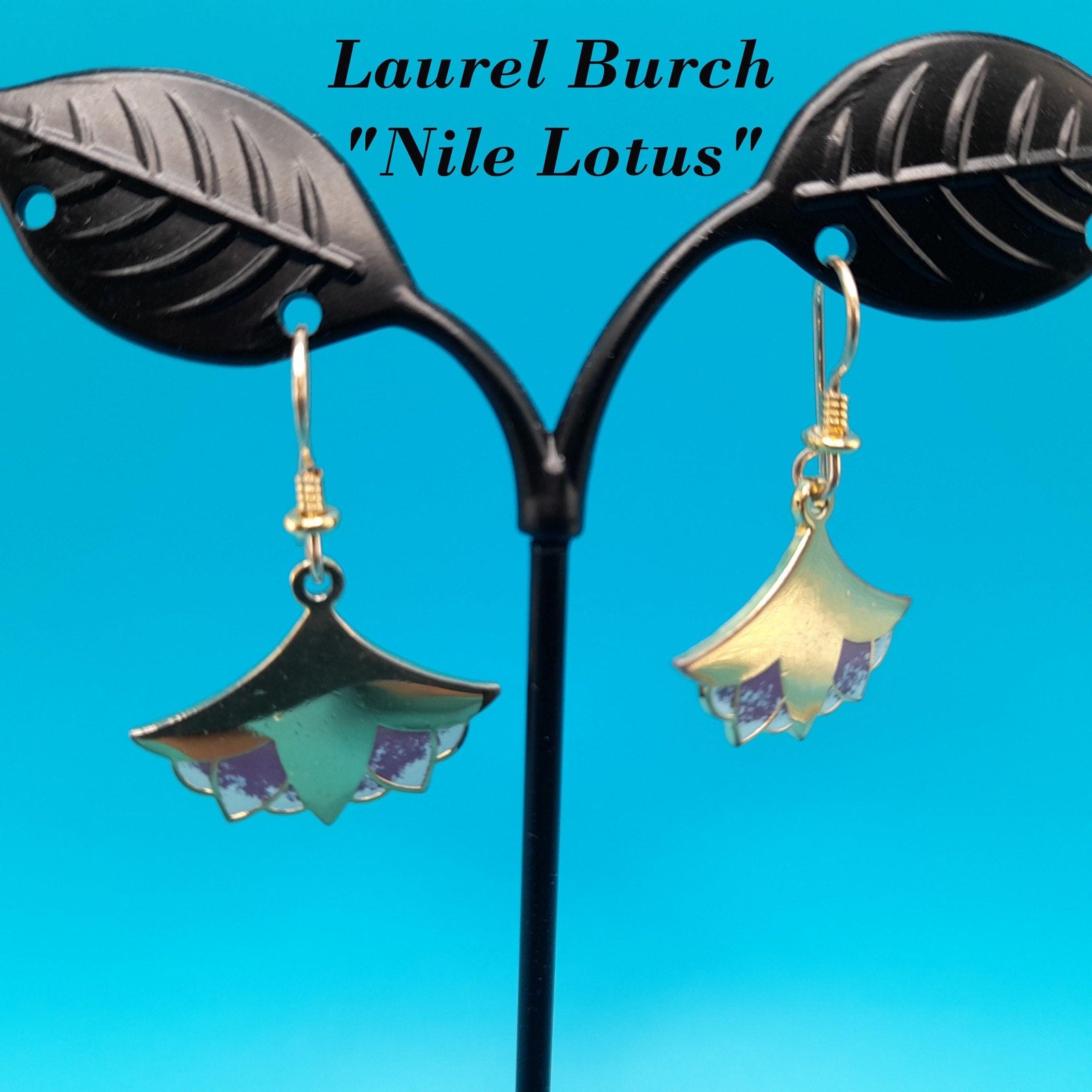 *Description: This is a unique pair of Laurel Burch "Nile Lotus" earrings from the 1980s. The gold plate is very reflective on the lotus flower and it has enamel on the bottom in purple and light blue. Both earrings are stamped "NILE LOTUS" on the back, along with the designer's name: Laurel Burch. This pair of earrings is pretty rare. The ear wires are gold filled. This would be a great addition to your vintage jewelry collection or make a great vintage gift!