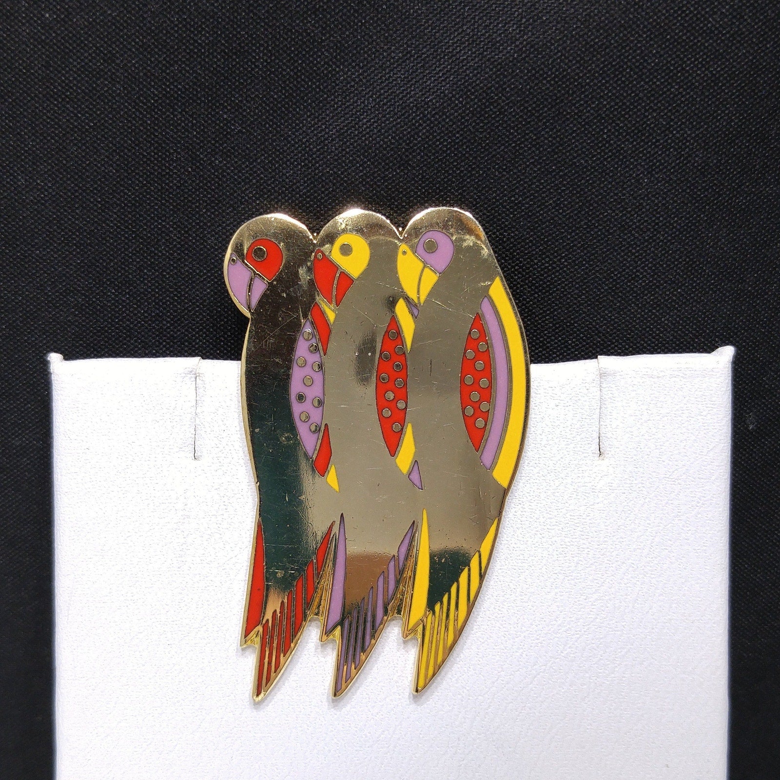 *Description: This is a beautiful vintage Laurel Burch gold plated, cloisonné brooch, with enamel in red, lavender, and yellow. The brooch has three parakeets, side by side, with very reflective gold tones. The brooch is signed PERICO, which means parakeet in Spanish. This brooch would make a perfect gift for someone who loves birds and animals. It would also make a great accessory for almost any outfit.