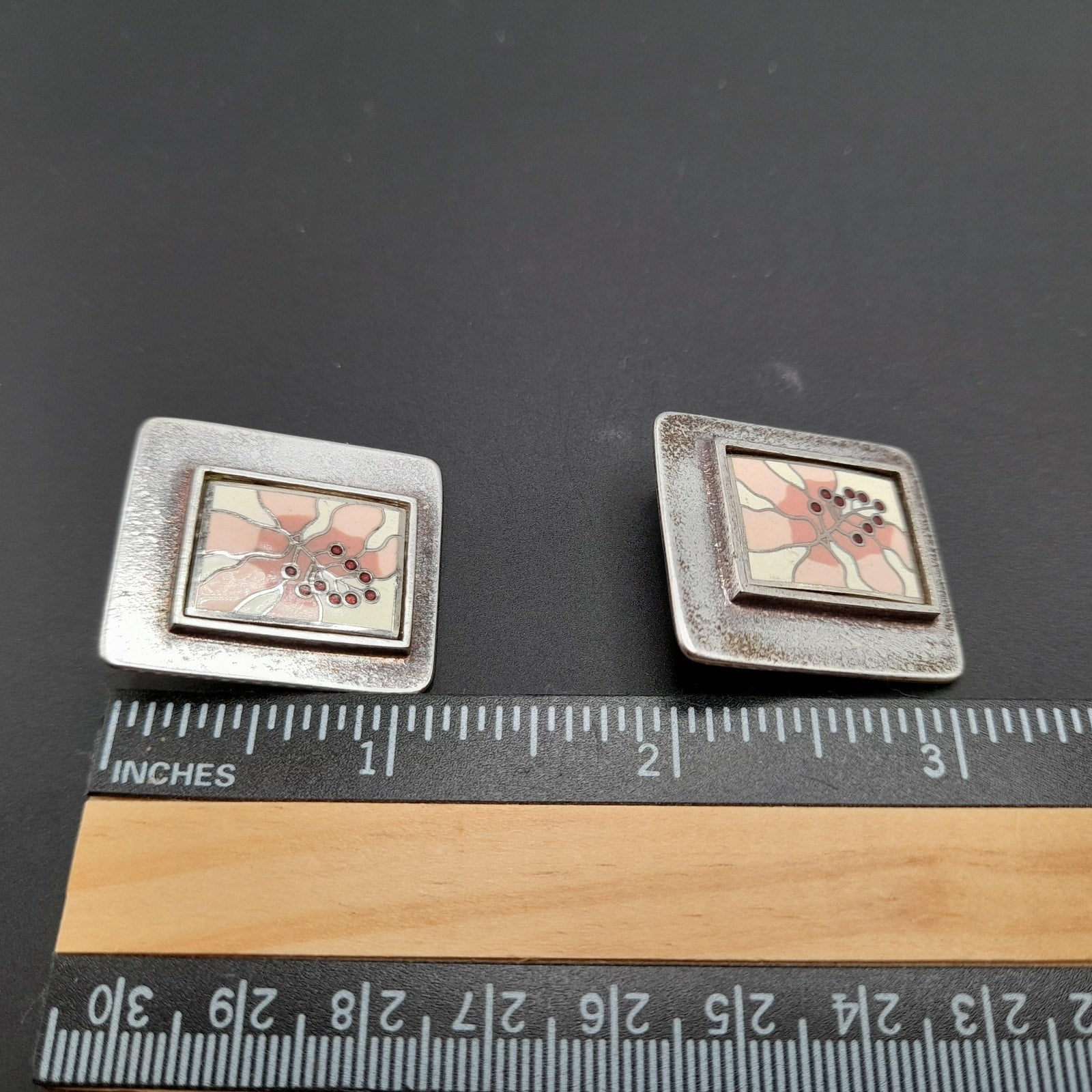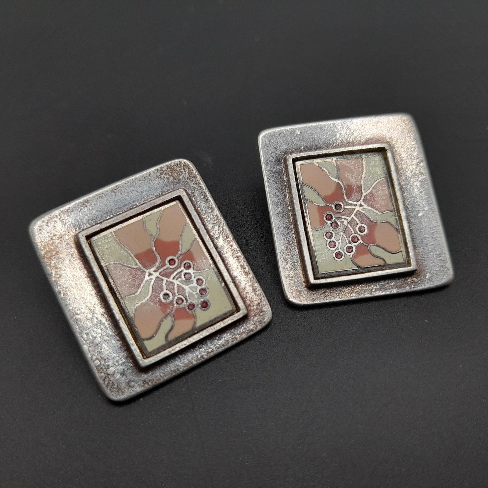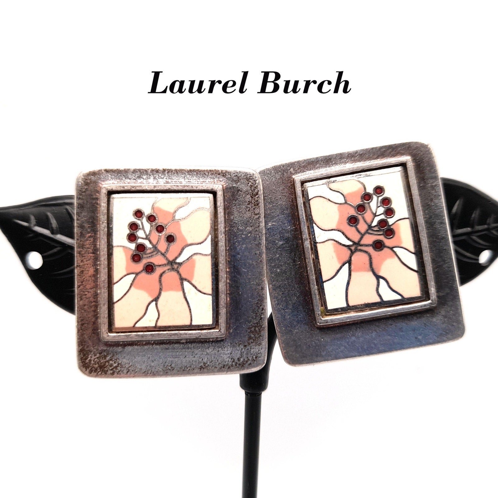 *Description: This is a beautiful pair of Laurel Burch floral clip on earrings with cloisonne enamel in pinks, white, and cranberry on a silver plated background from the 1980s. The earrings are open clips and both signed on the back by Laurel Burch. In the center there is a rectangle cloisonne enamel floral on a silver plated back. The earrings weigh .9 ounces total. This would be a great addition to your vintage jewelry collection or make a great vintage gift!