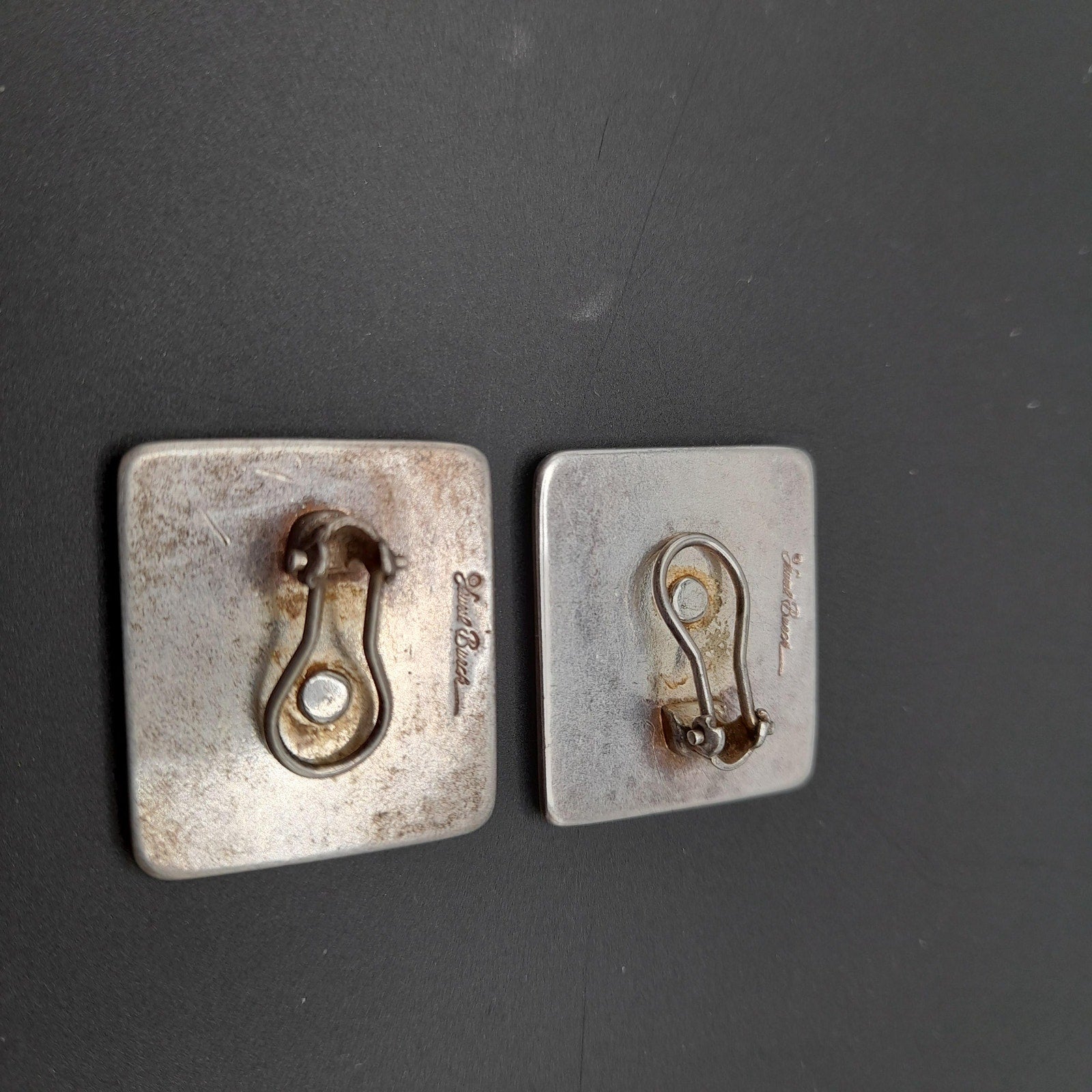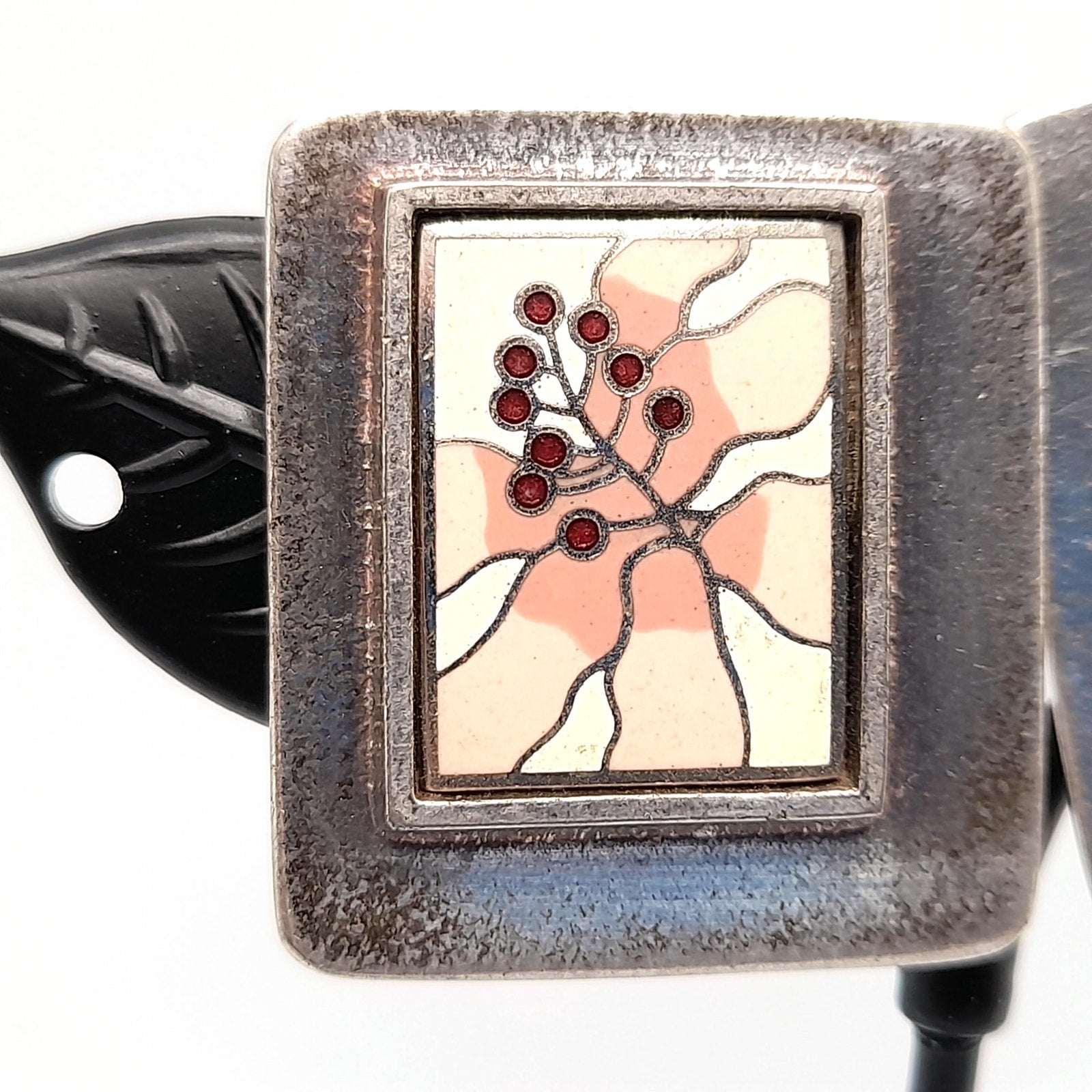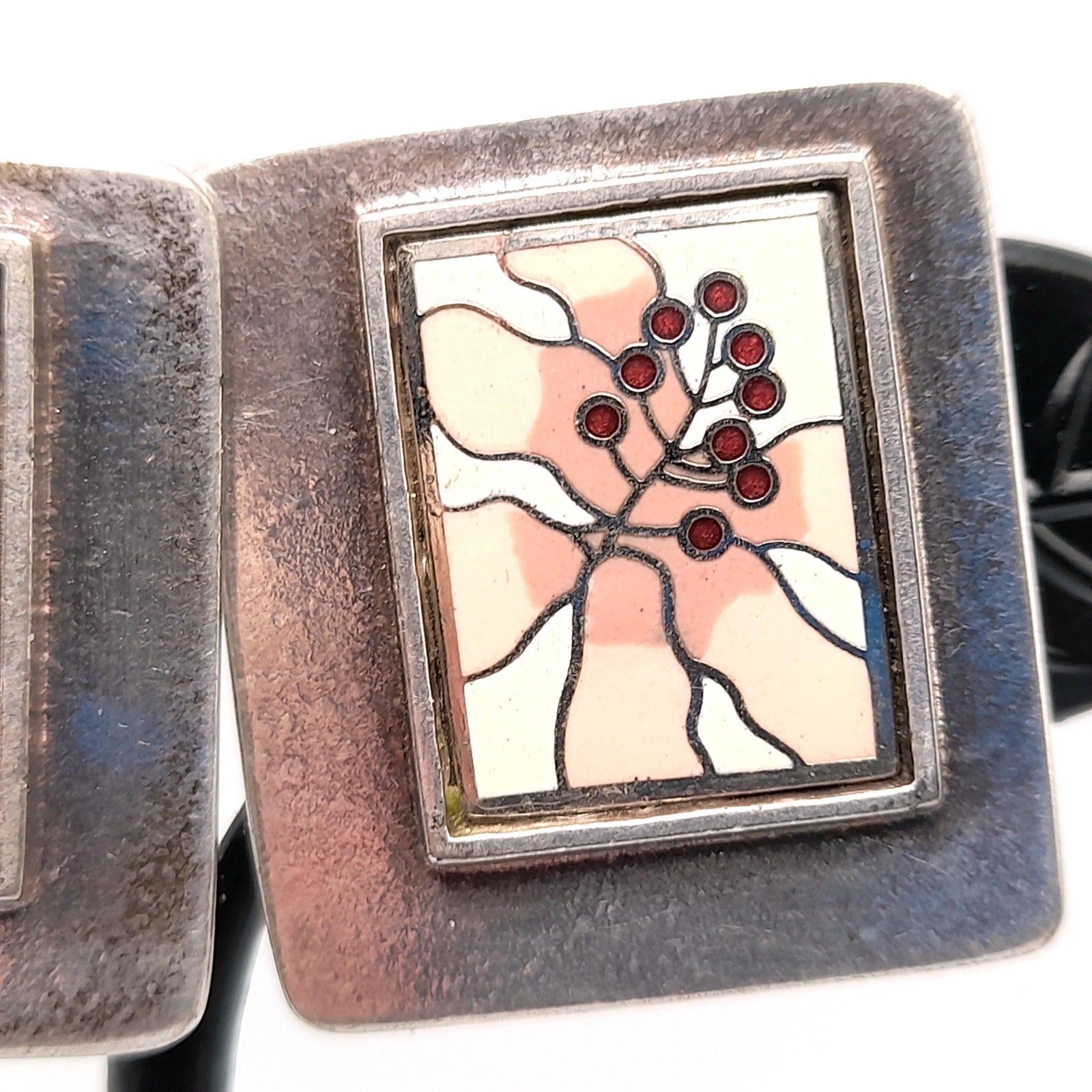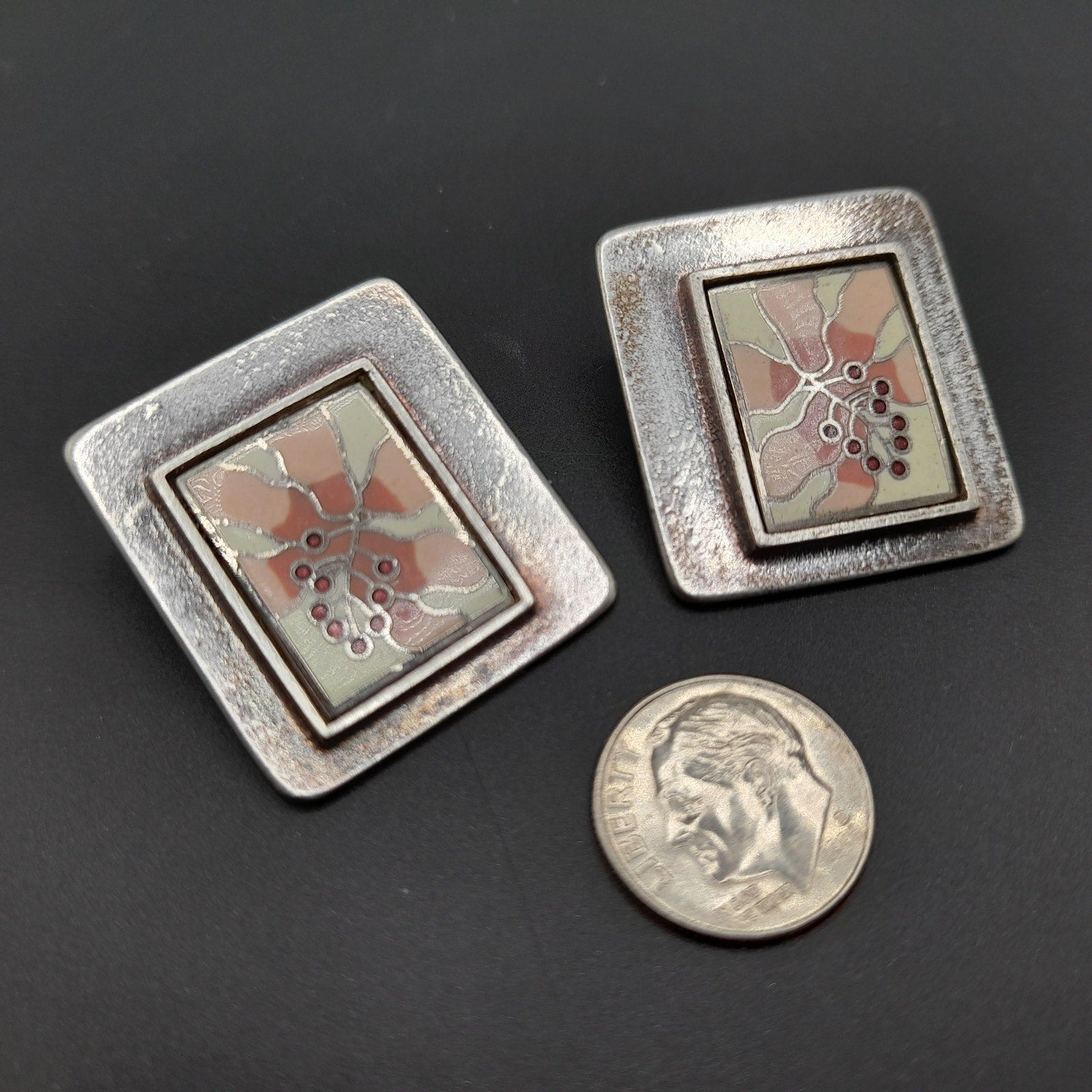 *Description: This is a beautiful pair of Laurel Burch floral clip on earrings with cloisonne enamel in pinks, white, and cranberry on a silver plated background from the 1980s. The earrings are open clips and both signed on the back by Laurel Burch. In the center there is a rectangle cloisonne enamel floral on a silver plated back. The earrings weigh .9 ounces total. This would be a great addition to your vintage jewelry collection or make a great vintage gift!