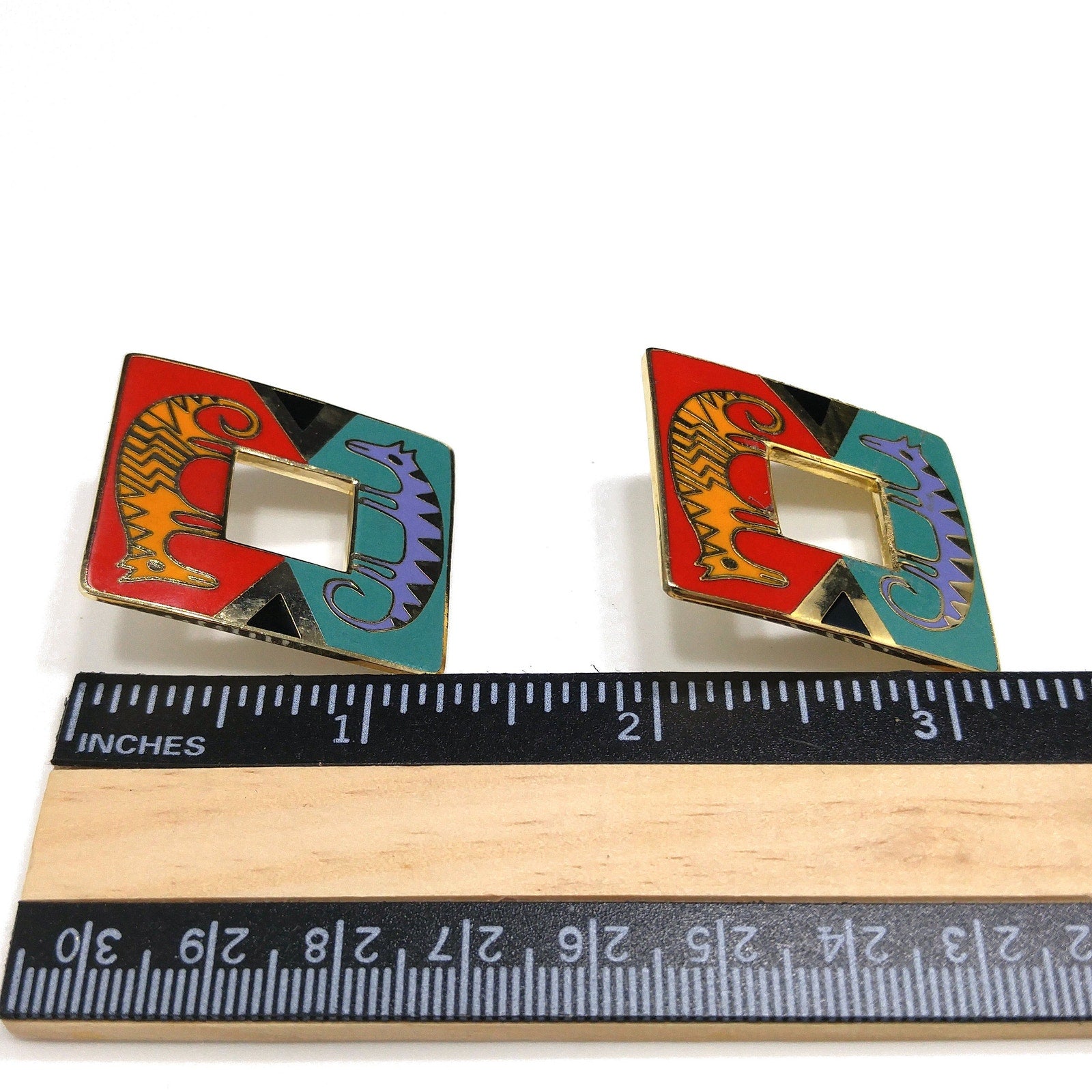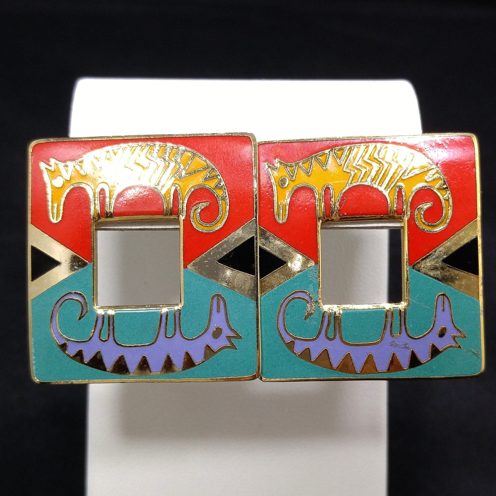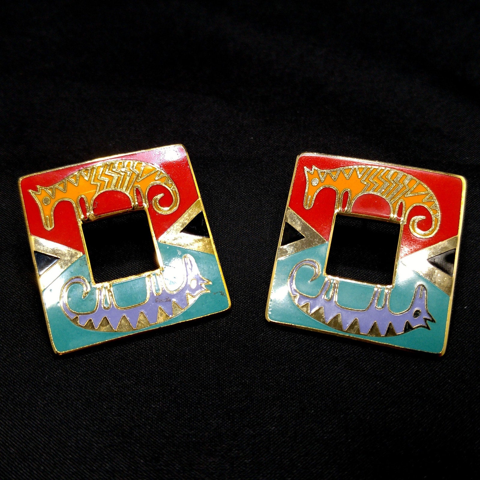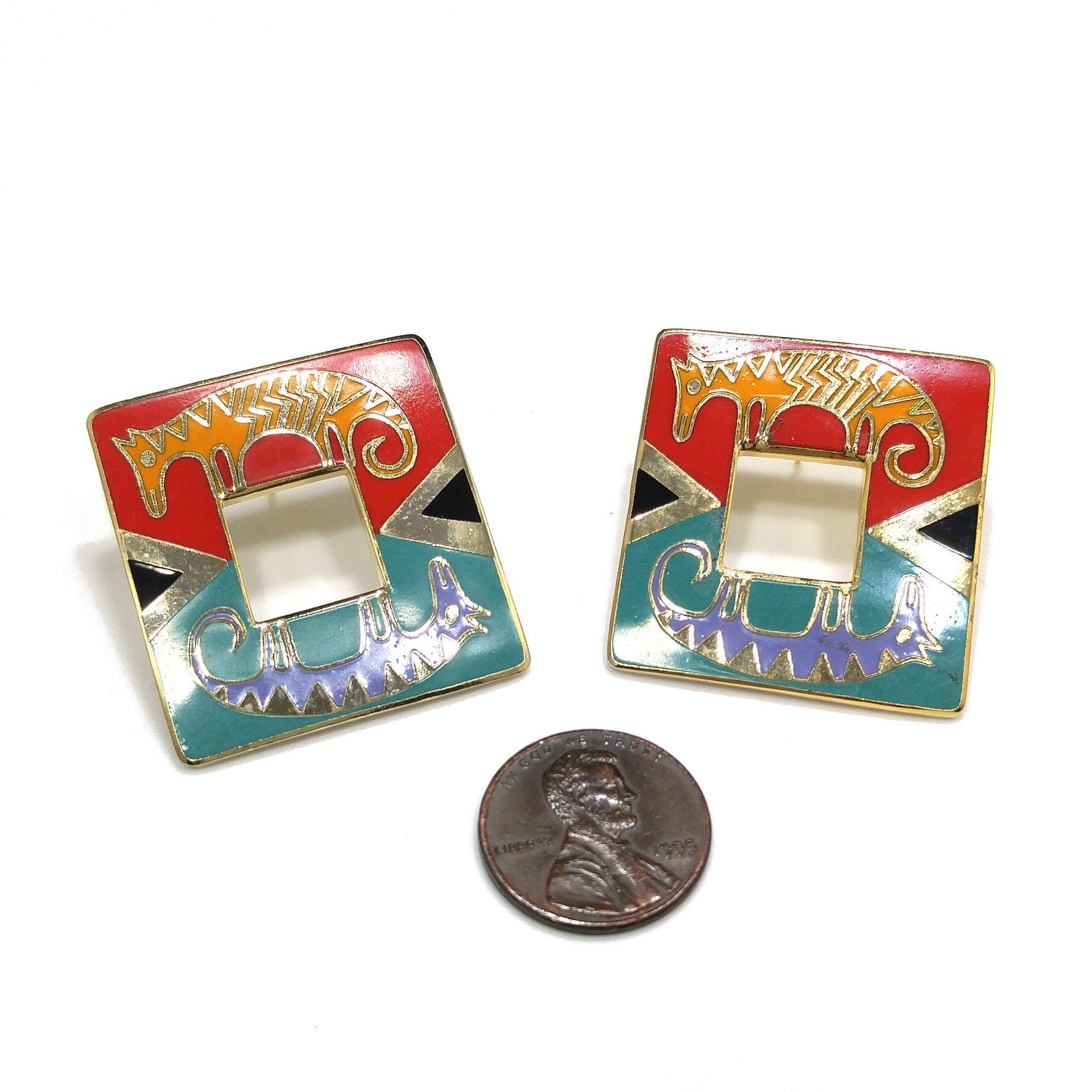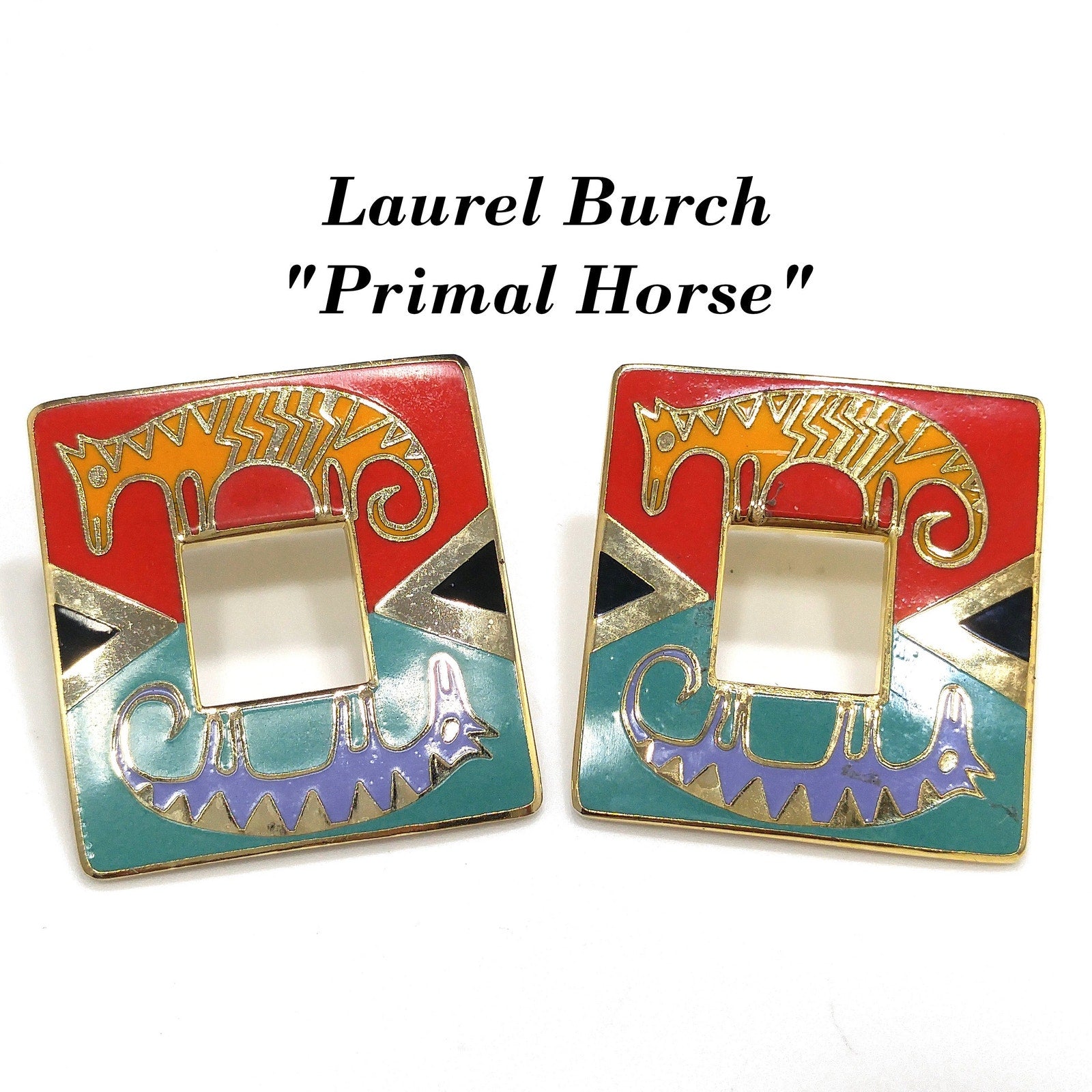 *Description: This is a great design by Laurel Burch entitled "Primal Horse" from the 1980s. The cloisonné gold plated earrings are square with cut out centers. There are two horses, one on top and the other on the bottom of the design. The enamel colors are red, teal green, black, orange gold, and lavender purple. Everything is outlined in the gold. The posts were damaged and wobbly so I replaced both with gold filled posts, just like the originals. Now they are sturdy and in great condition. This would be a great addition to your vintage jewelry collection or make a great vintage gift!
