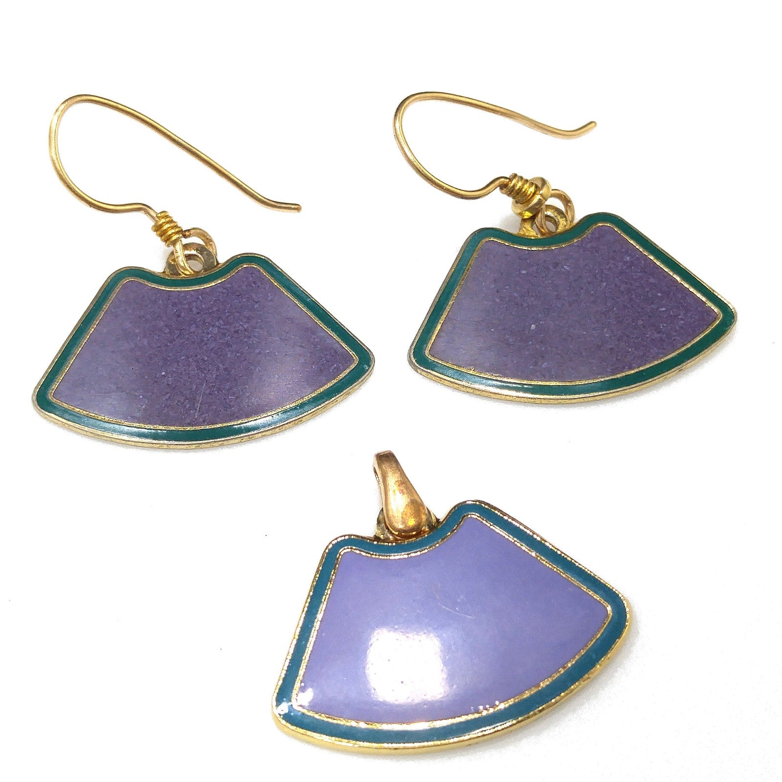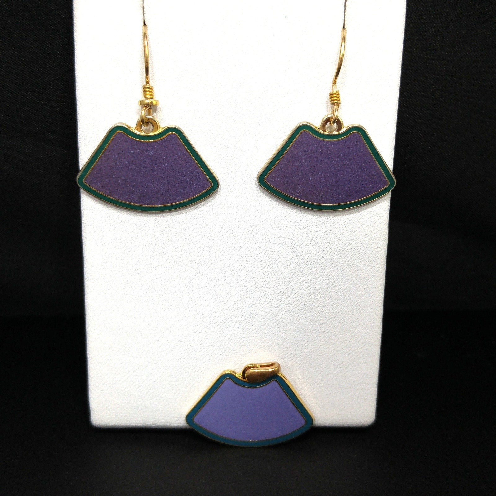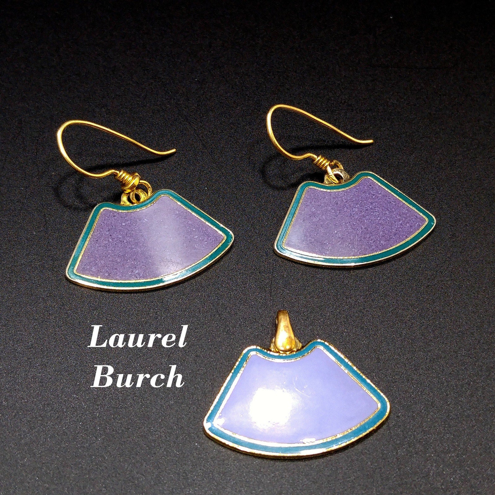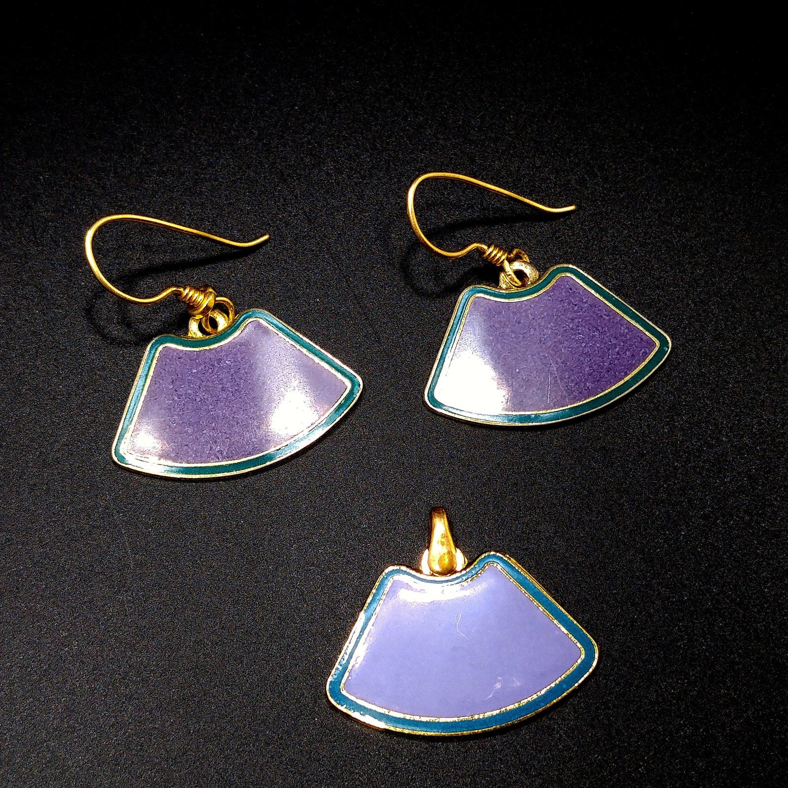 *Description: This is a great Laurel Burch purple and teal green enamel earrings and matching pendant from the 1980s. Each piece is gold plated and the earrings have gold filled ear wires. The earrings' enamel, under magnification, has a slightly marbled effect. The pendant is a solid purple enamel of the same matching color. These pieces are a fourth of an open circle. They are slightly curved with the purple enamel in the center and the teal green as an outline around each piece. Each one is stamped with the Laurel Burch signature. This would be a great set. You just need to add your own favorite chain. This would be a great addition to your vintage jewelry collection or make a great vintage gift!