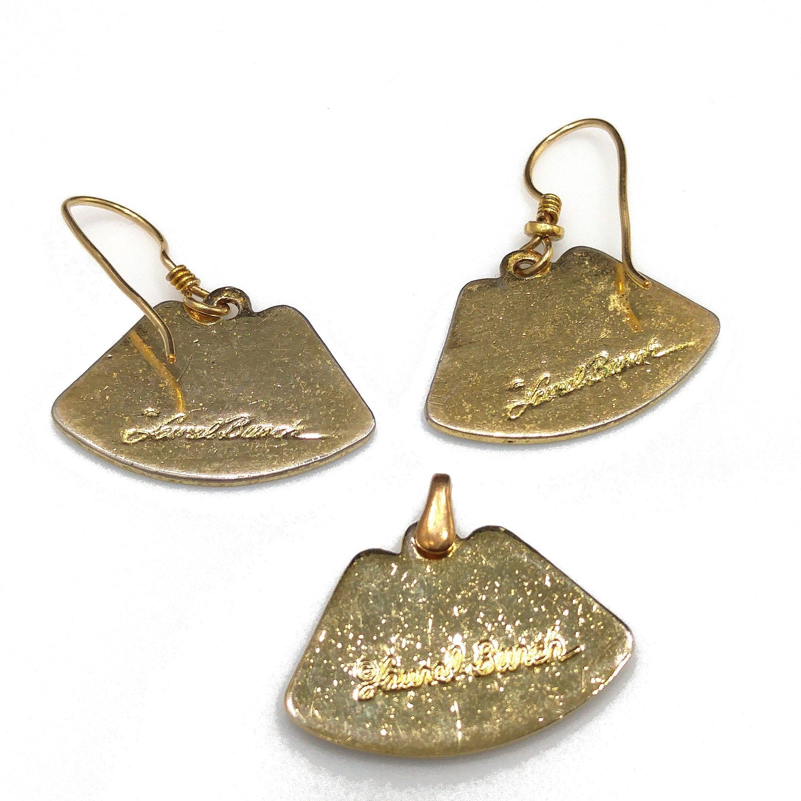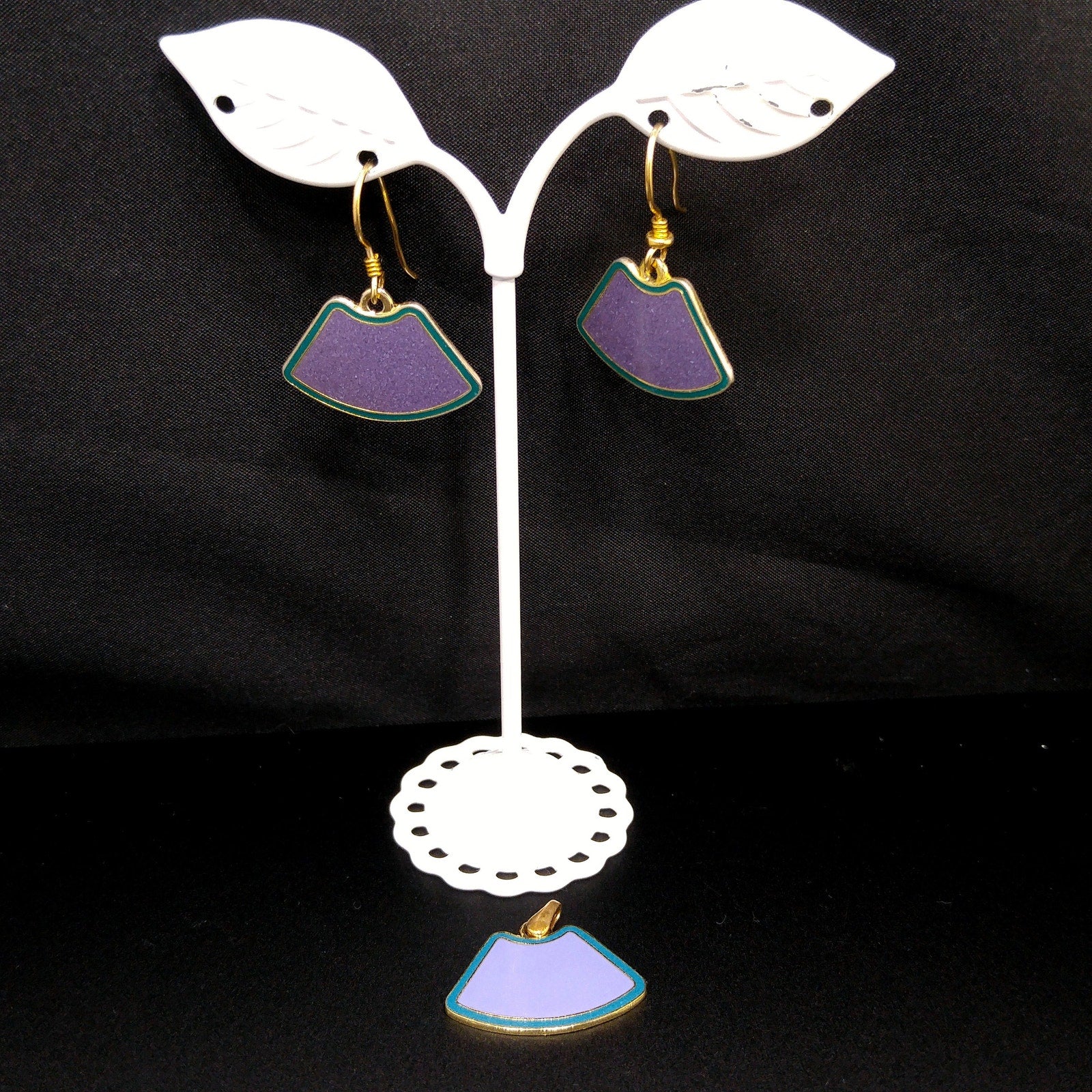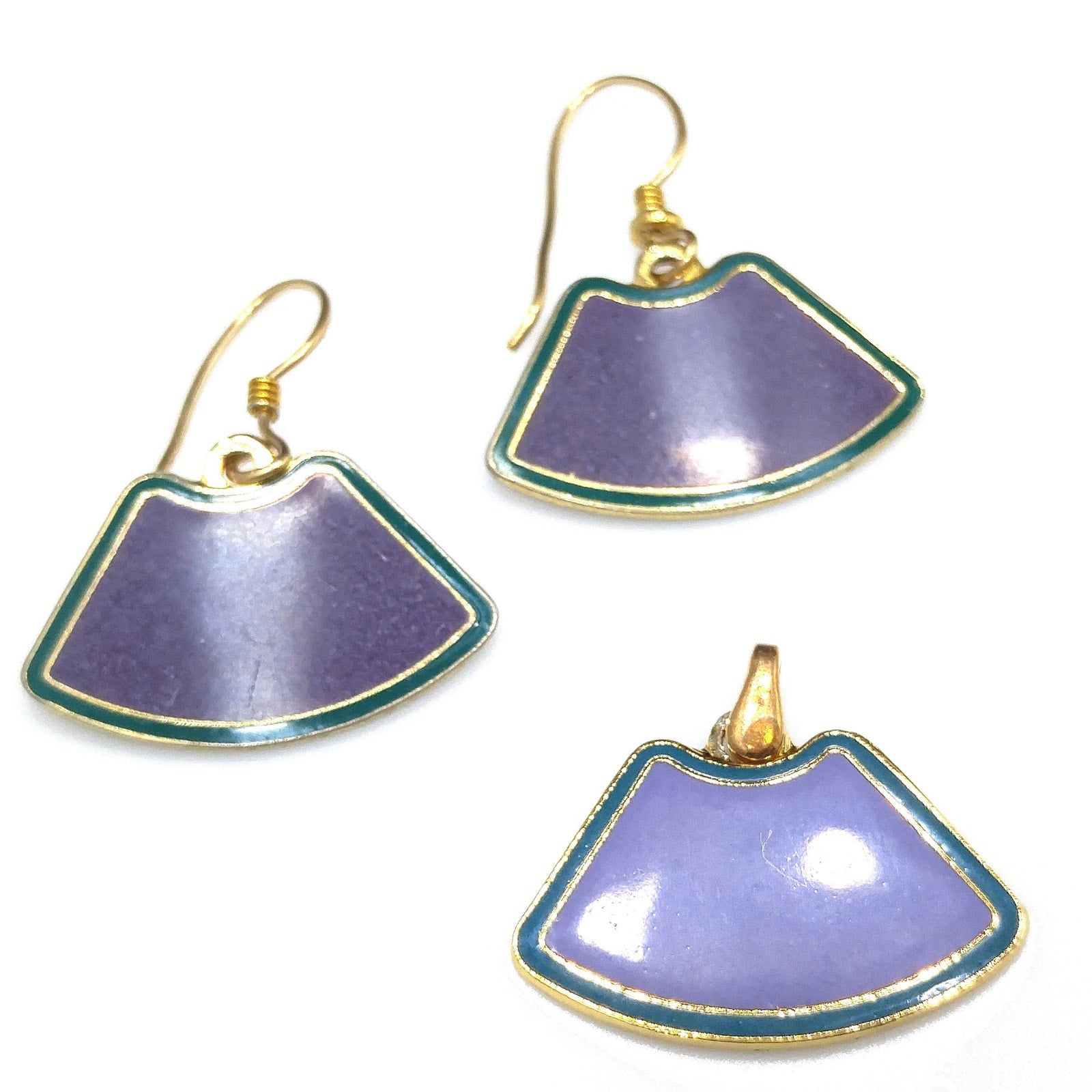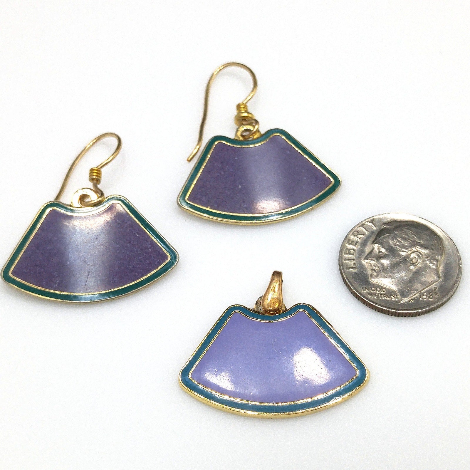 *Description: This is a great Laurel Burch purple and teal green enamel earrings and matching pendant from the 1980s. Each piece is gold plated and the earrings have gold filled ear wires. The earrings' enamel, under magnification, has a slightly marbled effect. The pendant is a solid purple enamel of the same matching color. These pieces are a fourth of an open circle. They are slightly curved with the purple enamel in the center and the teal green as an outline around each piece. Each one is stamped with the Laurel Burch signature. This would be a great set. You just need to add your own favorite chain. This would be a great addition to your vintage jewelry collection or make a great vintage gift!