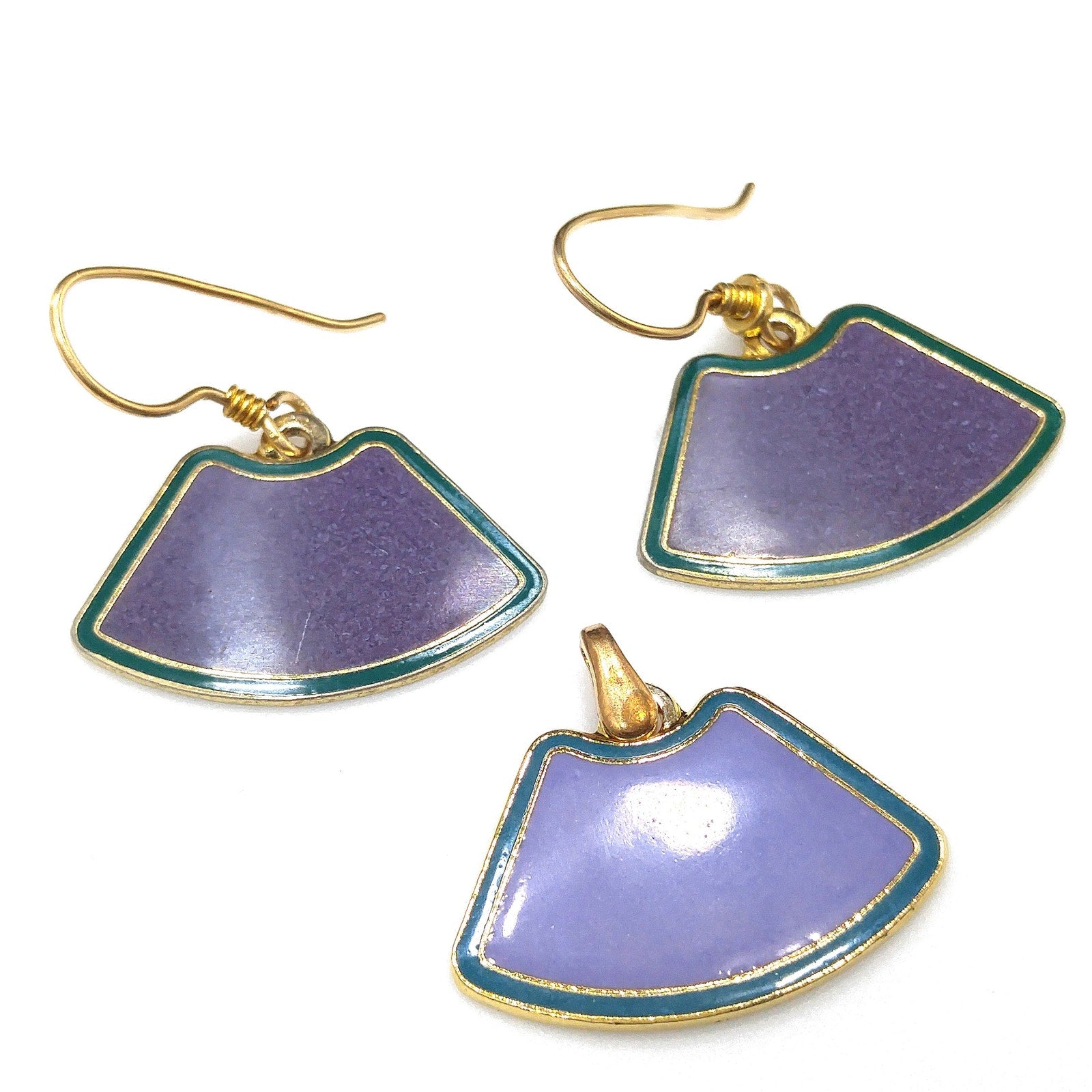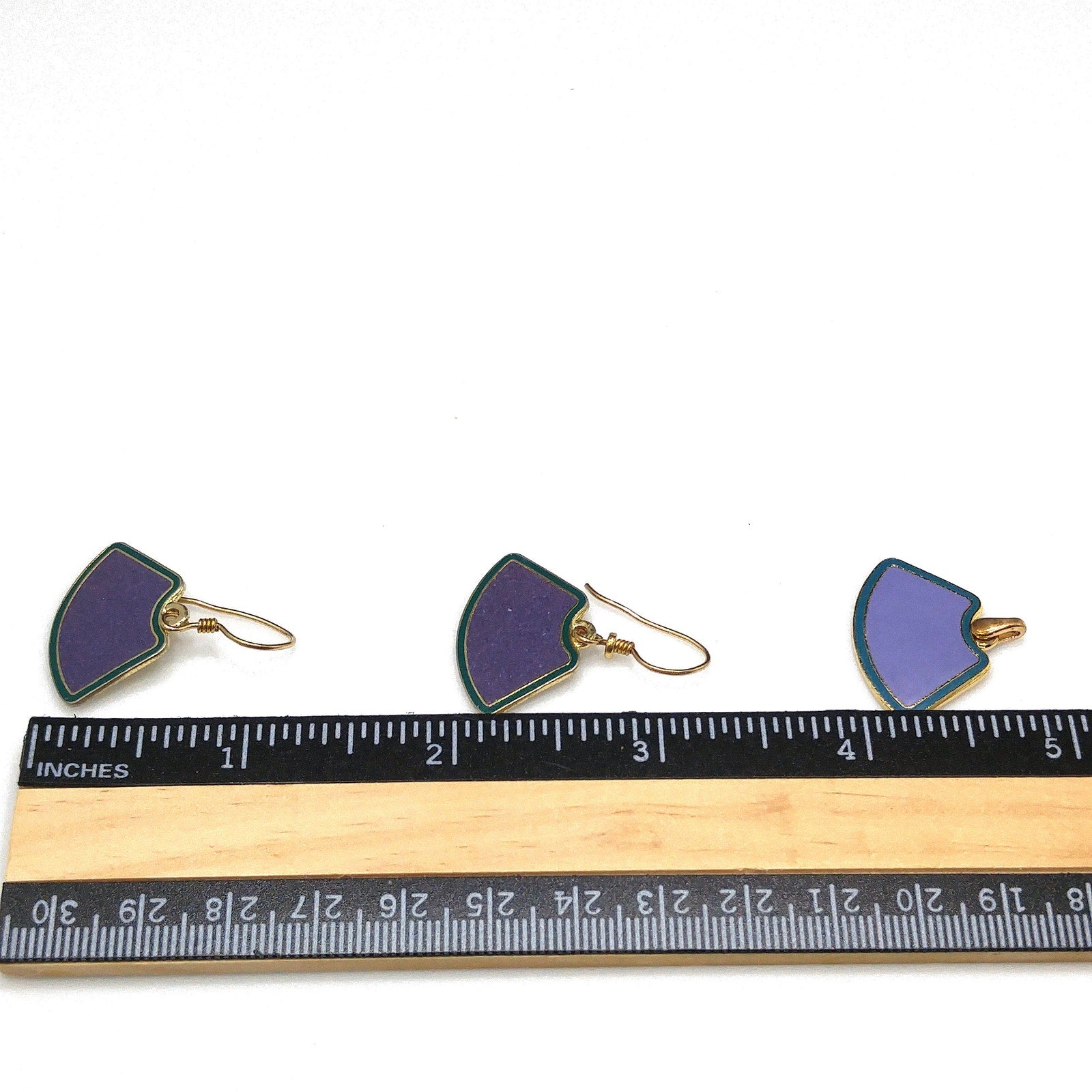 *Condition: Very good vintage condition. Earrings have purple marbling effect and pendant is more of a solid purple in same color. Ear wire slightly misshapen. No chain attached to pendant. May see signs of wear under magnification. See photos for details.