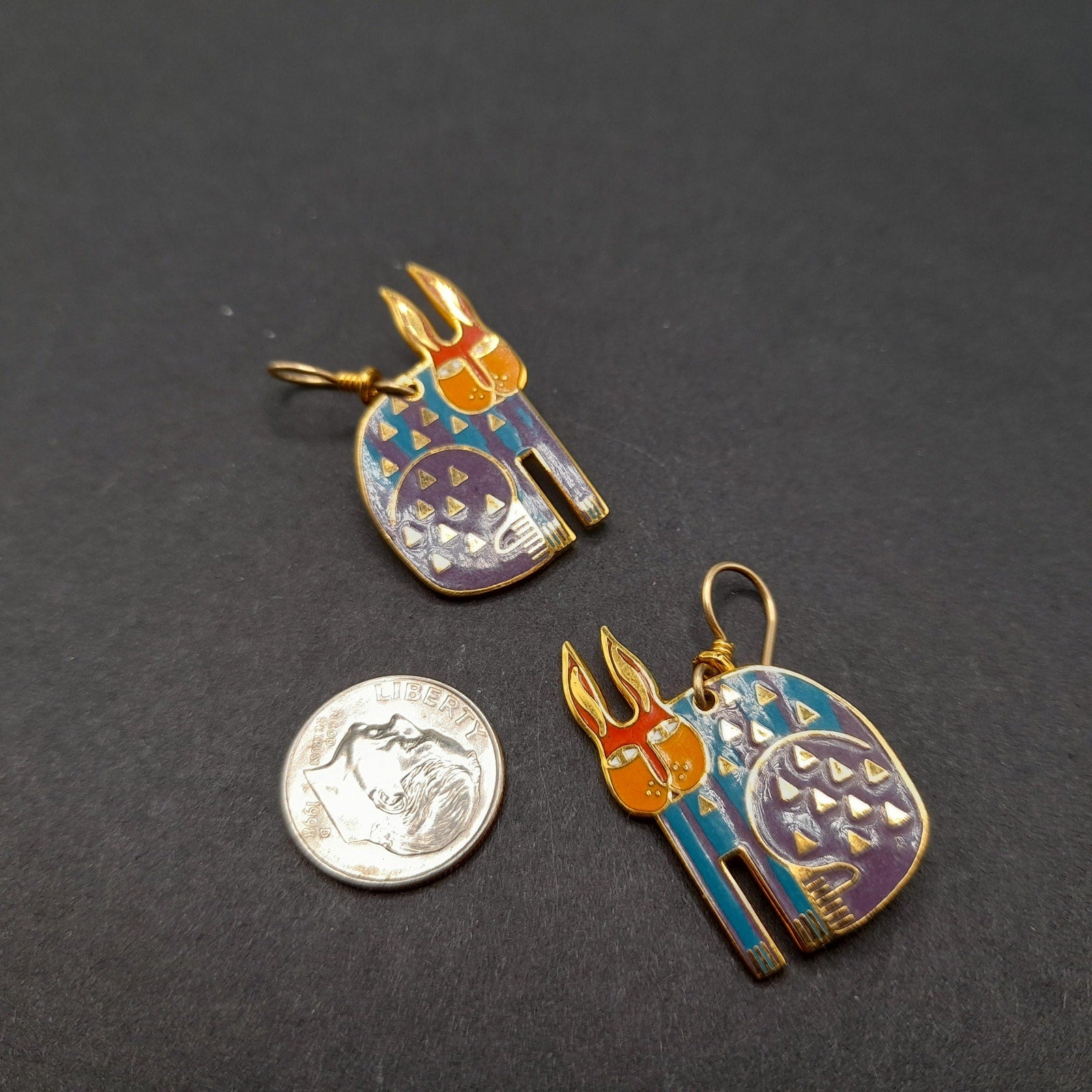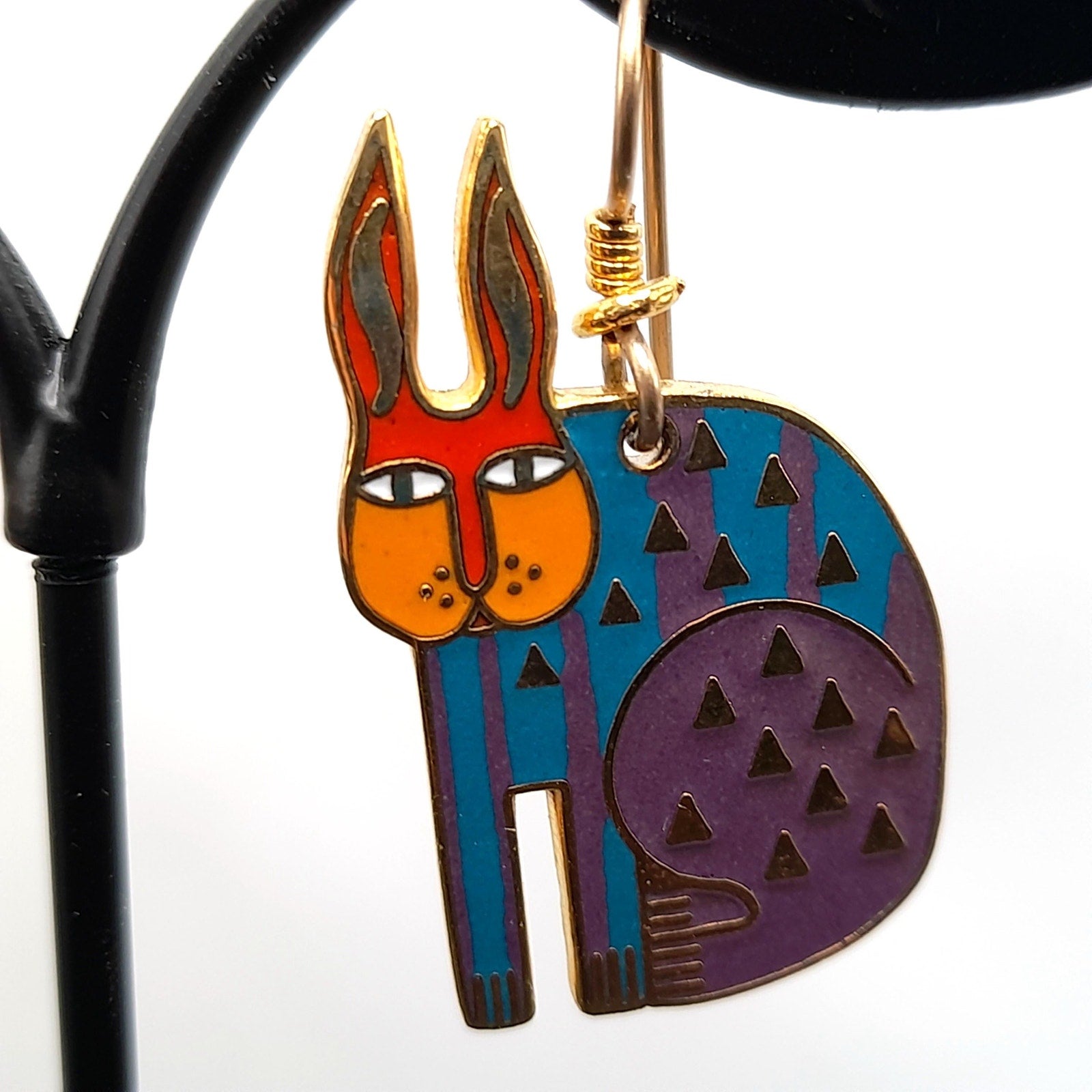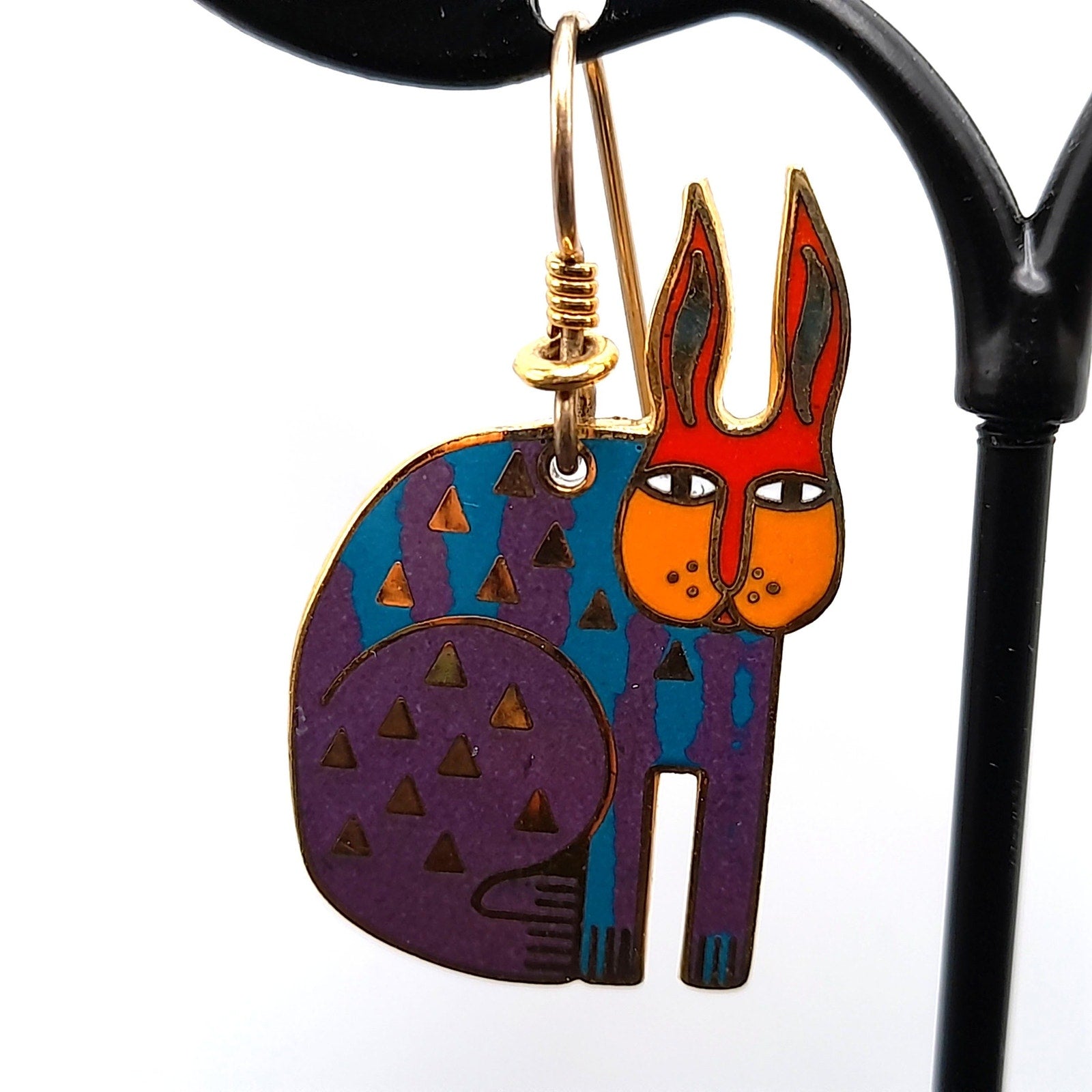 *Description: This is a beautiful Laurel Burch cloisonne earrings of the design "Rabbit for Ross" from the 1980s. The rainbow of enamel colors are vibrant and outlined in gold plating. The earrings have enamel colors: purple, teal, golden yellow, orange, and white. Laurel Burch earrings have gold filled ear wires for extra comfort. This would be a great addition to your vintage jewelry collection or make a great vintage gift!