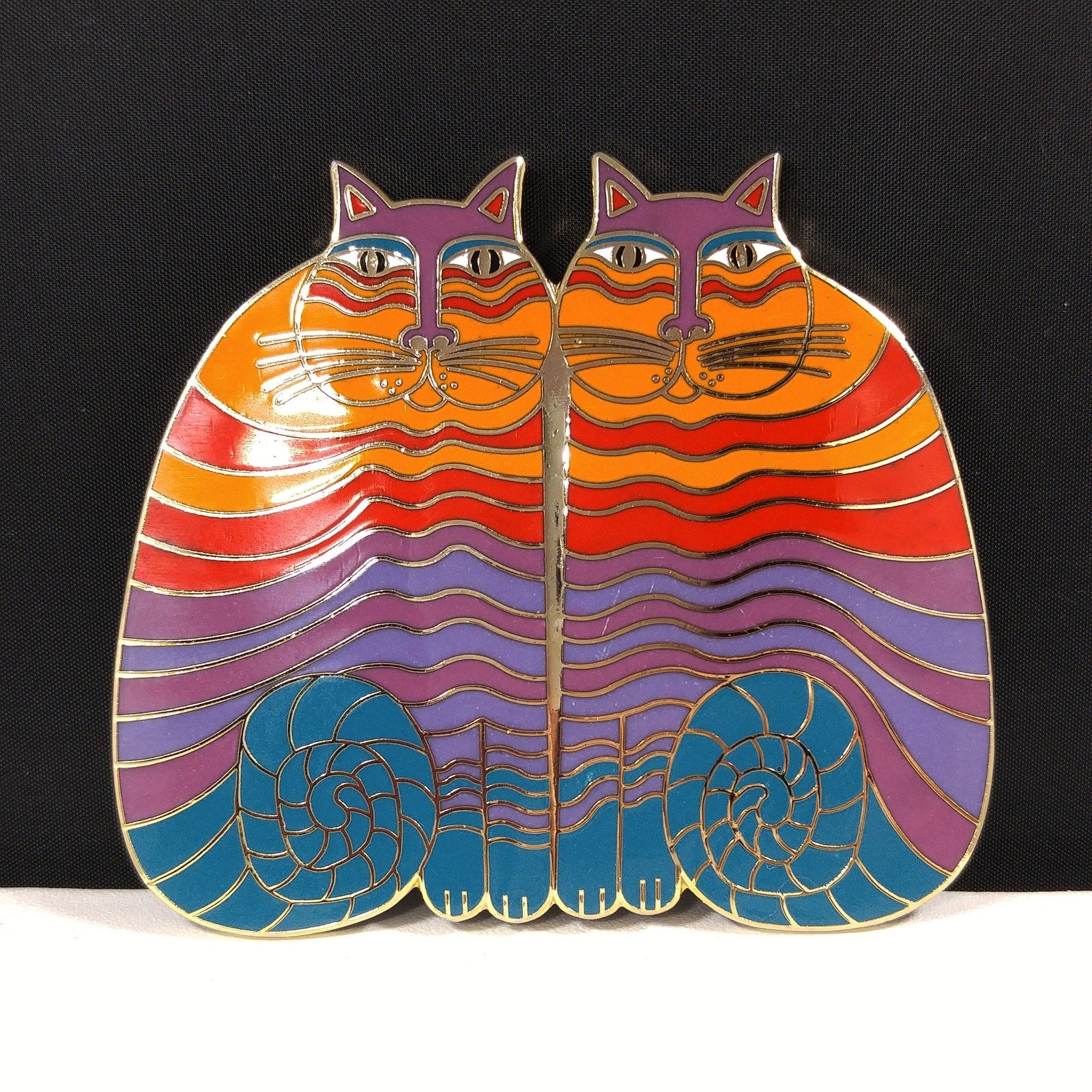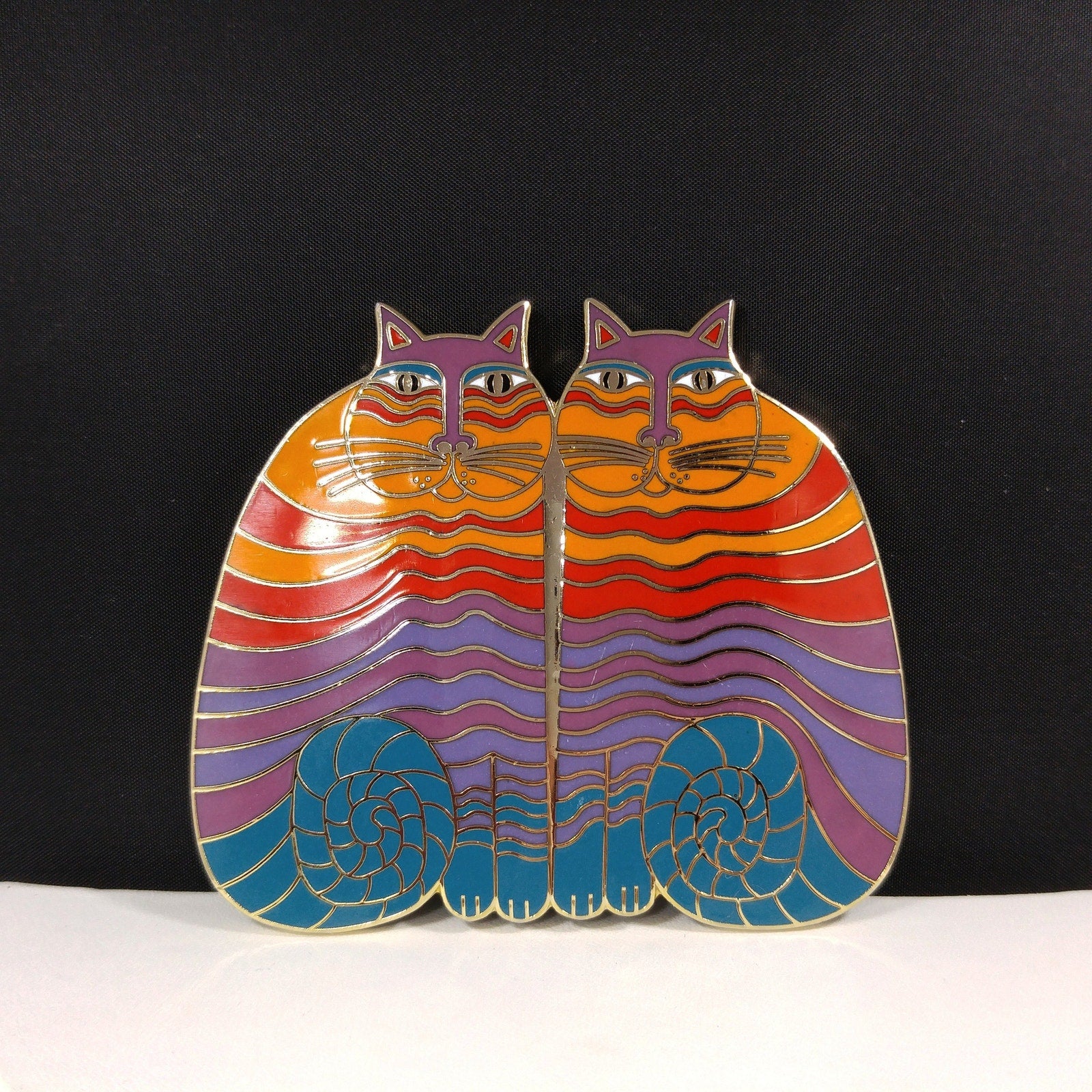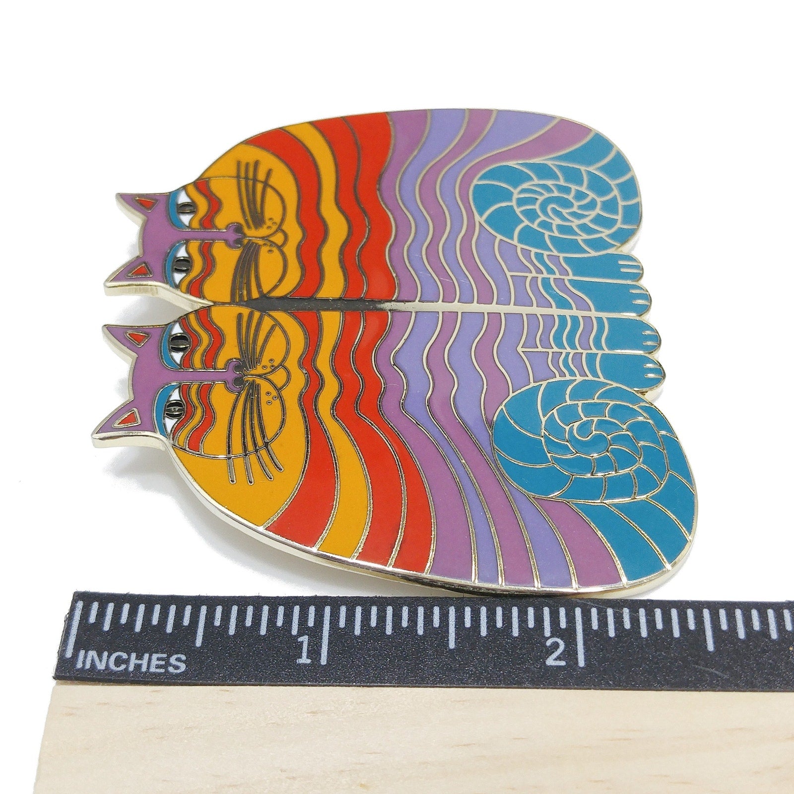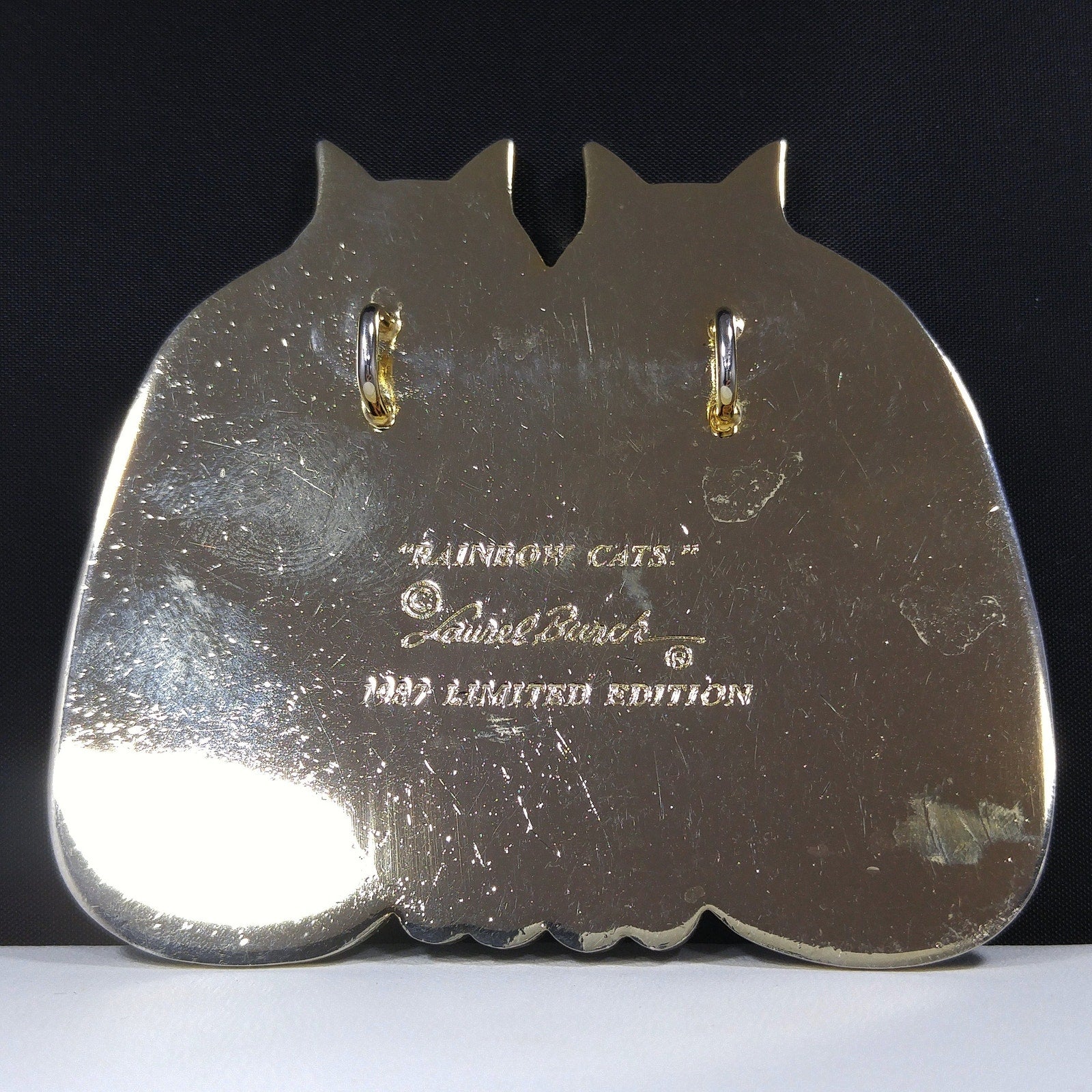 *Description: This is a beautiful Laurel Burch "Rainbow Cats" 1987 Limited Edition large pendant from the 1980s. There originally was a satin cord that was the necklace chain. No chain or cord is attached with this pendant, however, it could be worn on any large gold chain or a replacement silk cord as it was just originally tied on the end behind the neck. This pendant is gold plated and has enamel in many rainbow colors which include: purple, red, orange, white and teal blue. The two cats, sit side by side, facing each other and are one of Laurel Burch famous cat designs. This would be a great addition to your vintage jewelry collection or make a great vintage gift!