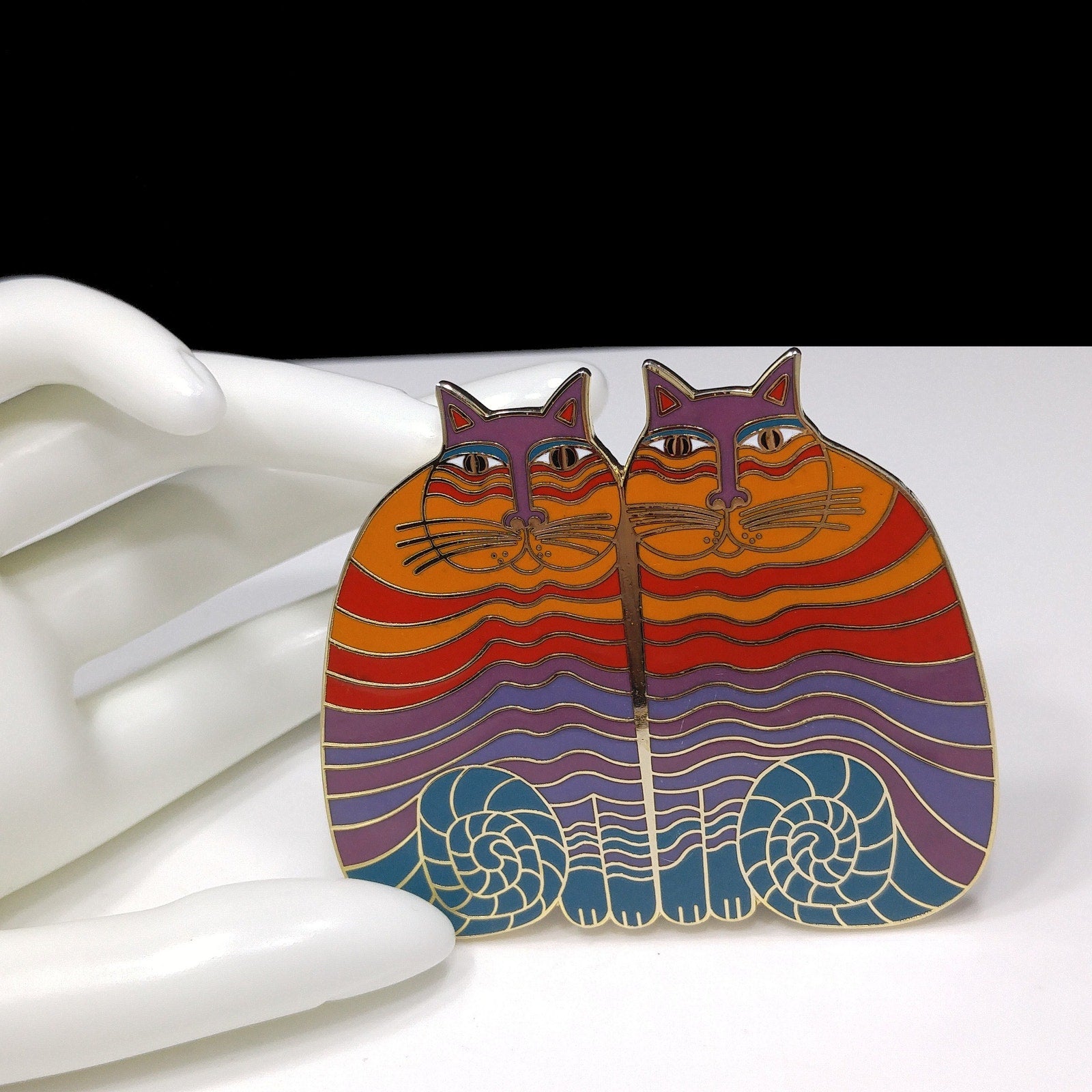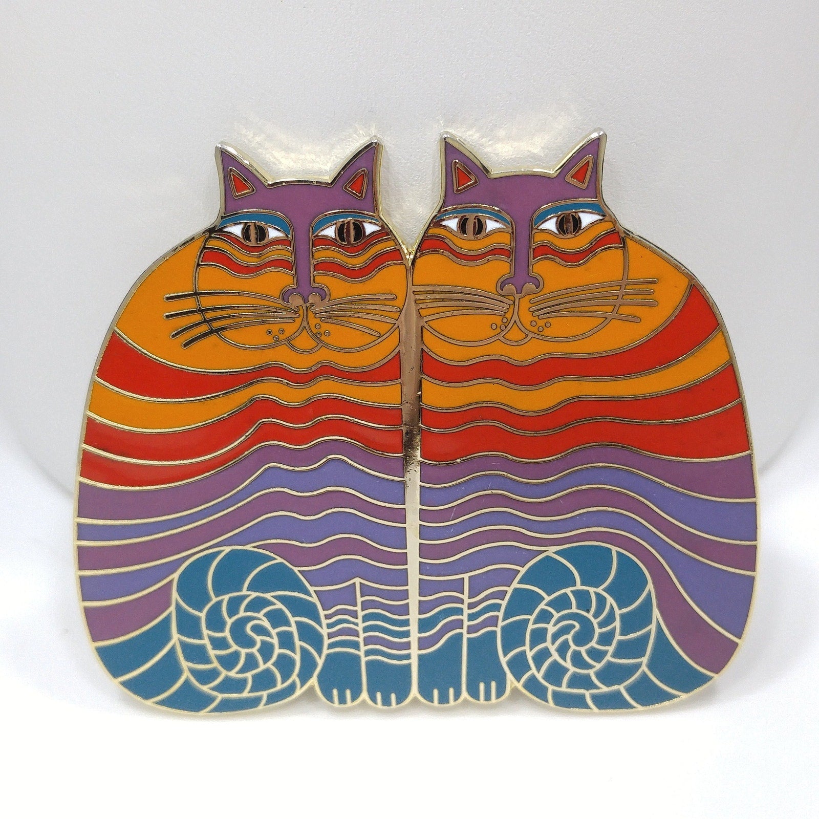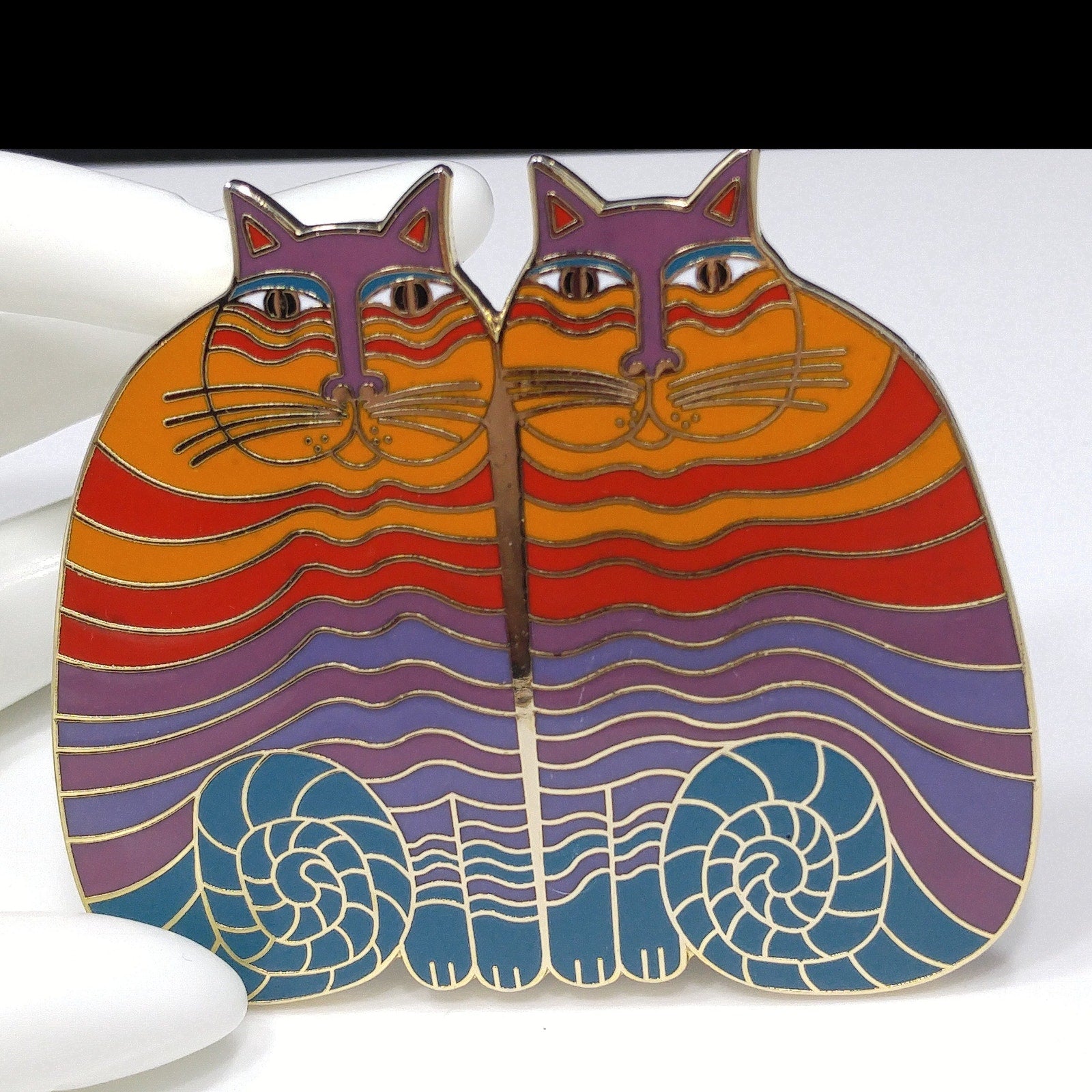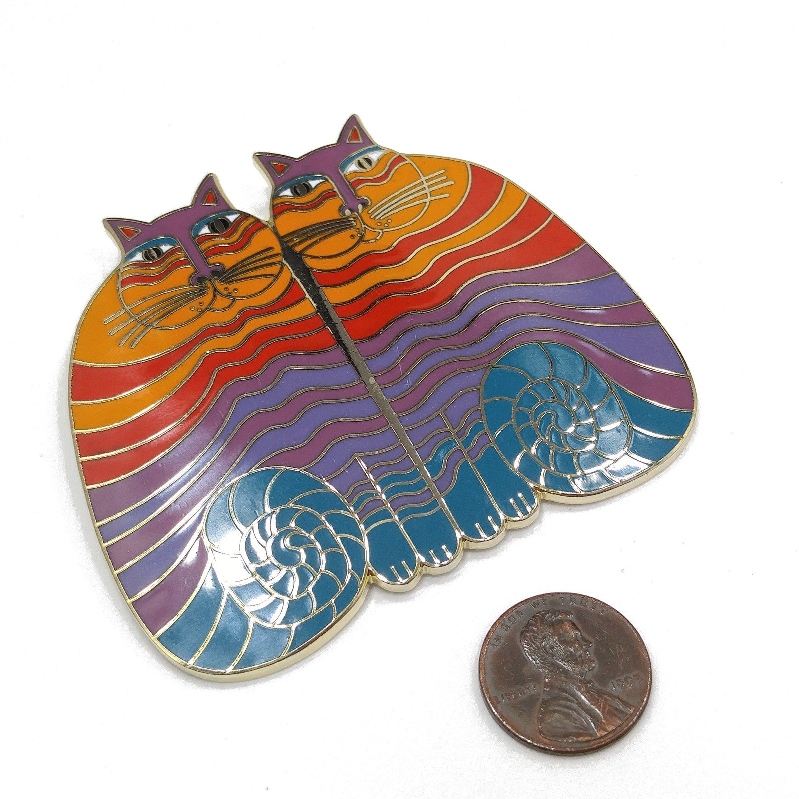 *Description: This is a beautiful Laurel Burch "Rainbow Cats" 1987 Limited Edition large pendant from the 1980s. There originally was a satin cord that was the necklace chain. No chain or cord is attached with this pendant, however, it could be worn on any large gold chain or a replacement silk cord as it was just originally tied on the end behind the neck. This pendant is gold plated and has enamel in many rainbow colors which include: purple, red, orange, white and teal blue. The two cats, sit side by side, facing each other and are one of Laurel Burch famous cat designs. This would be a great addition to your vintage jewelry collection or make a great vintage gift!