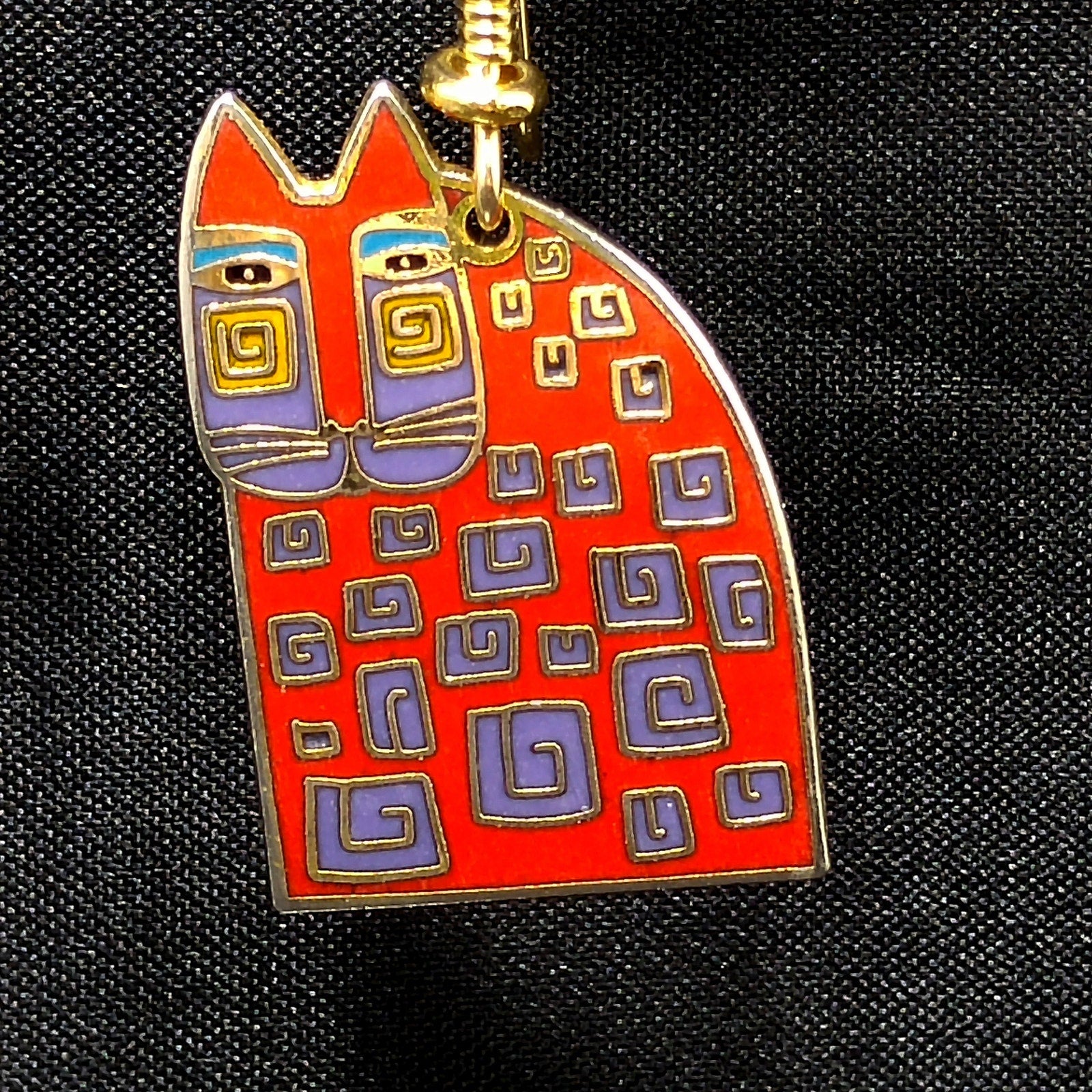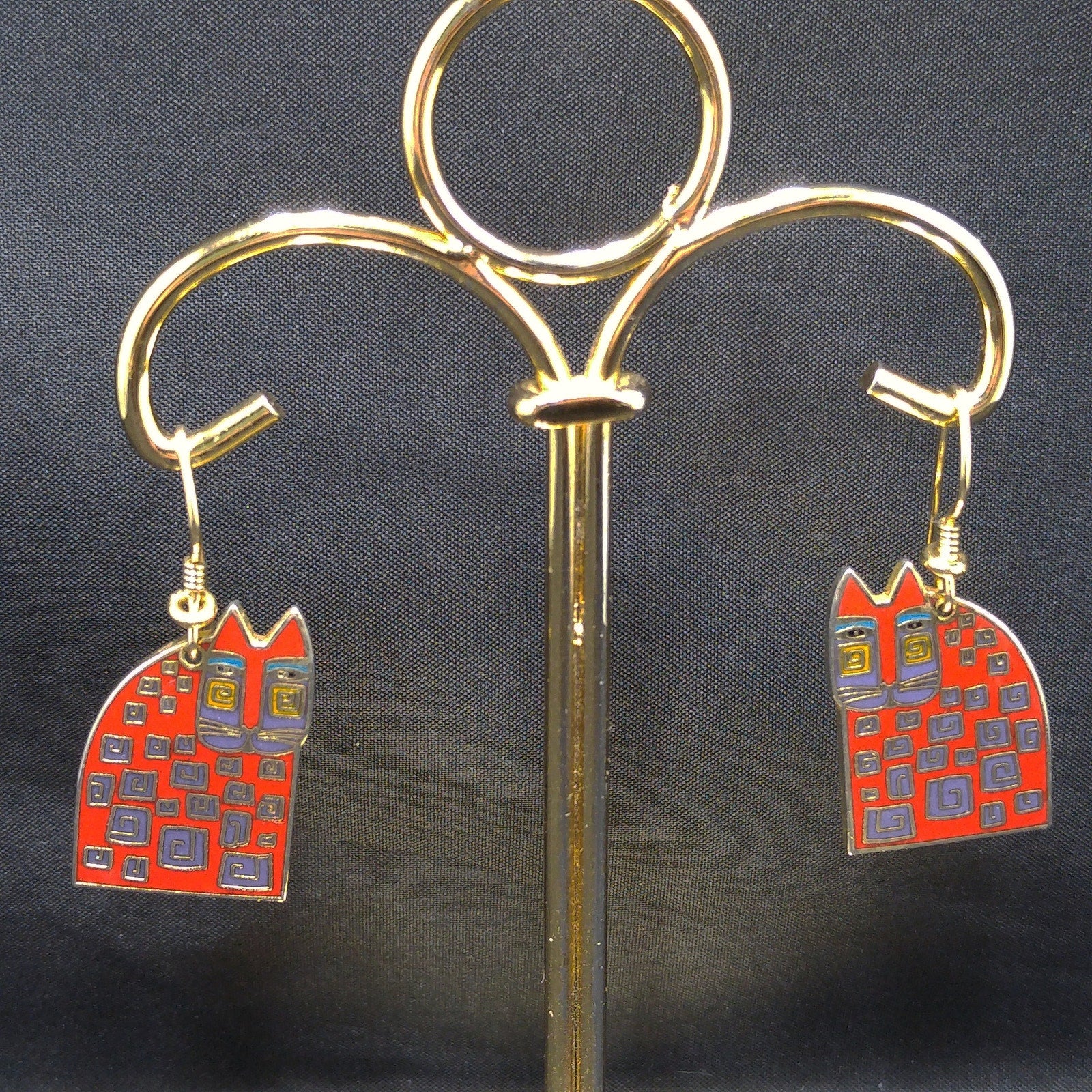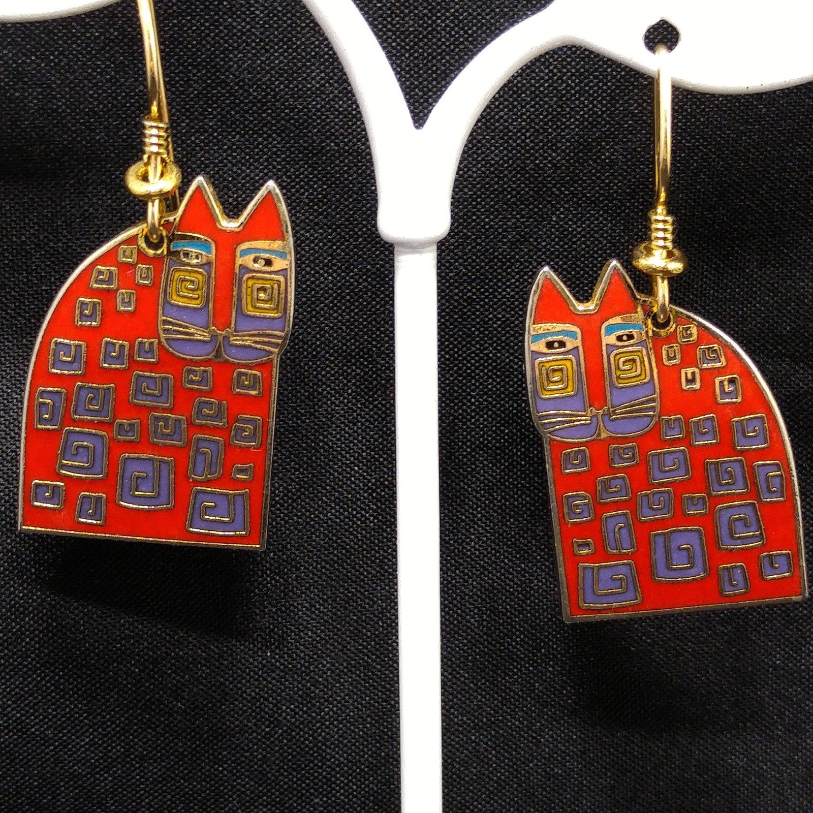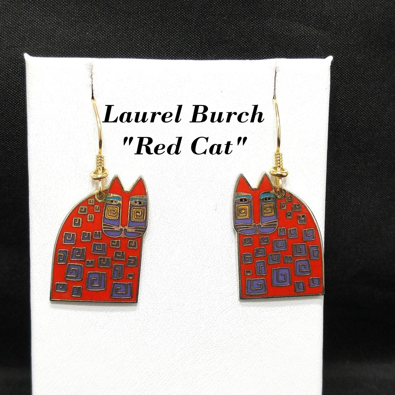 *Description: This is a great pair of Laurel Burch "Red Cat" dangle earrings from the 1980s. The gold plated cloisonné earrings have red enamel on most of the cat bodies with touches of purple and teal green. The ear wires are gold filled and slightly reshaped from originals. This is a great pair of earrings for the cat lovers in your life. This would be a great addition to your vintage jewelry collection or make a great vintage gift!