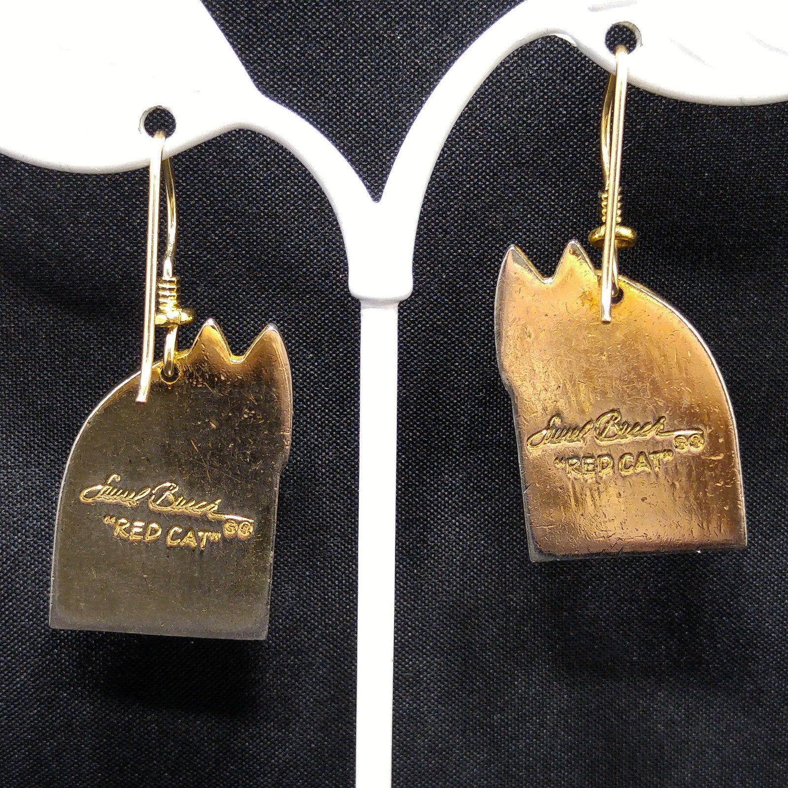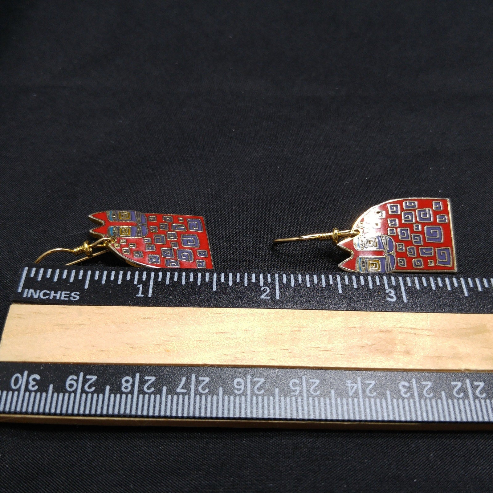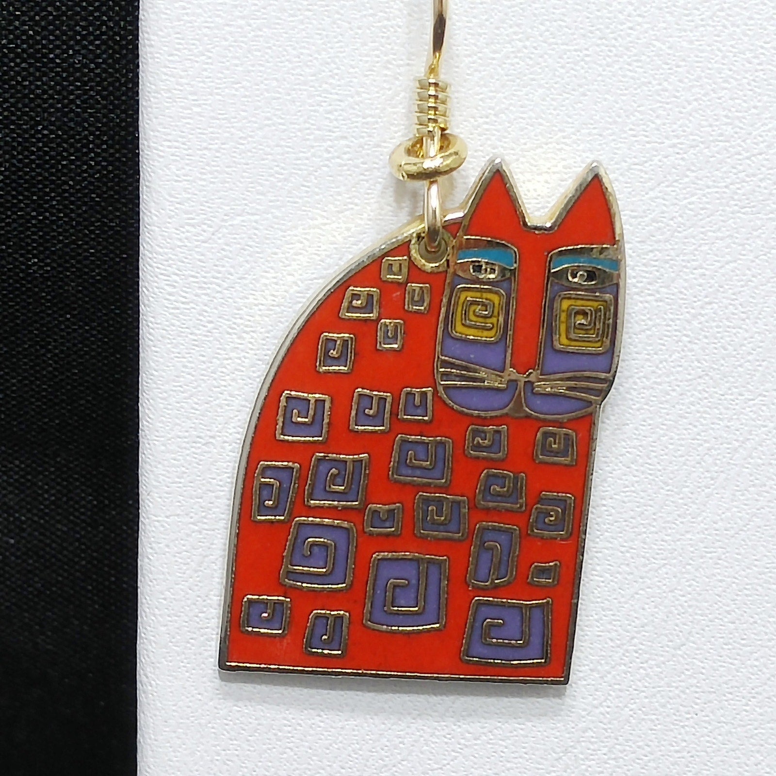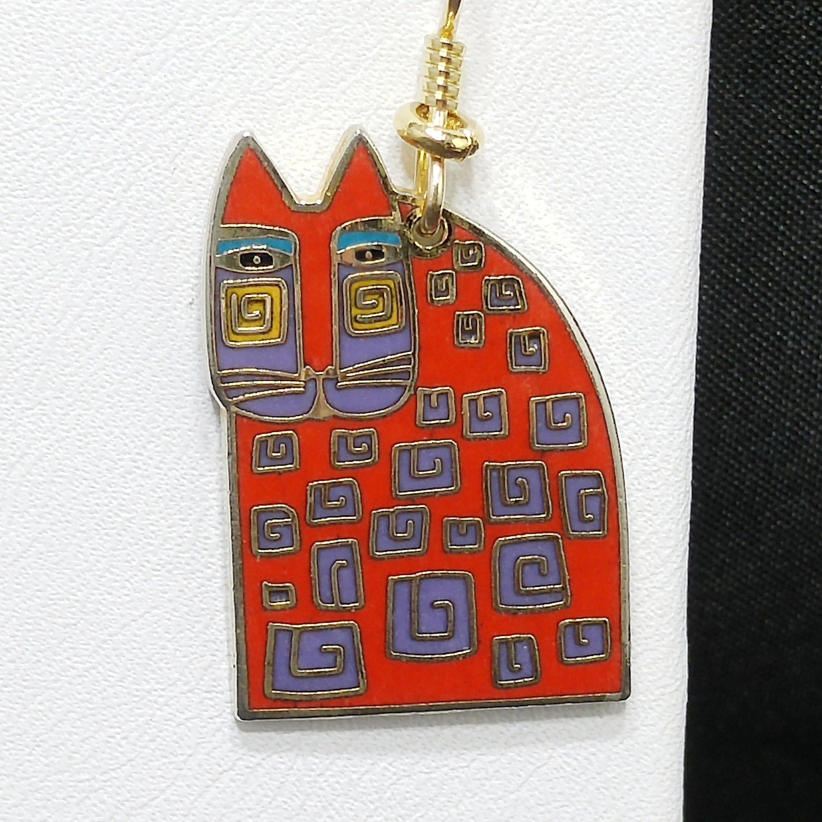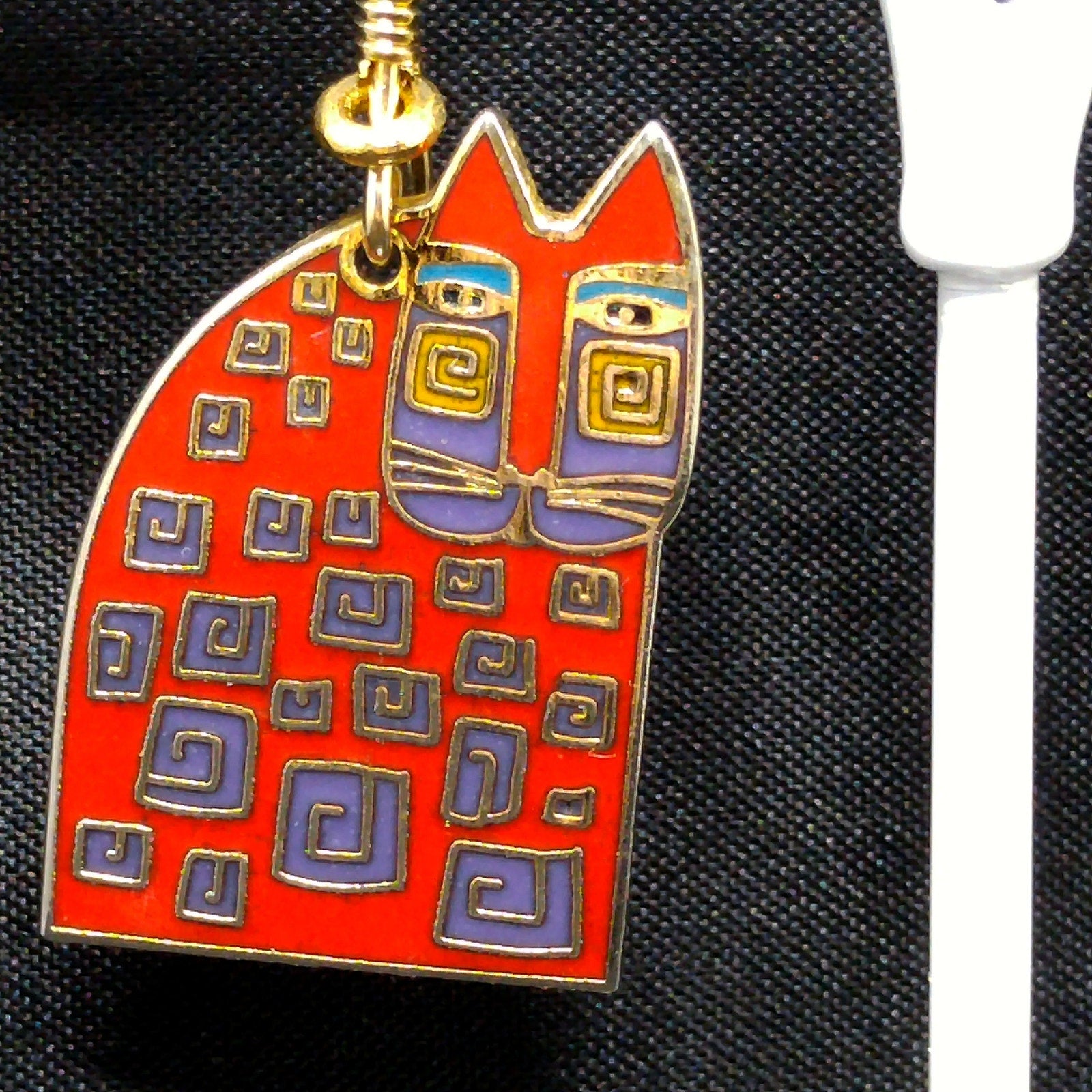 *Description: This is a great pair of Laurel Burch "Red Cat" dangle earrings from the 1980s. The gold plated cloisonné earrings have red enamel on most of the cat bodies with touches of purple and teal green. The ear wires are gold filled and slightly reshaped from originals. This is a great pair of earrings for the cat lovers in your life. This would be a great addition to your vintage jewelry collection or make a great vintage gift!