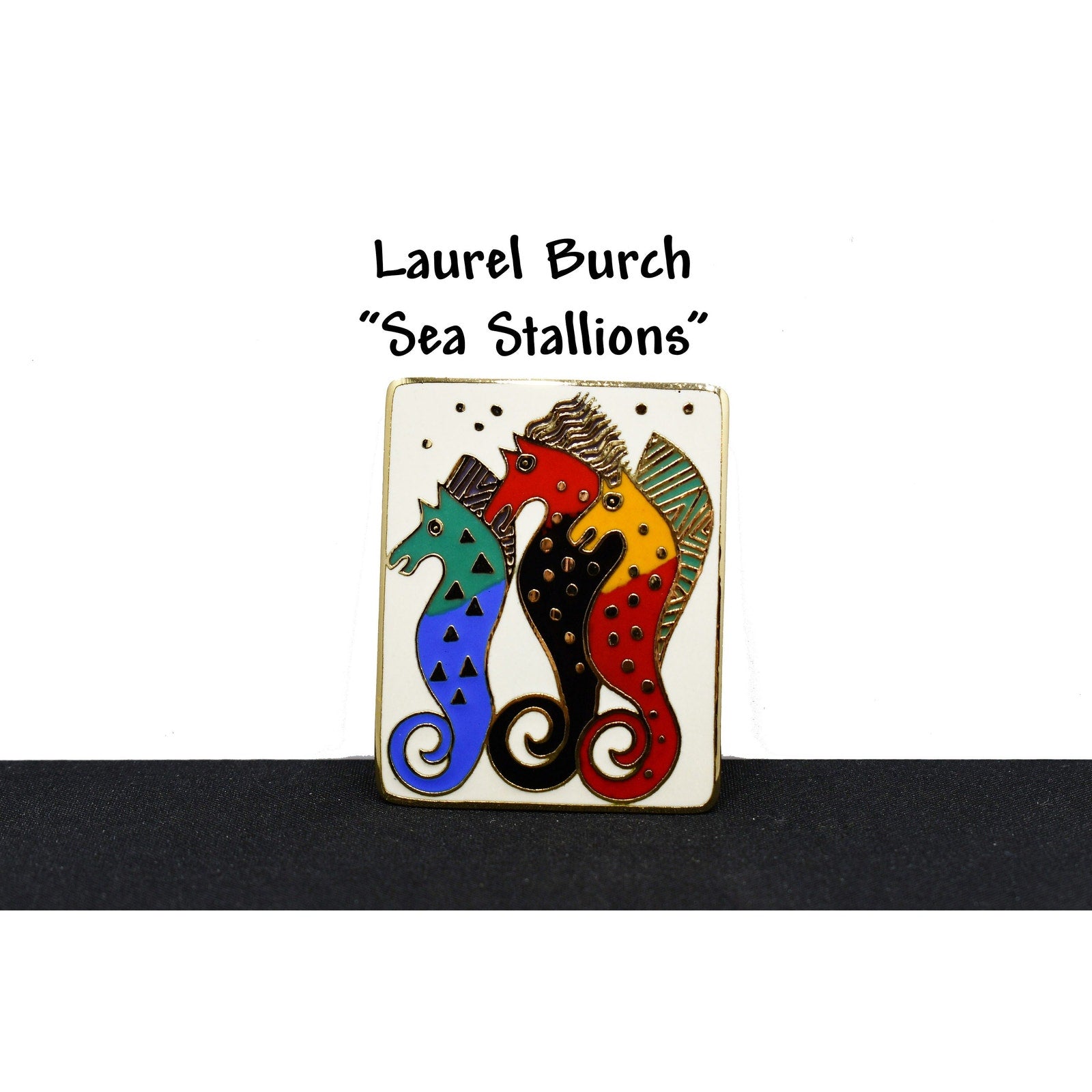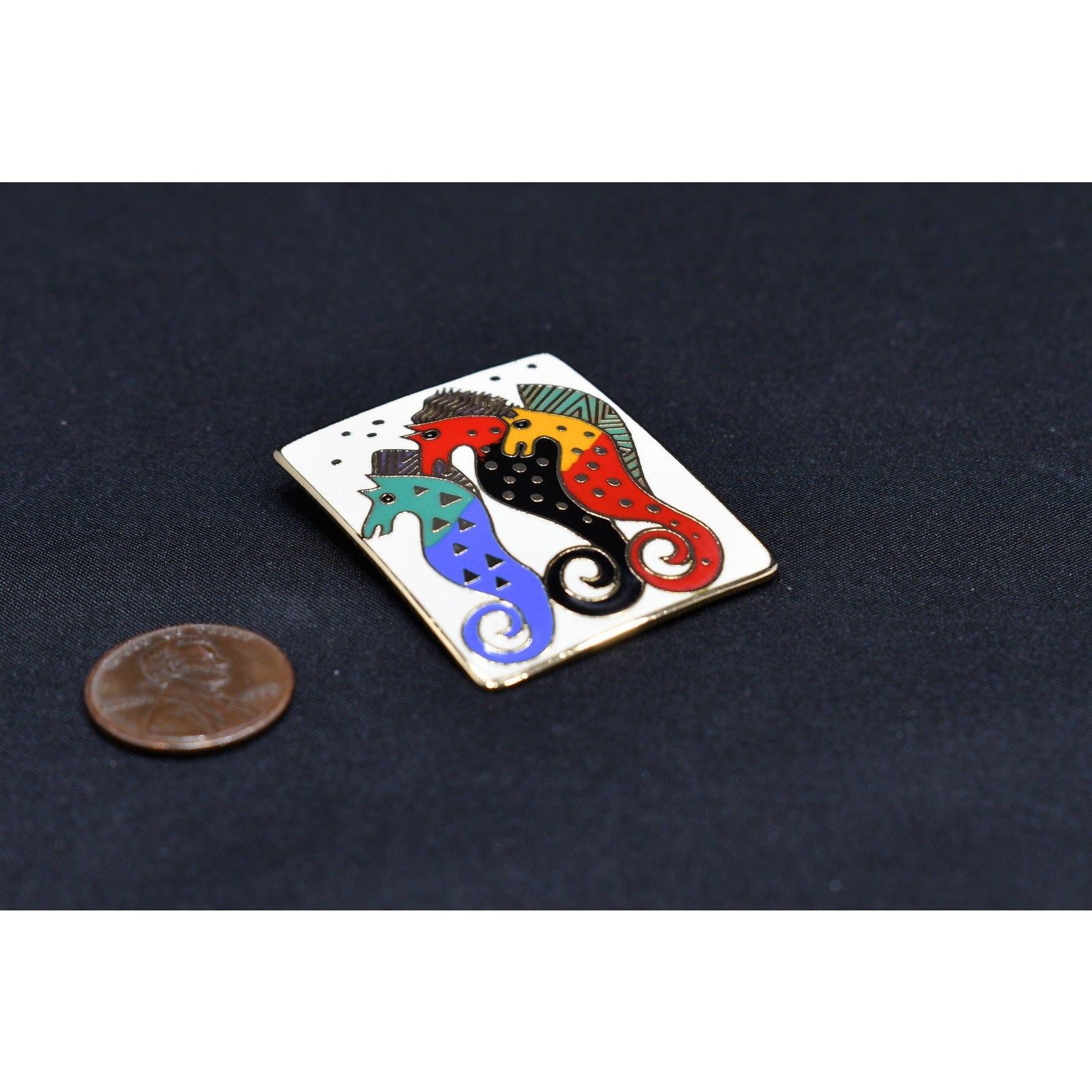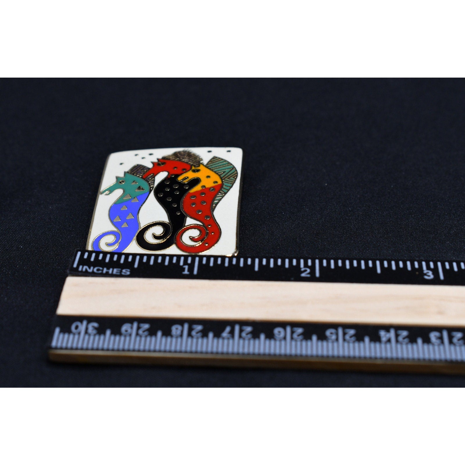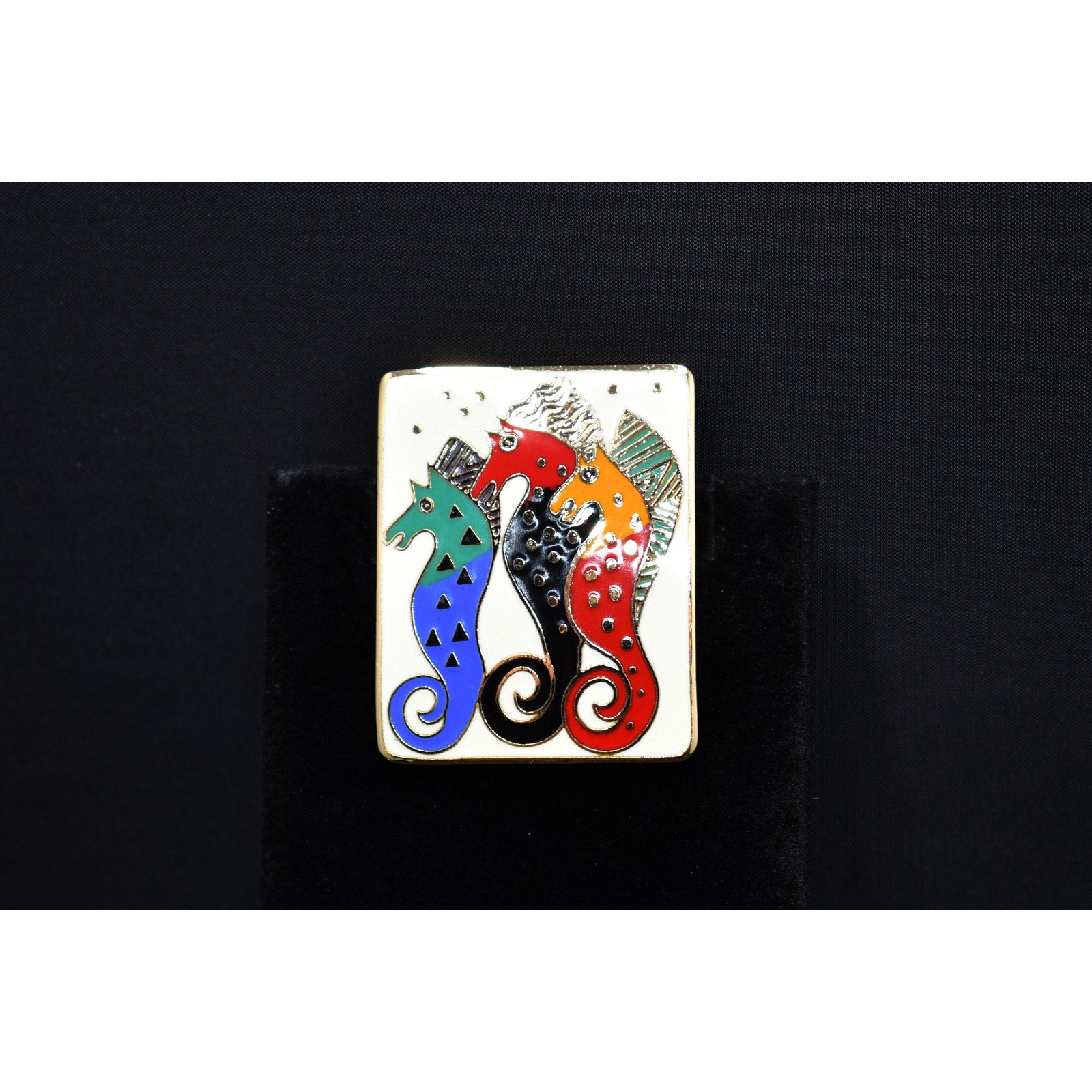 *Description: This is a beautiful Laurel Burch three colorful seahorses brooch entitled "Sea Stallions" from the 1980s. The gold plated cloisonne frame has a creamy white enamel background with gold bubbles. There are three seahorses side by side. One is teal and blue, the second is red and black, with the third seahorse in red and yellow. Each of the seahorses have uniquely designed accents. This is a great Laurel Burch design and would make a wonderful gift or a wonderful addition to your vintage jewelry collection.