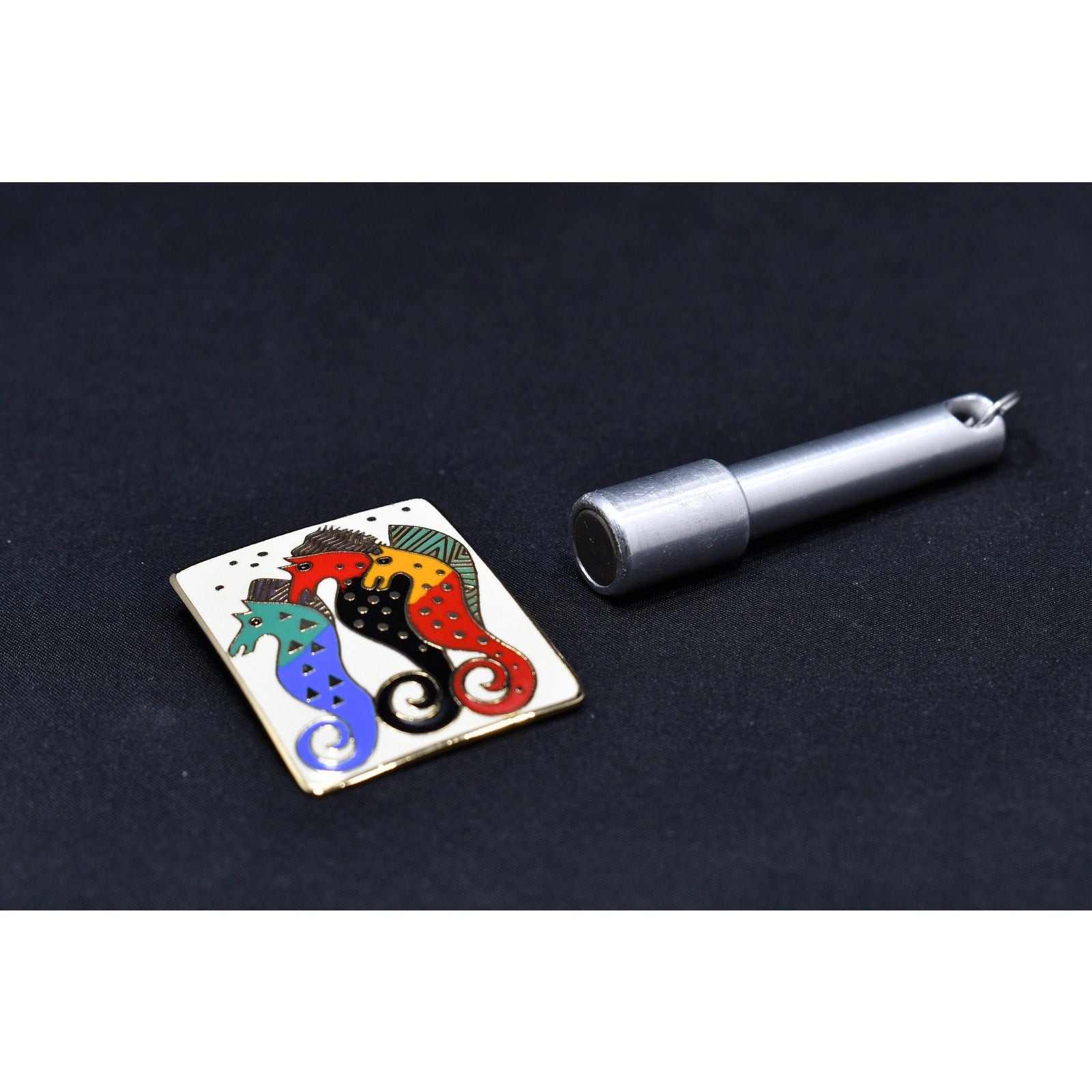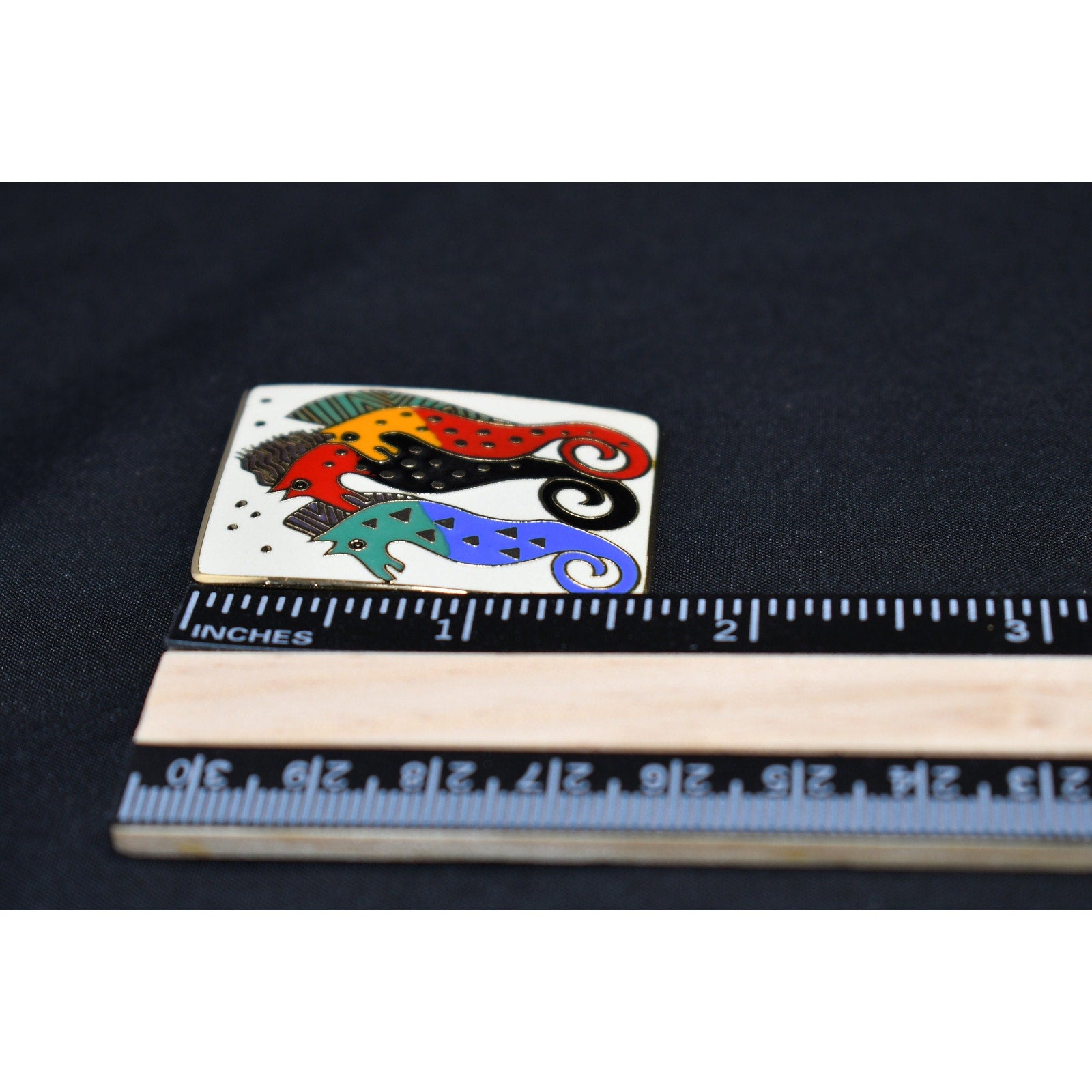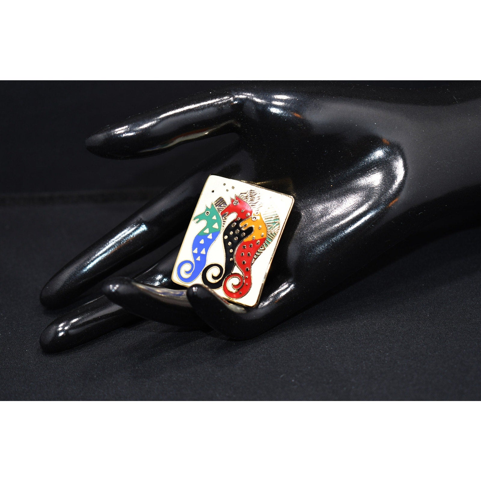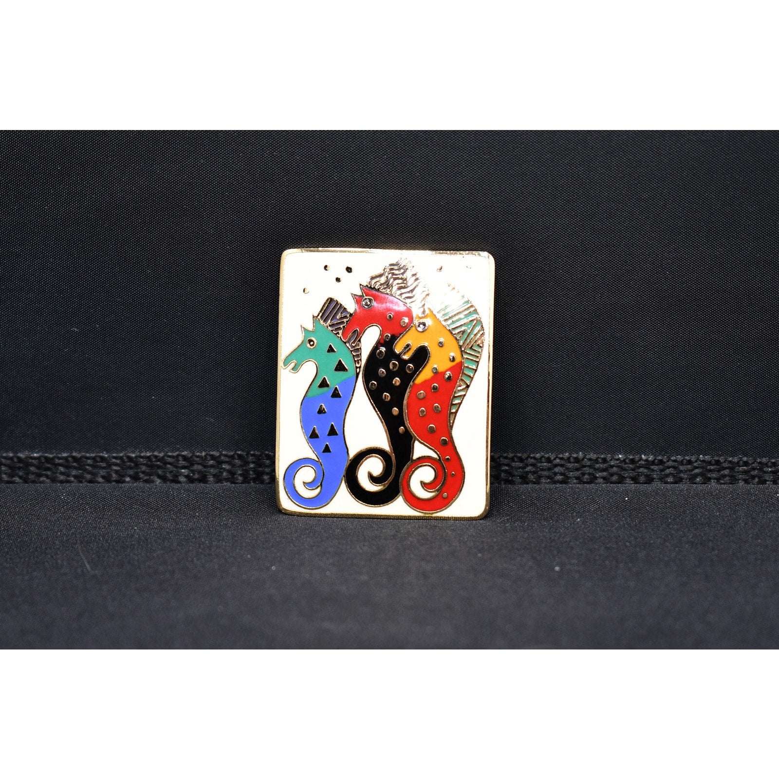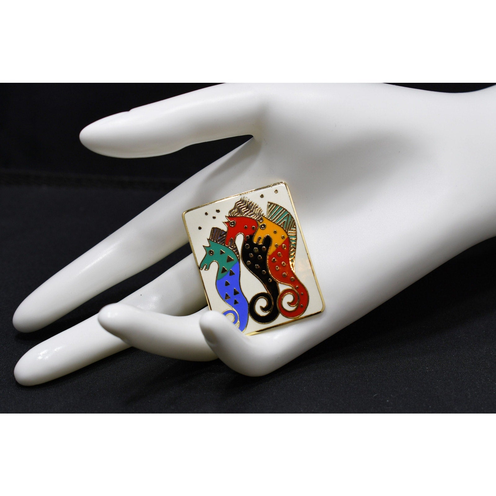 *Description: This is a beautiful Laurel Burch three colorful seahorses brooch entitled "Sea Stallions" from the 1980s. The gold plated cloisonne frame has a creamy white enamel background with gold bubbles. There are three seahorses side by side. One is teal and blue, the second is red and black, with the third seahorse in red and yellow. Each of the seahorses have uniquely designed accents. This is a great Laurel Burch design and would make a wonderful gift or a wonderful addition to your vintage jewelry collection.