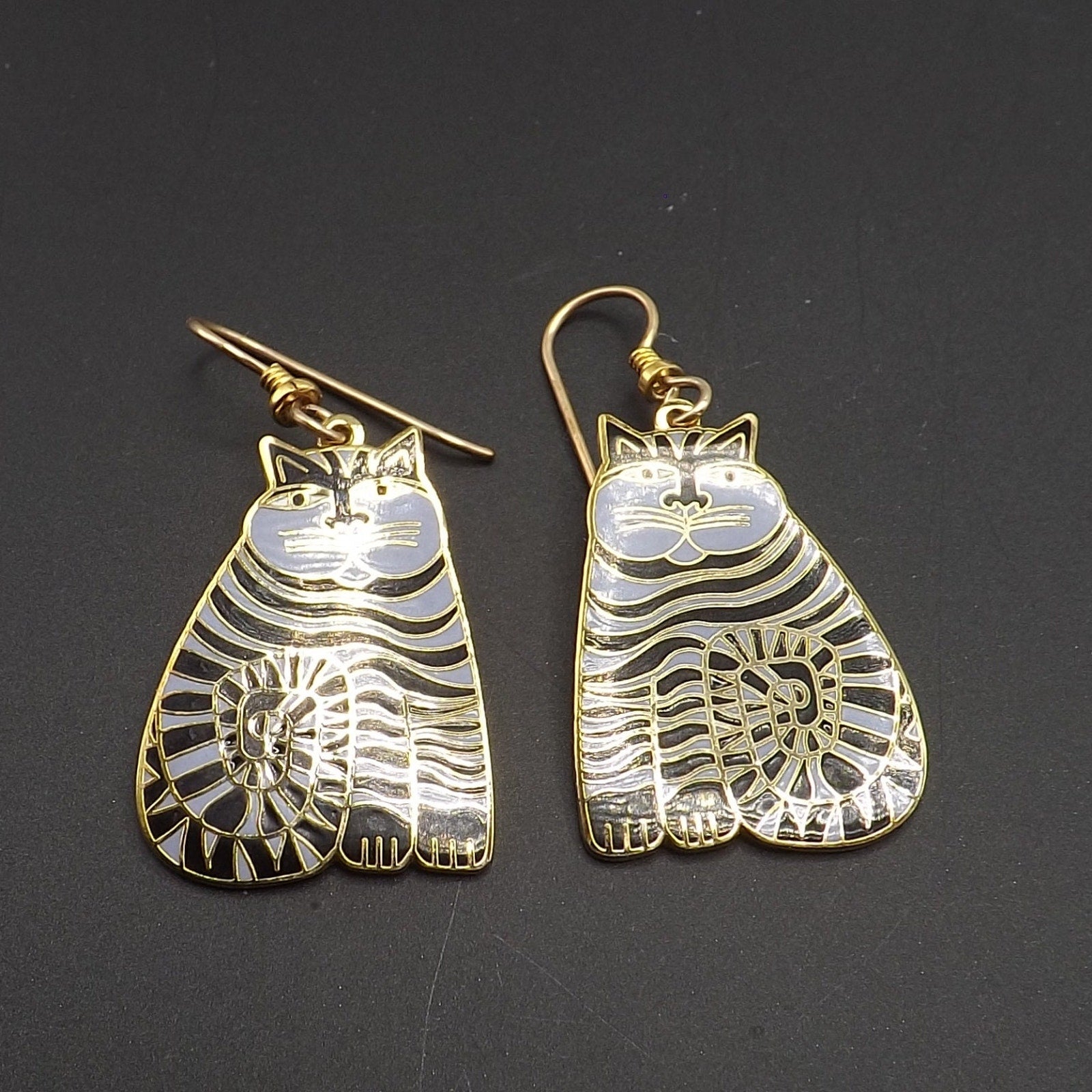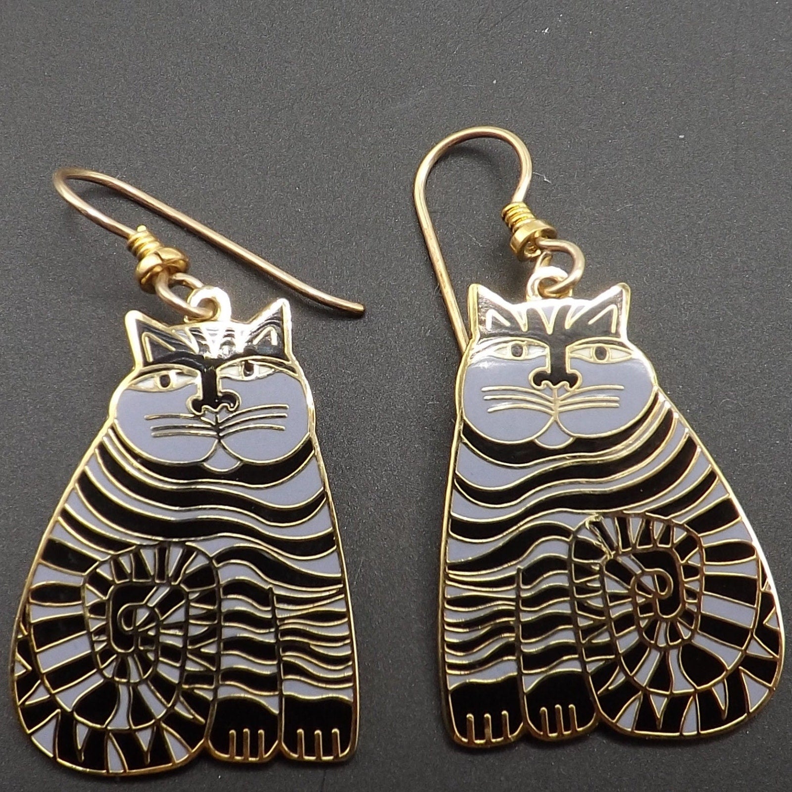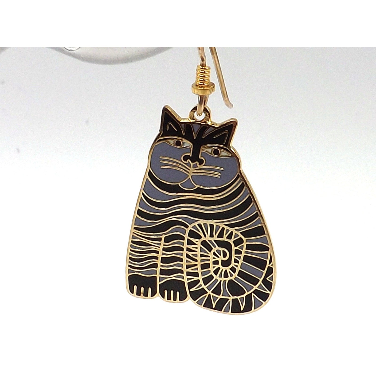 *Description: This is a beautiful vintage pair of Laurel Burch black and lavender gray striped cat earrings with gold cloisonné outlines entitled SHAMBALA. The ear wires are gold filled. The fabulous design is a signature Laurel Burch with her love of cats and animals. This great design is from the 1980s and uses the cloisonné technique with enamel which is outlined in gold plate. Laurel Burch was a fabulous artist who shared many of her designs through jewelry. This would be a great addition to your vintage jewelry collection or make a great vintage gift!