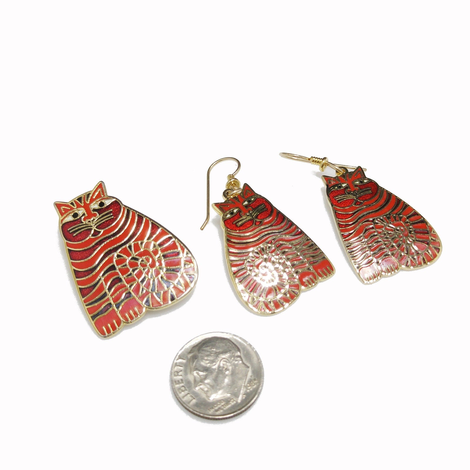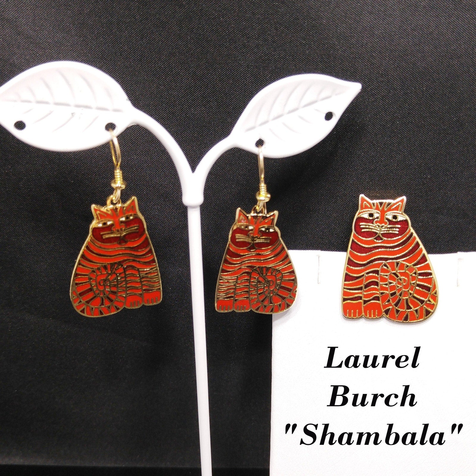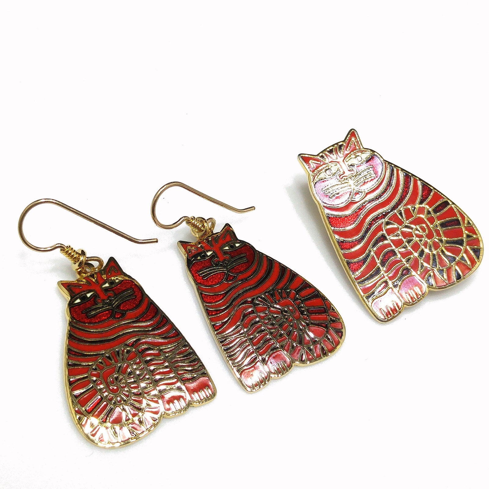 *Description: This is a great vintage jewelry set by Laurel Burch entitled "Shambala" and is a gold plated cloisonné brooch and earrings in the shape of cats from the 1980s. The cats are metallic red, black, and red enamel; all outlined in gold plate. The eyes also have a little white enamel. Each of the earrings and the brooch are in great condition and would be a perfect gift for a cat lover. The Shambala cat was one of Laurel Burch's original feline designs. This would be a great addition to your vintage jewelry collection or make a great vintage gift!