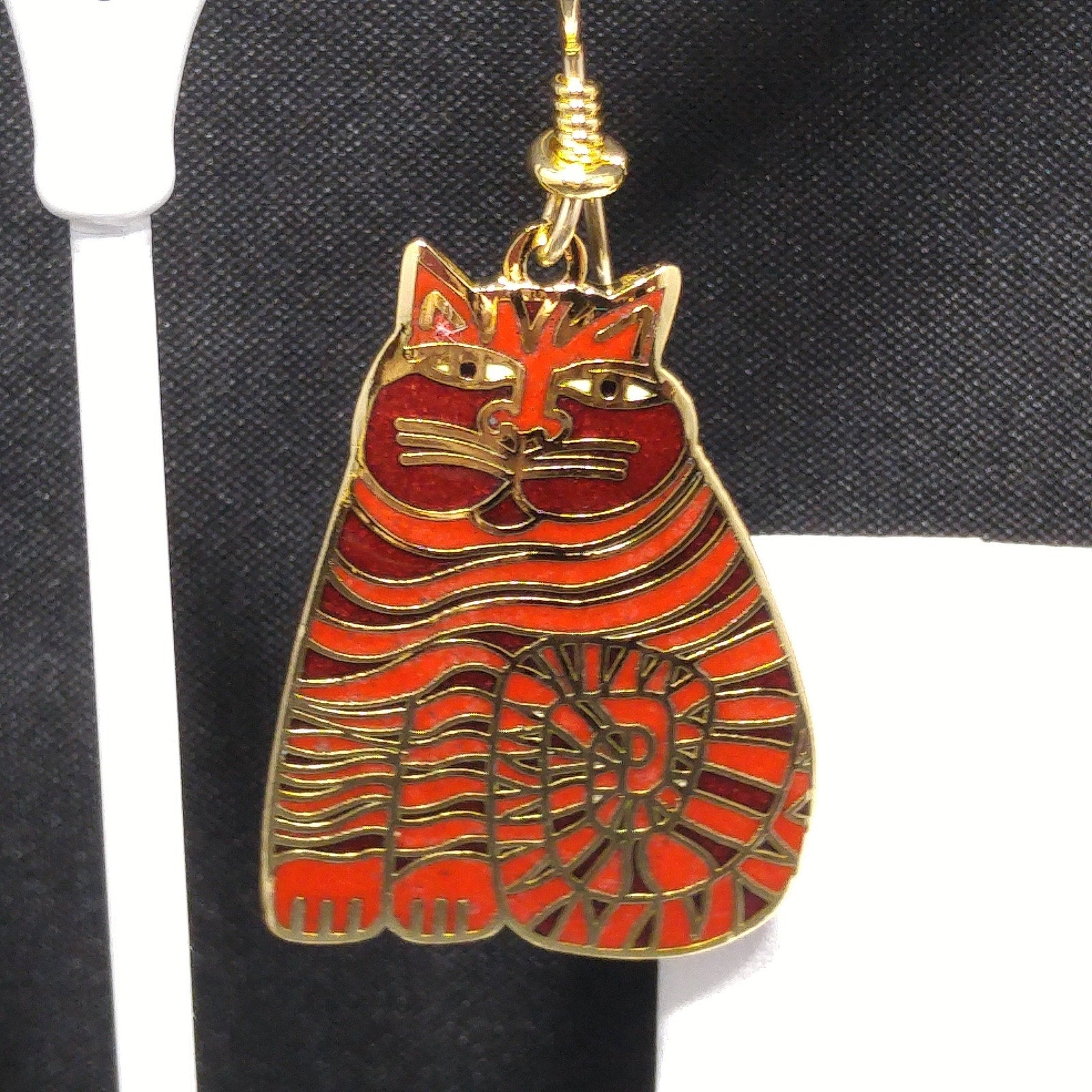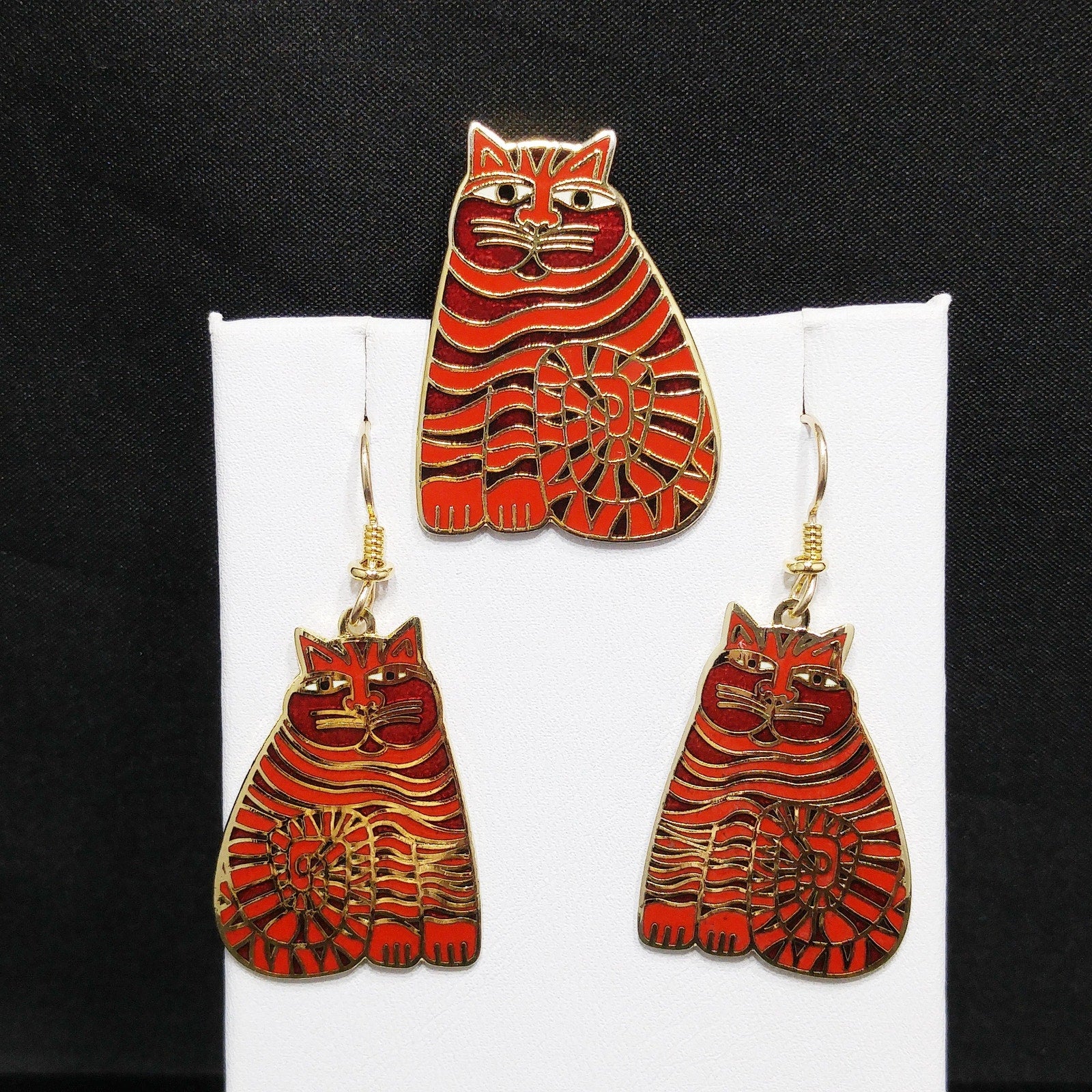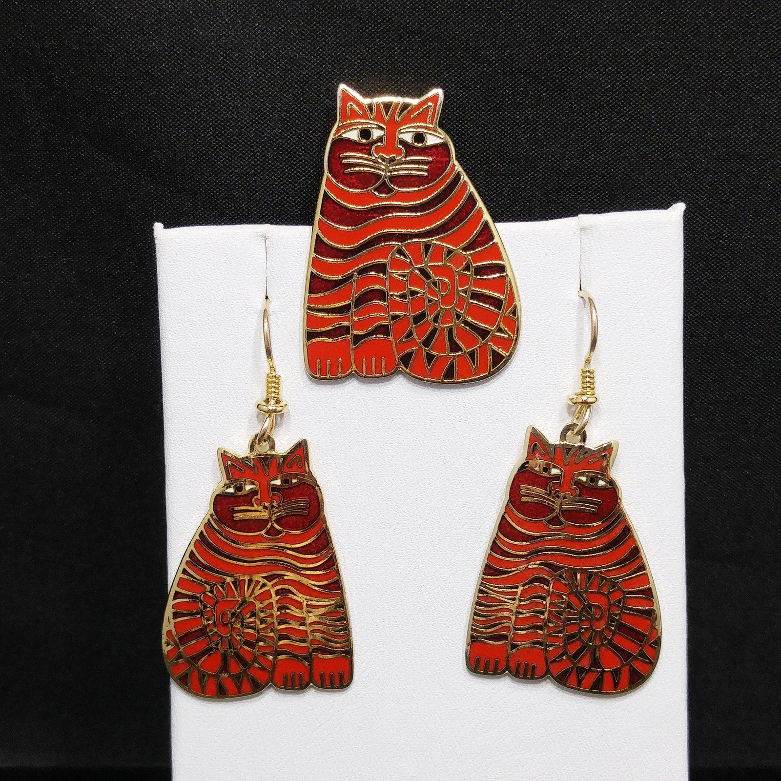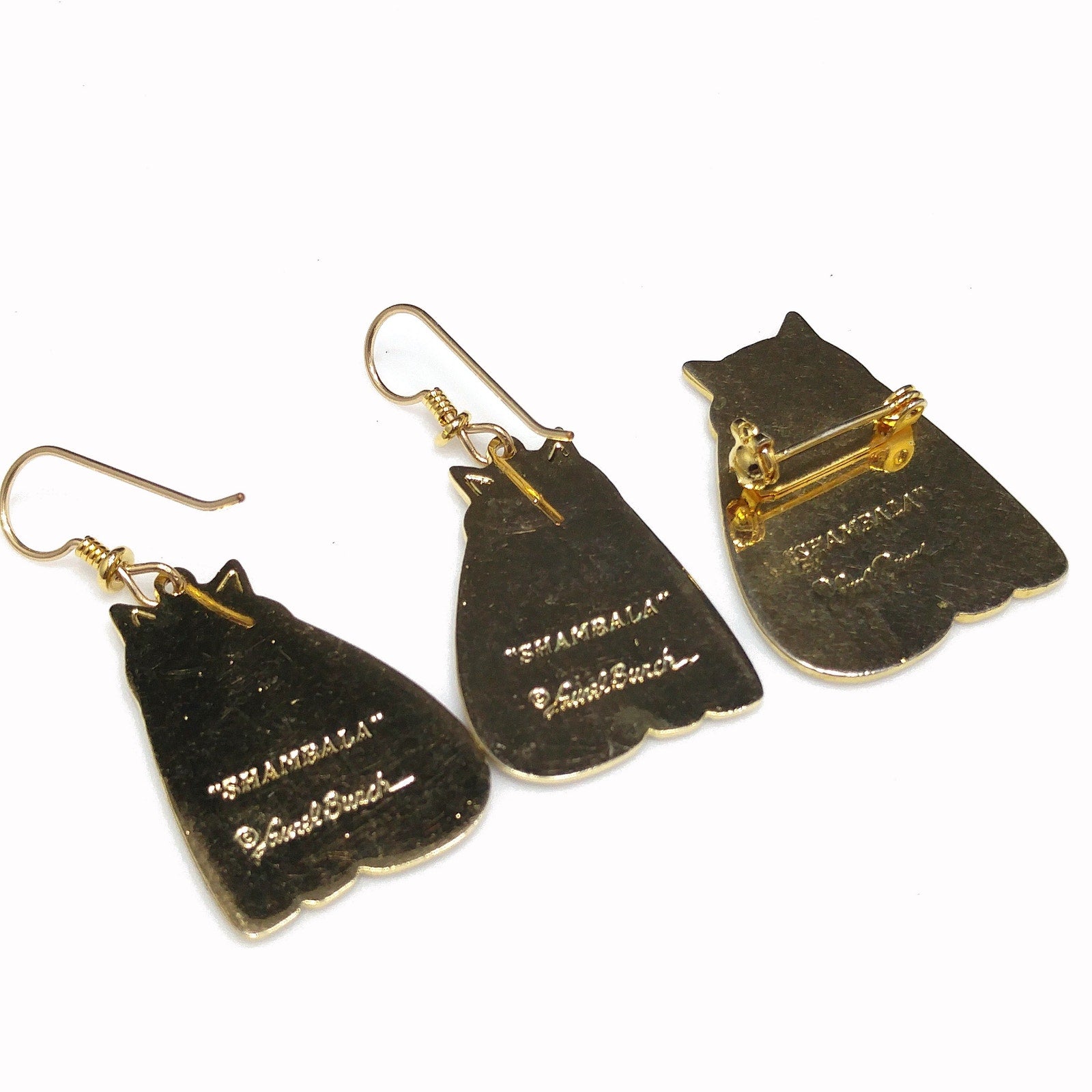 *Description: This is a great vintage jewelry set by Laurel Burch entitled "Shambala" and is a gold plated cloisonné brooch and earrings in the shape of cats from the 1980s. The cats are metallic red, black, and red enamel; all outlined in gold plate. The eyes also have a little white enamel. Each of the earrings and the brooch are in great condition and would be a perfect gift for a cat lover. The Shambala cat was one of Laurel Burch's original feline designs. This would be a great addition to your vintage jewelry collection or make a great vintage gift!