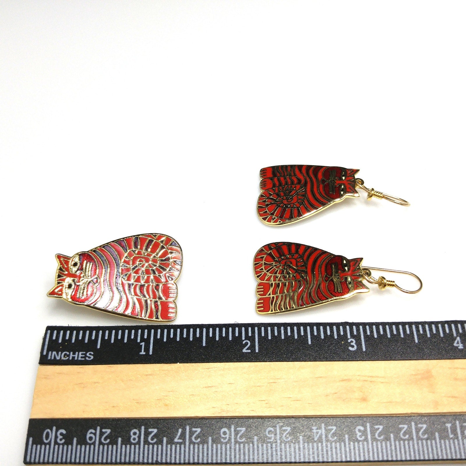 Laurel Burch "Shambala" Red Cat Brooch & Earrings, Gold Plated Cloisonné Enamel, 1980s Vintage Jewelry